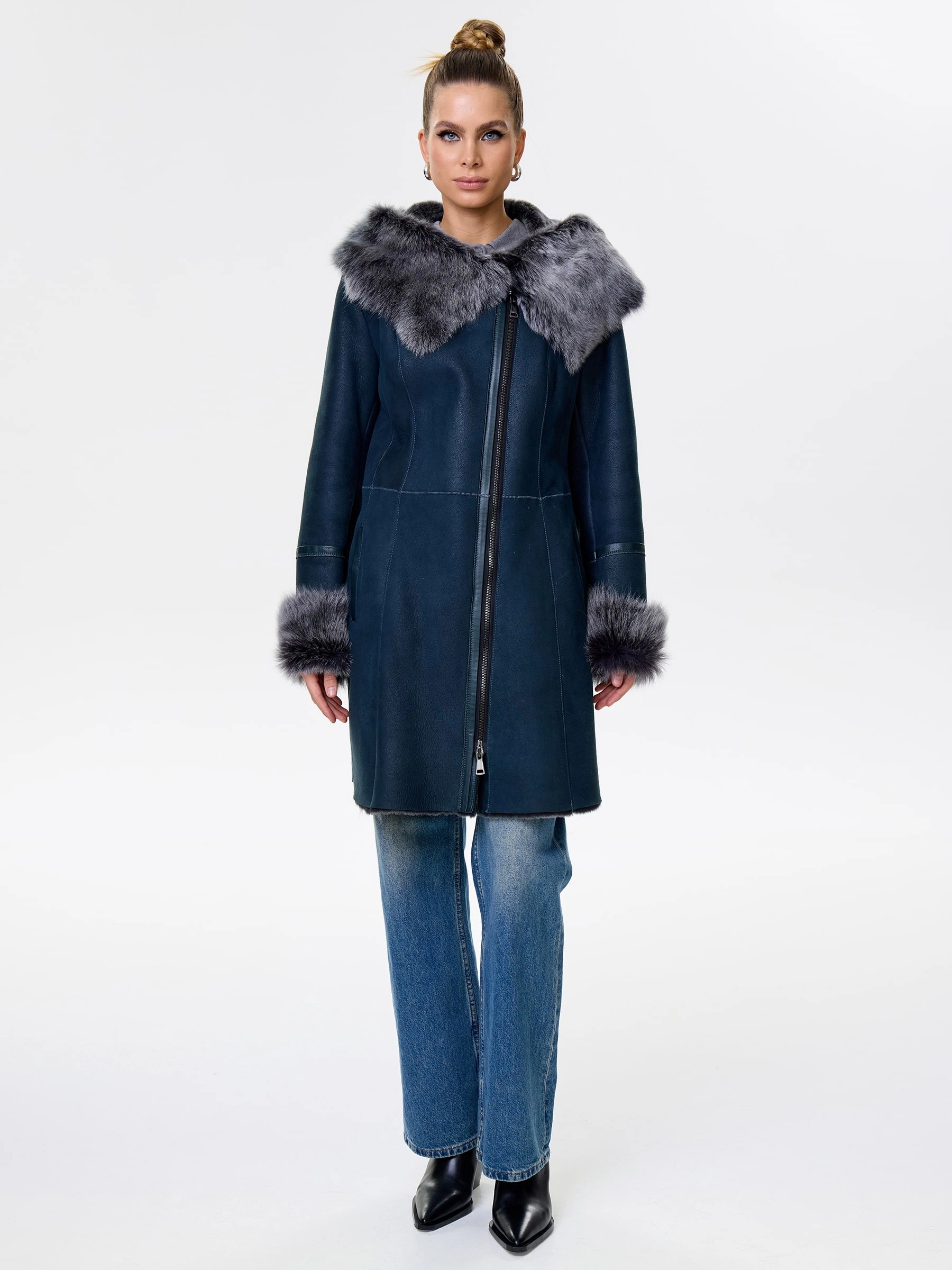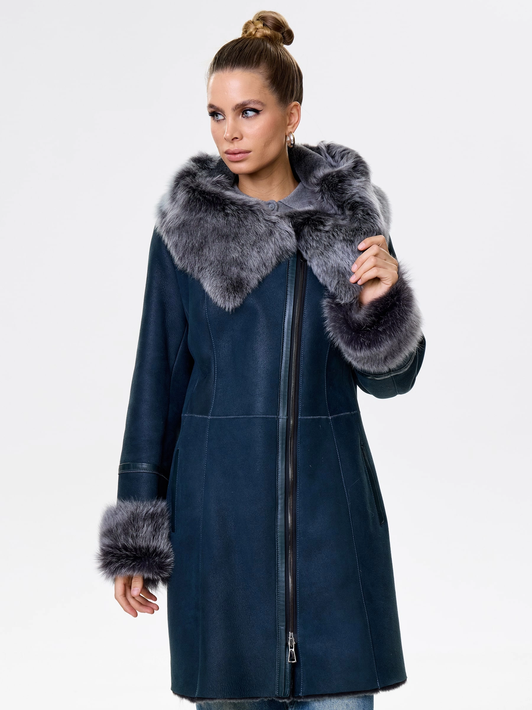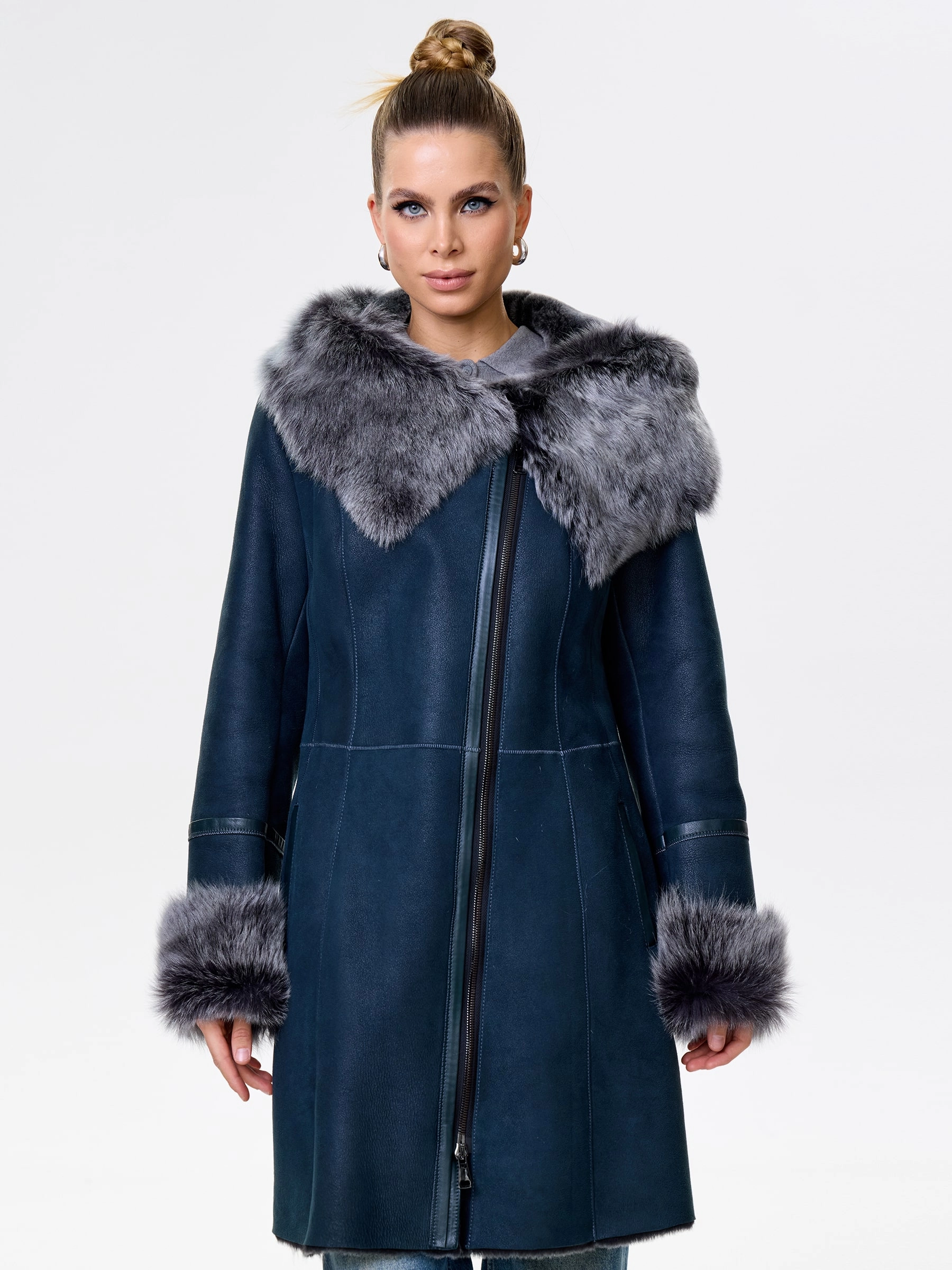 Товар женская дубленка косуха с капюшоном из тосканы 283, синяя, размер 52, артикул 61562 выполнен из овчина "мерино" с застежкой молния. Рассчитан на сезон: осень-зима. Длина изделия 90 см, силуэт полуприлегающий.