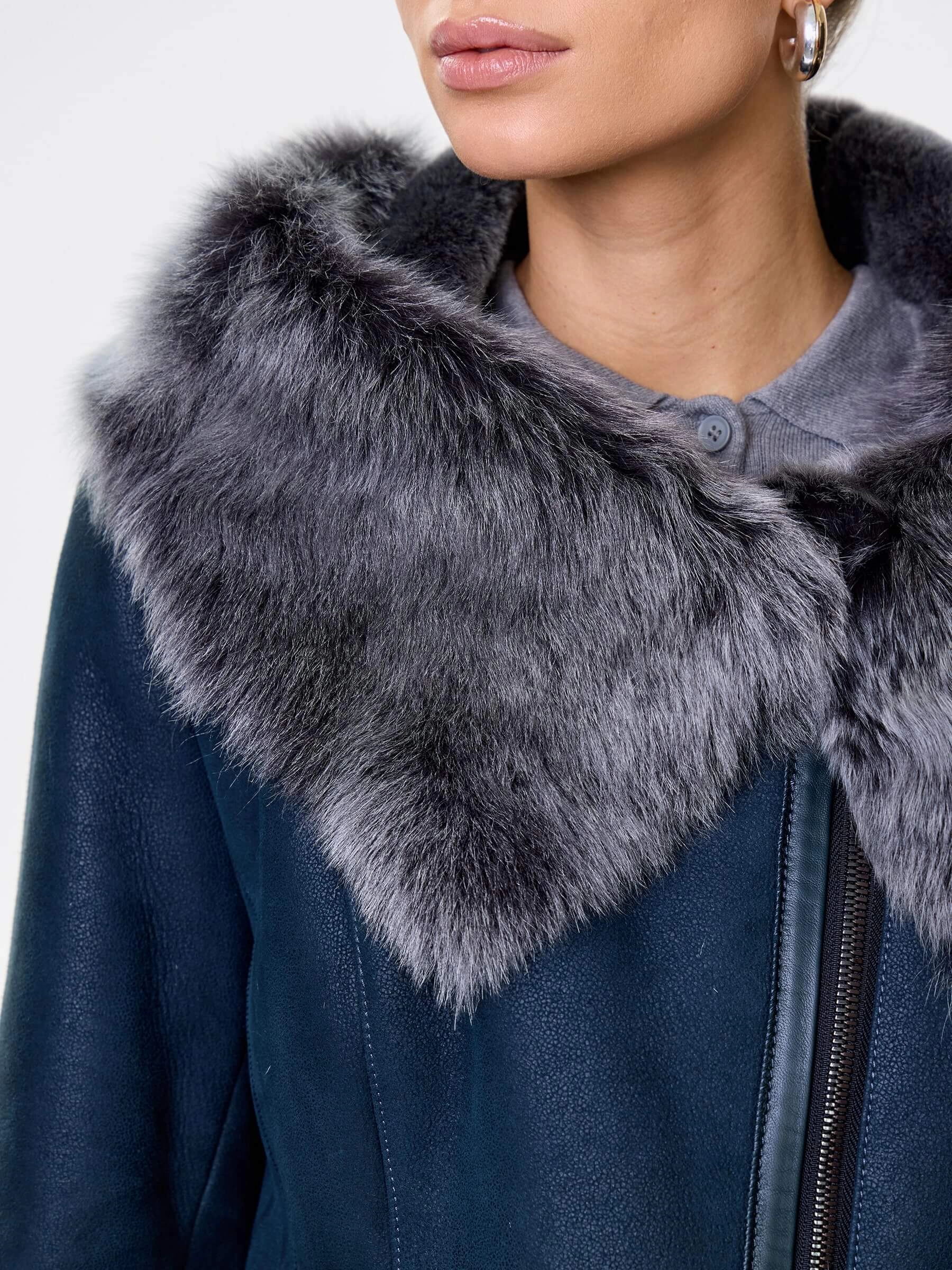 Женская дубленка косуха с капюшоном из тосканы 283, синяя, размер 52, артикул 61562