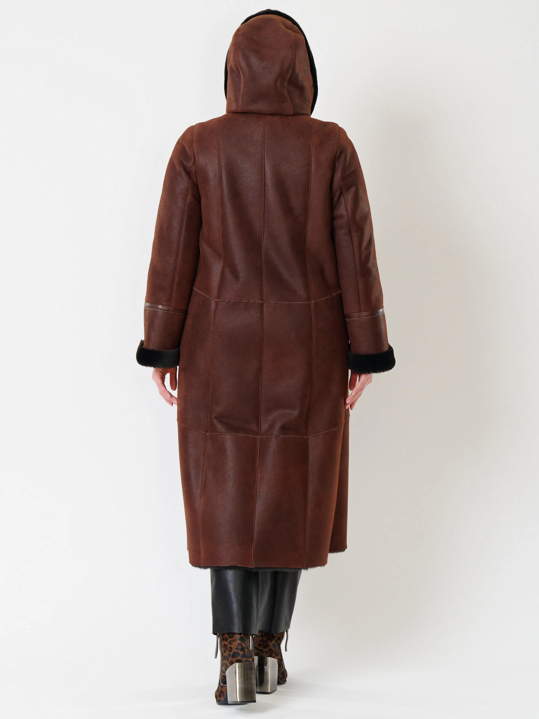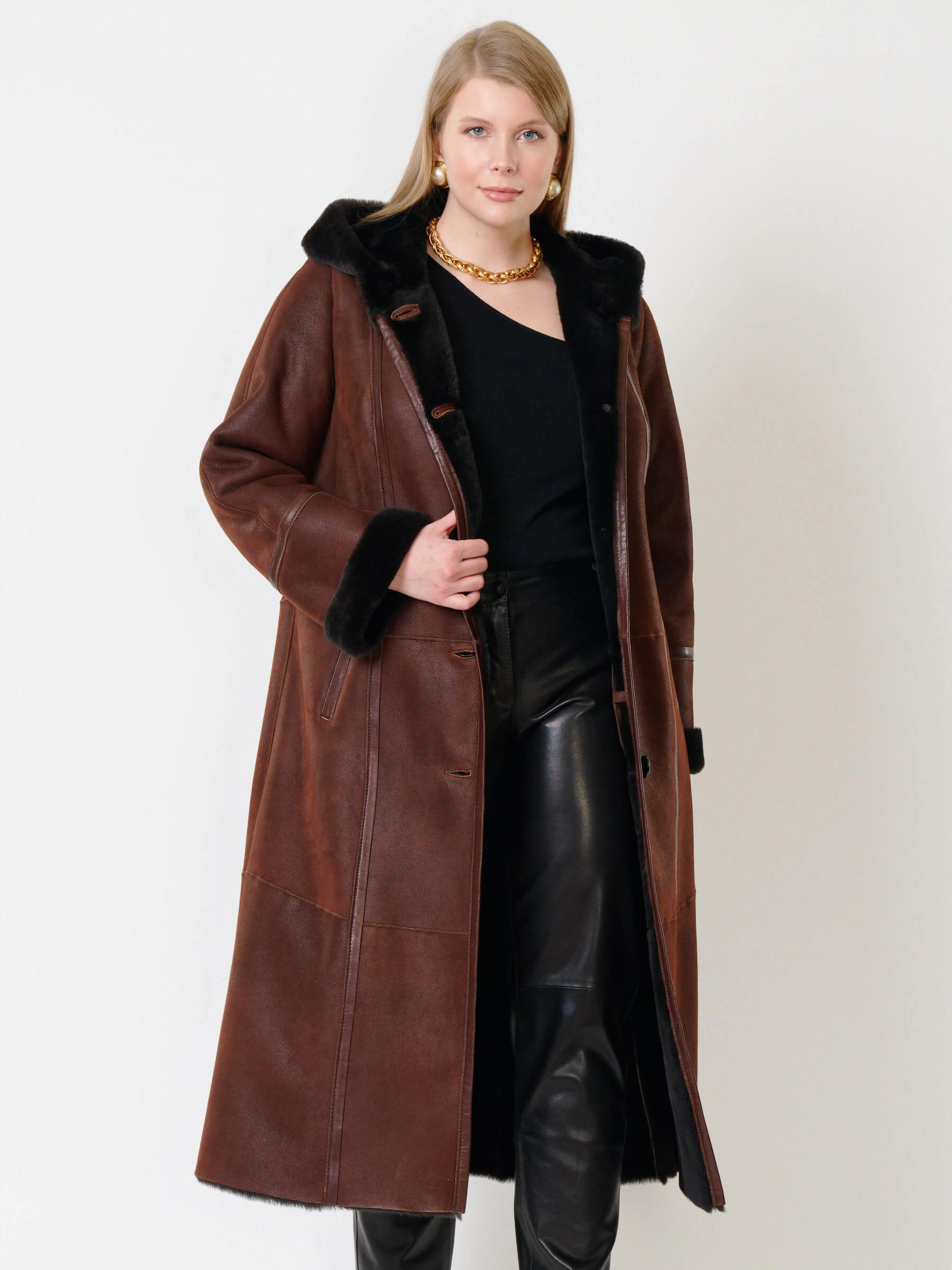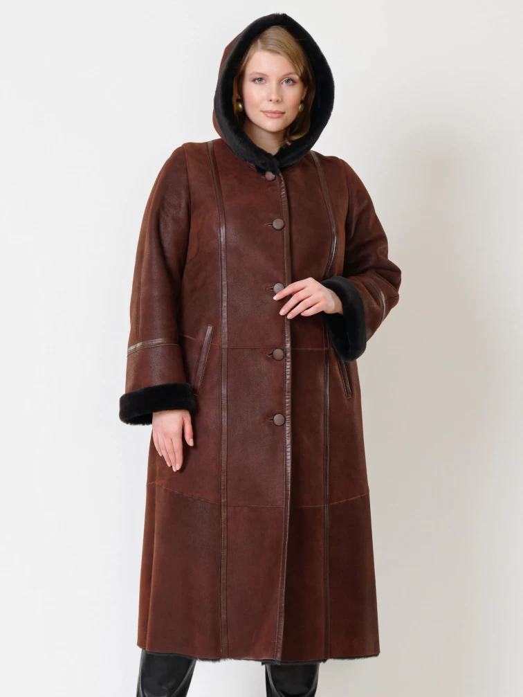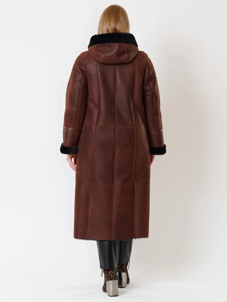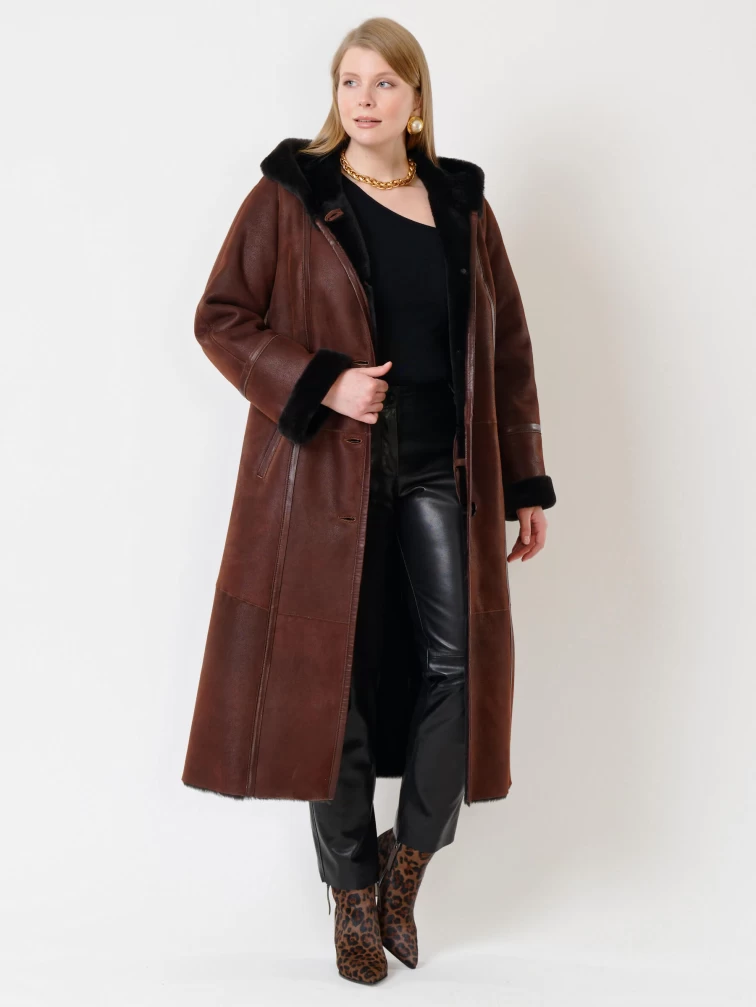 Классическая длинная женская дубленка с капюшоном 285, виски, размер 48, артикул 61180