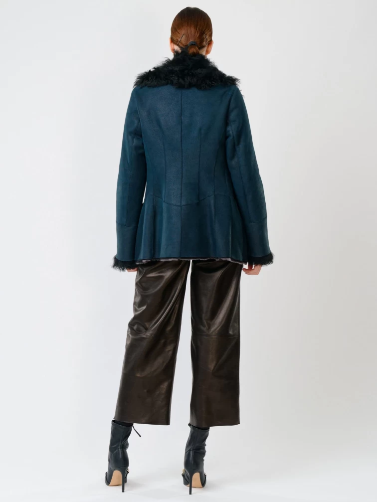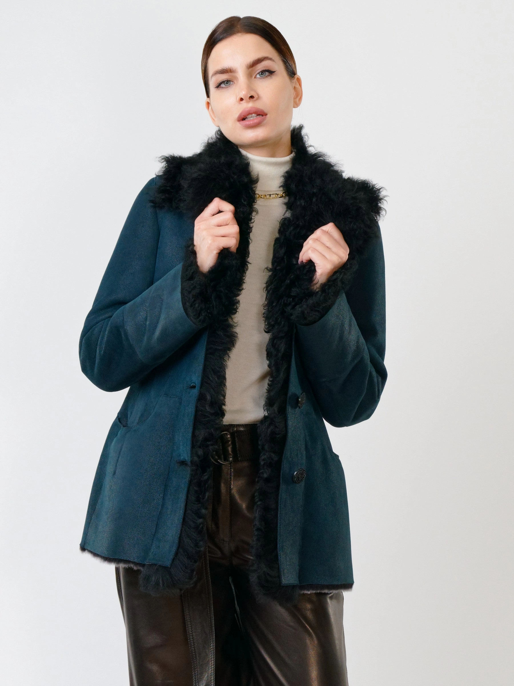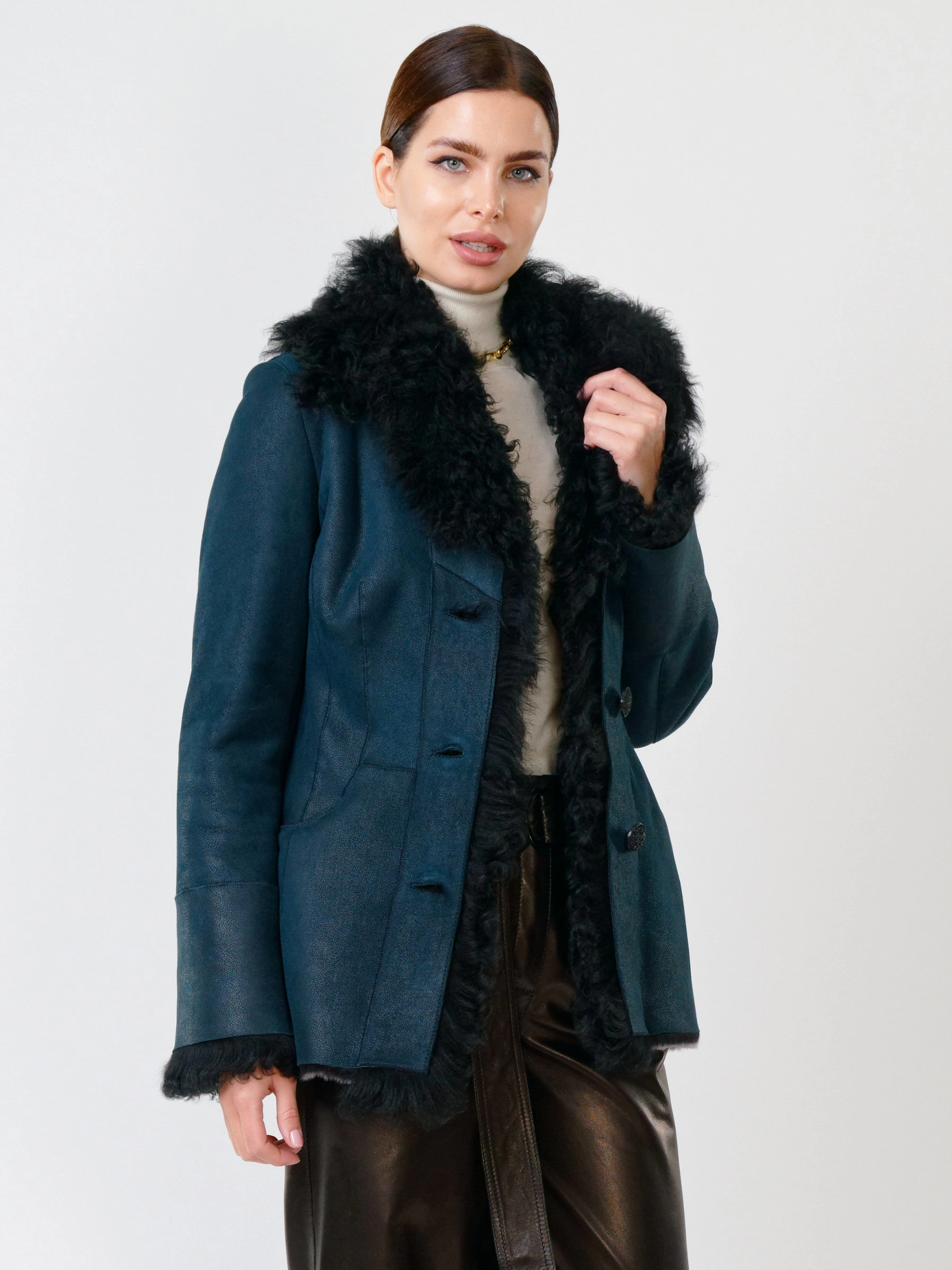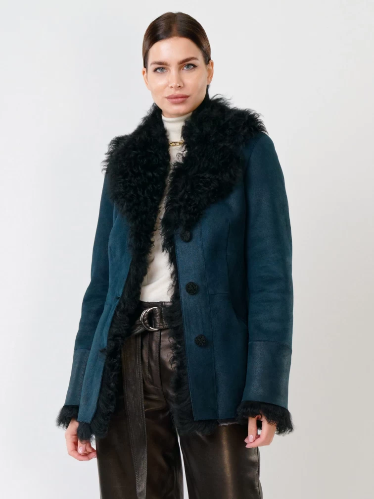 Товар короткая женская дубленка с овчиной тиградо 289, синяя, размер 42, артикул 61780 выполнен из овчина "мерино" с застежкой пуговицы. Рассчитан на сезон: осень-зима. Длина изделия 70 см, силуэт полуприлегающий.