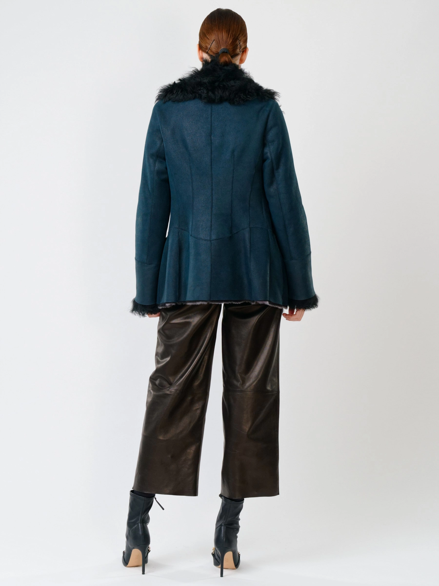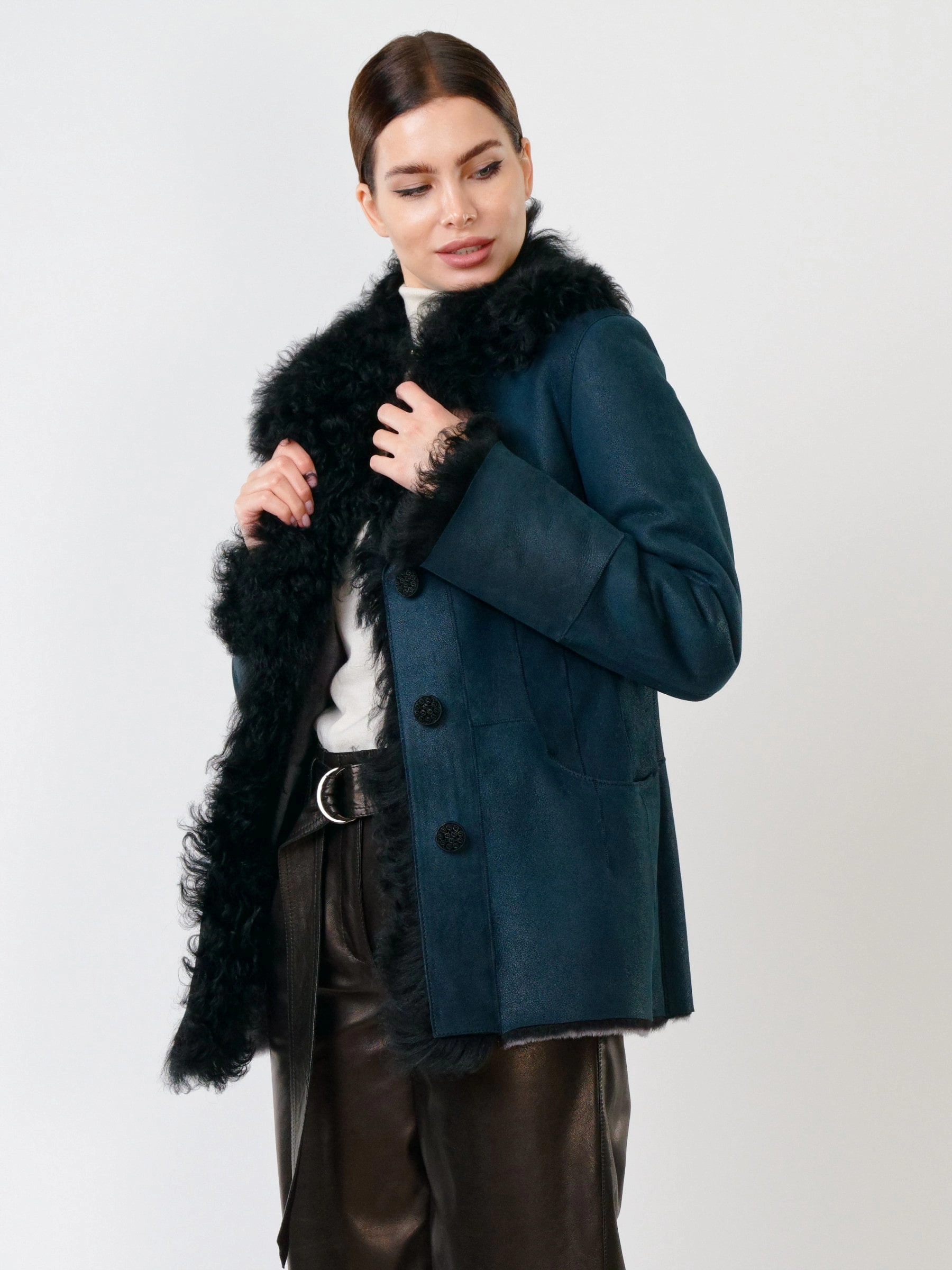 Короткая женская дубленка с овчиной тиградо 289, синяя, размер 42, артикул 61780