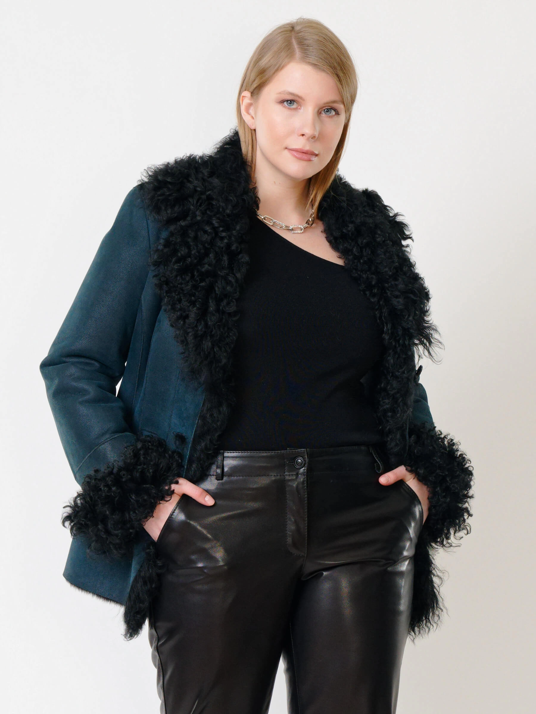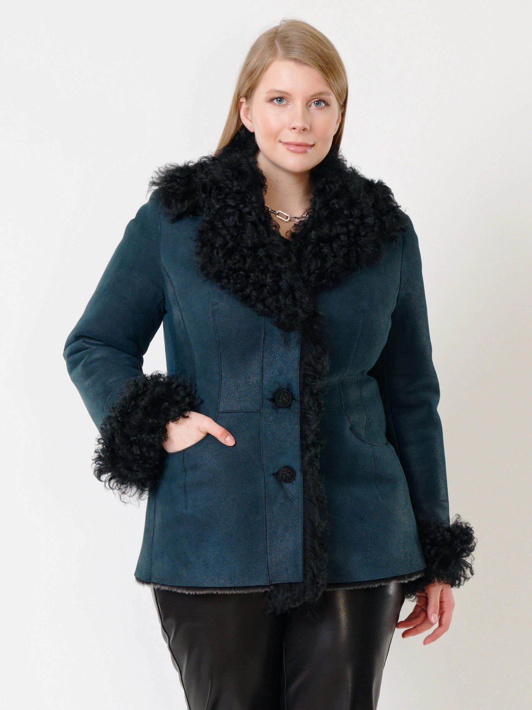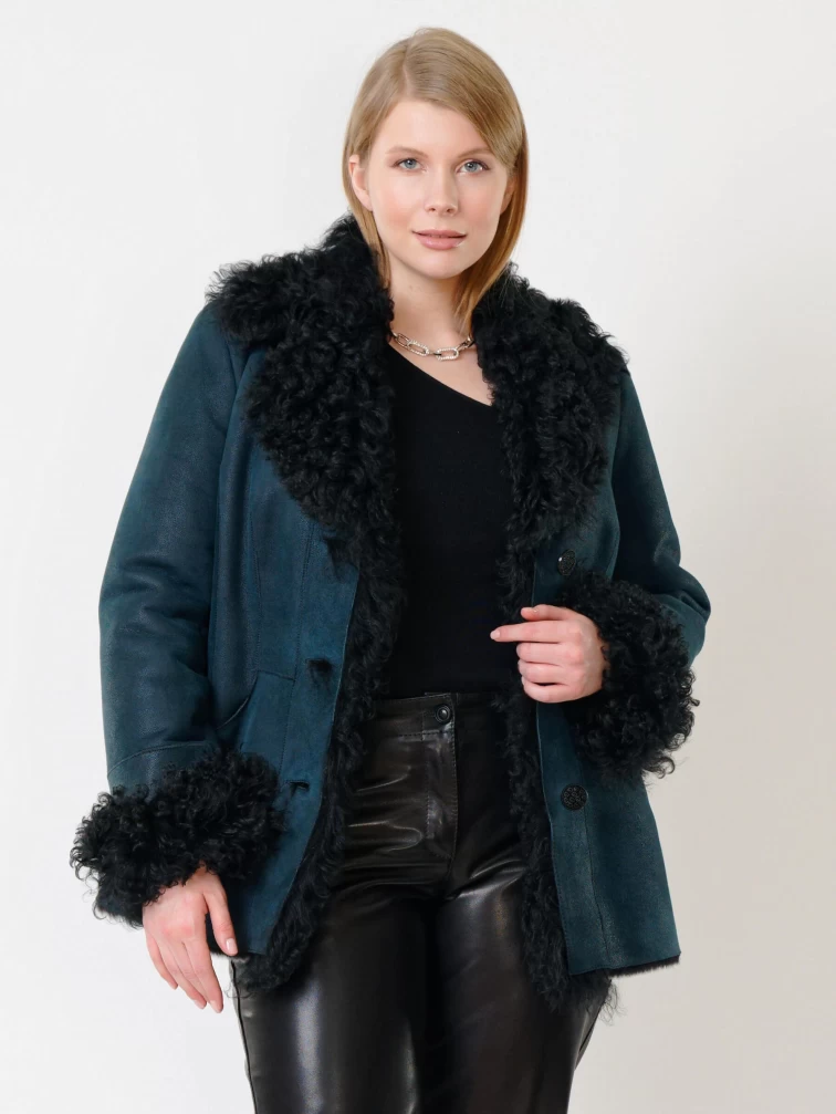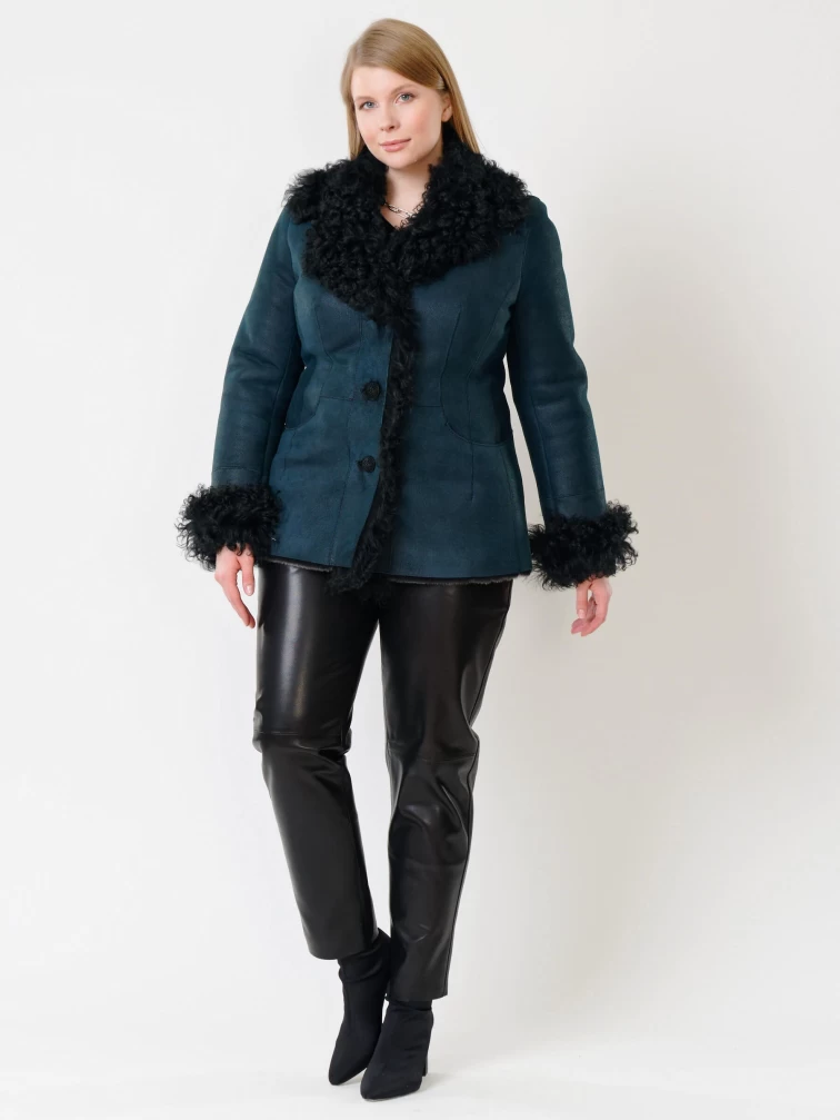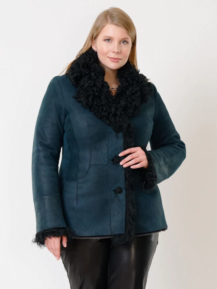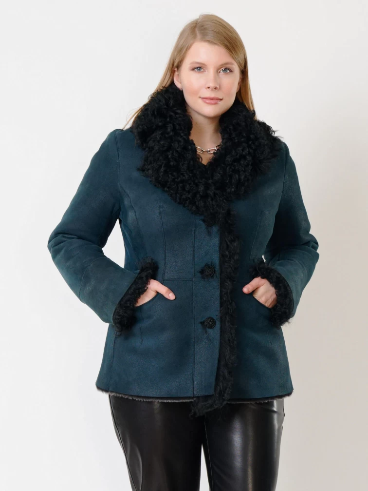 Товар короткая женская дубленка с овчиной тиградо 289, синяя, размер 42, артикул 62032 выполнен из овчина "мерино" с застежкой пуговицы. Рассчитан на сезон: осень-зима. Длина изделия 70 см, силуэт полуприлегающий.
