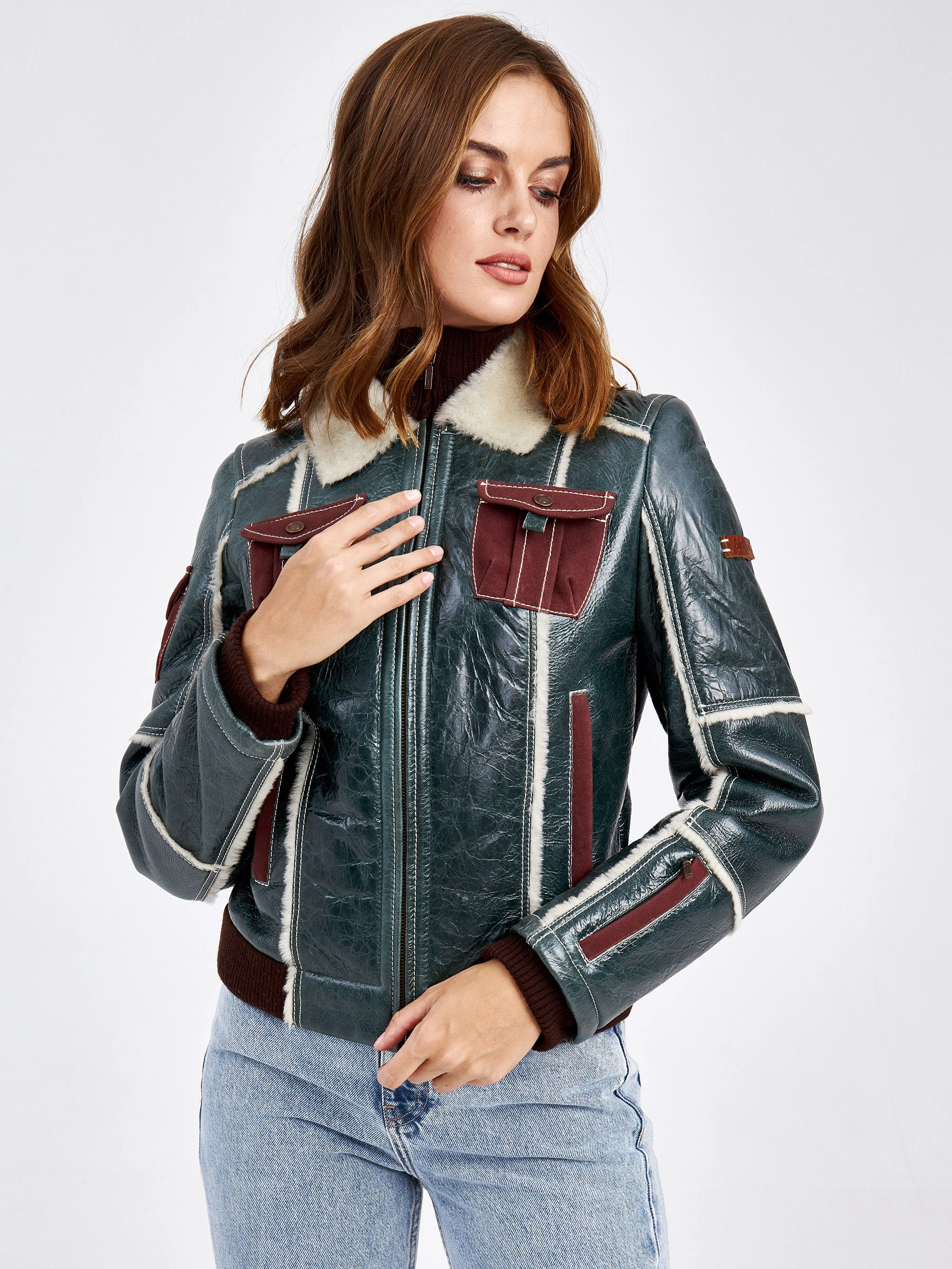 Спортивная короткая женская дубленка бомбер СМ-2, зеленая, размер 42, артикул 62550