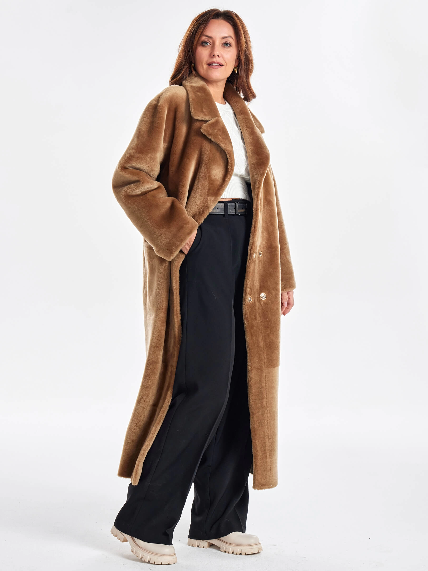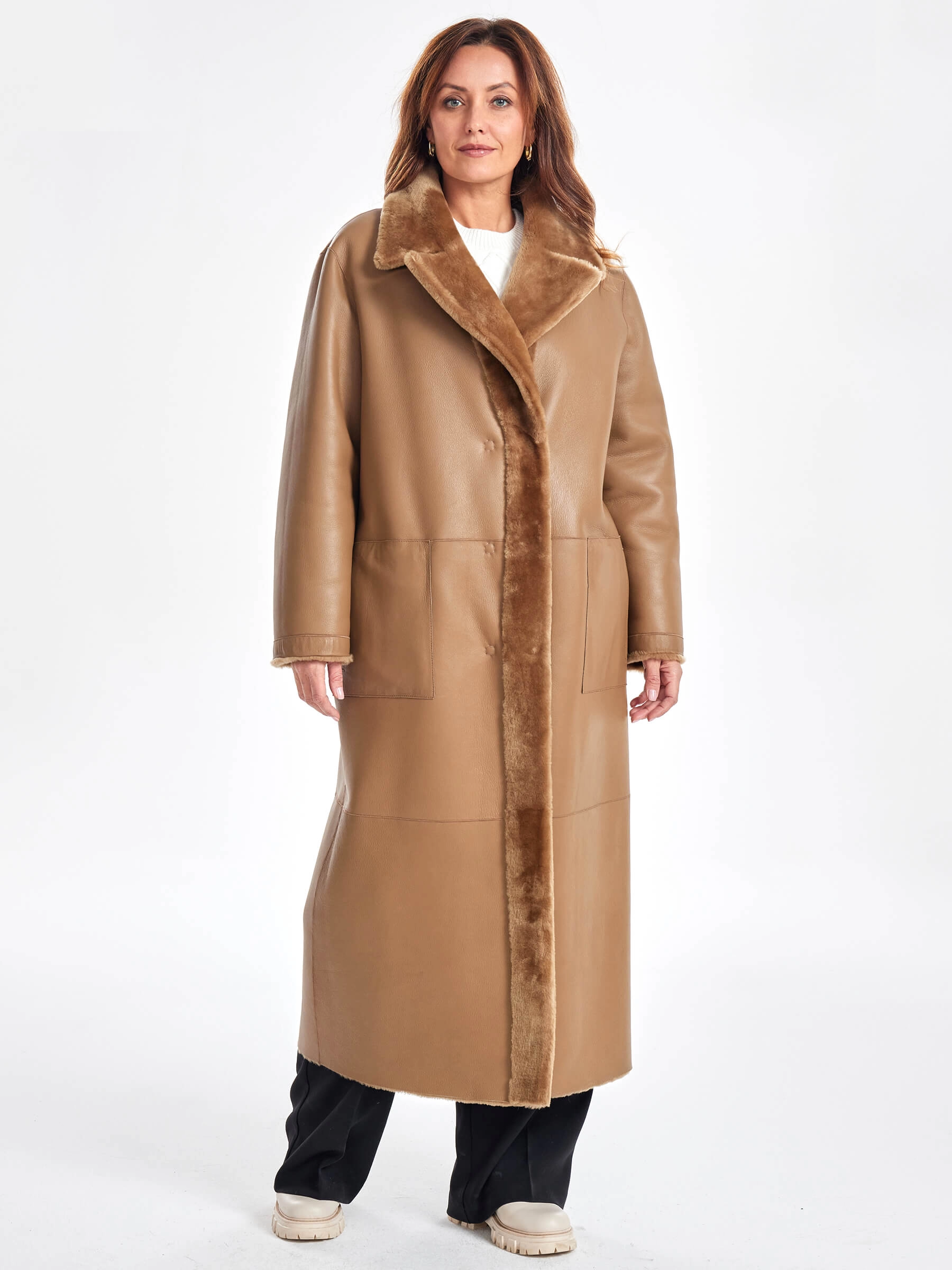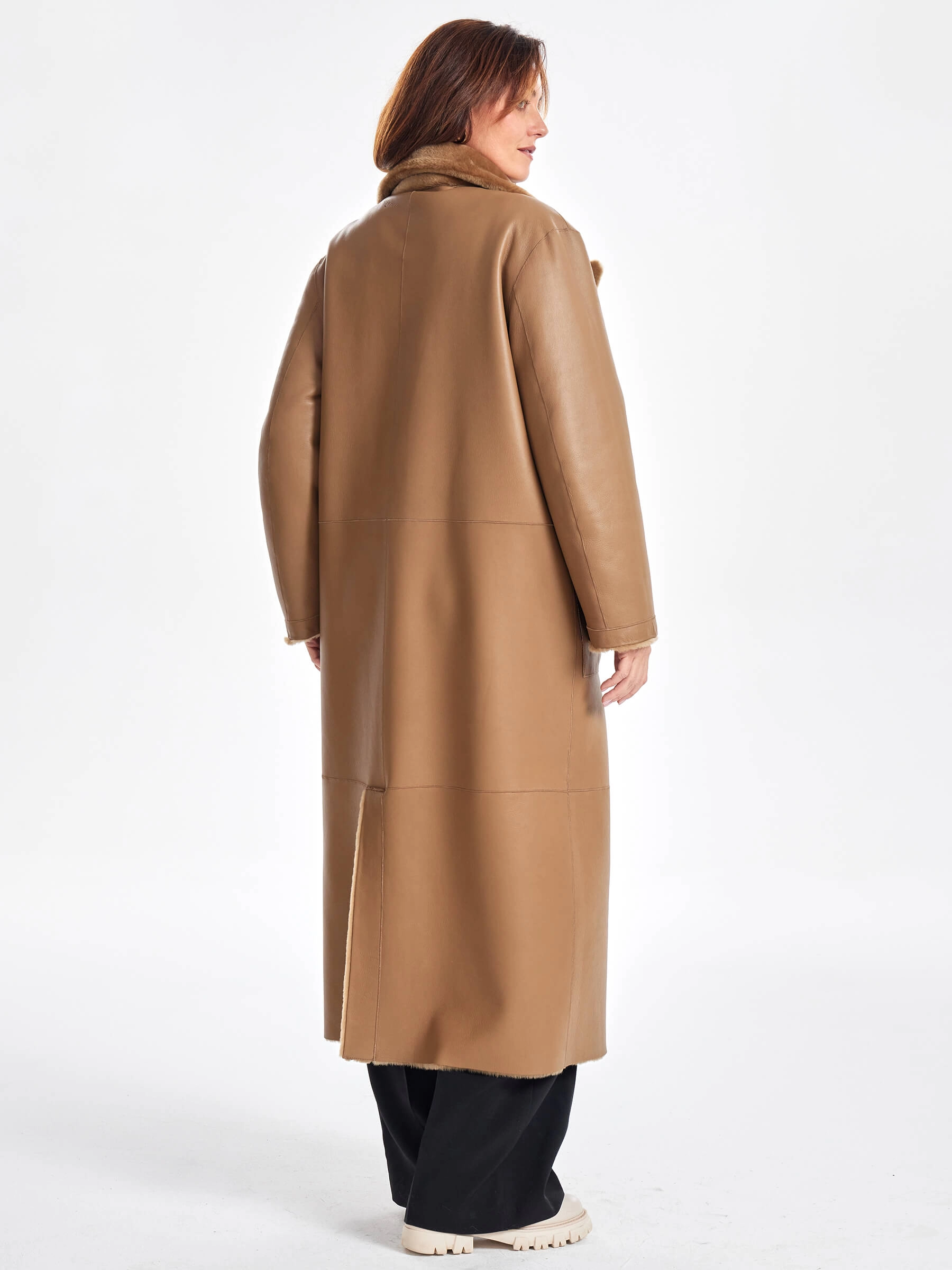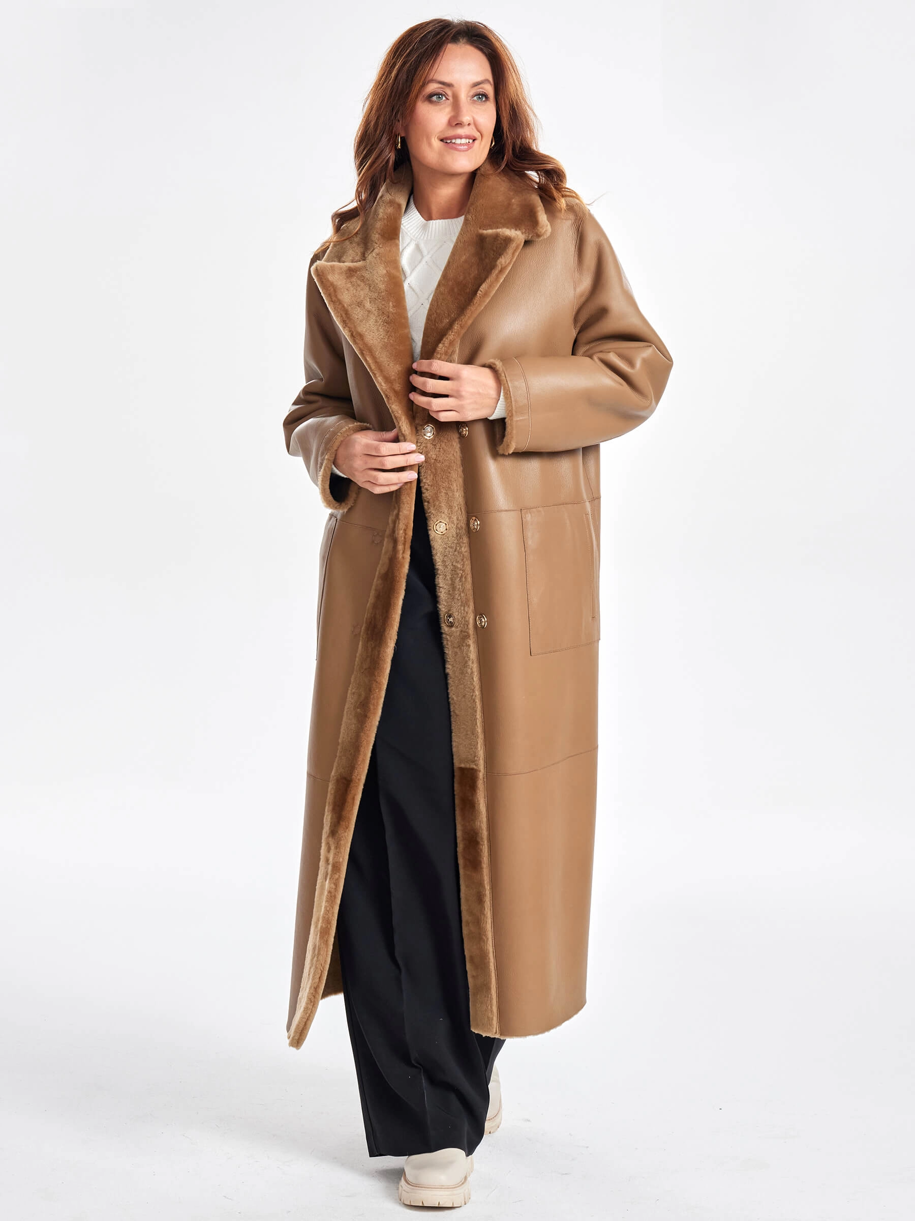 Представляем вам двустороннее пальто из меховой овчины премиум-класса — воплощение комфорта и вневременной элегантности, которое станет идеальным выбором для прохладного межсезонья и зимы: модель прямого кроя с английским воротником и спущенным рукавом выполнена из высококачественной овчины «Мерино», и её уникальность заключается в возможности носить пальто на две стороны — гладкая сторона имитирует благородную кожу для деловых встреч, а меховая сторона добавляет образу уюта и природного шарма. В этом пальто продумана каждая деталь: два больших кармана согреют руки в ветреную погоду, застежка на удобные кнопки защитит от порывов ветра, а длинный кожаный пояс позволяет варьировать посадку от свободного оверсайза до изящного приталенного силуэта. Натуральный коричневый цвет легко комбинируется с любыми оттенками в гардеробе, а пальто длиной 125 см не требует дополнительного утепления, так как овчина обладает превосходными термосвойствами. Совет стилиста: носите это пальто с объёмным кашемировым шарфом и высоким