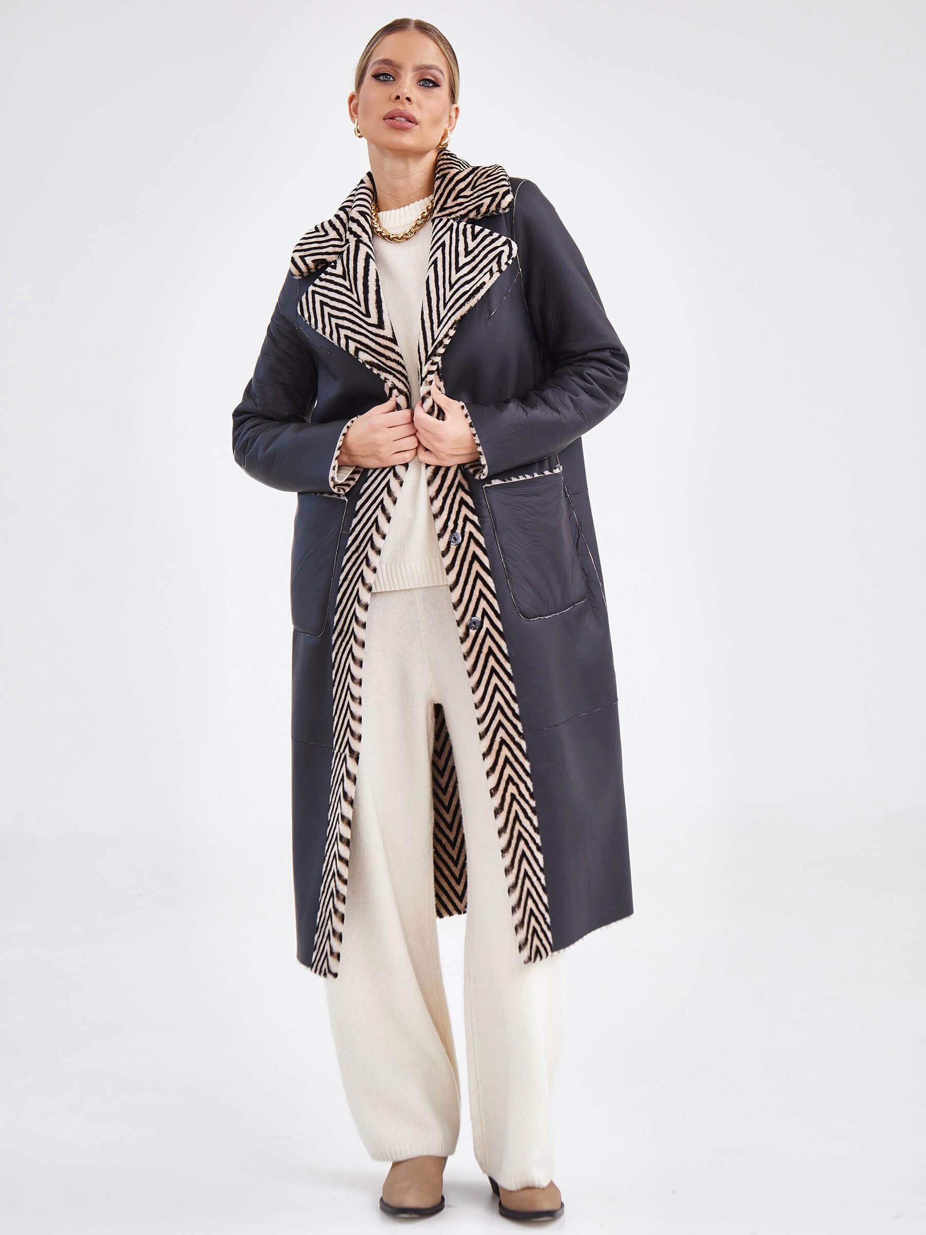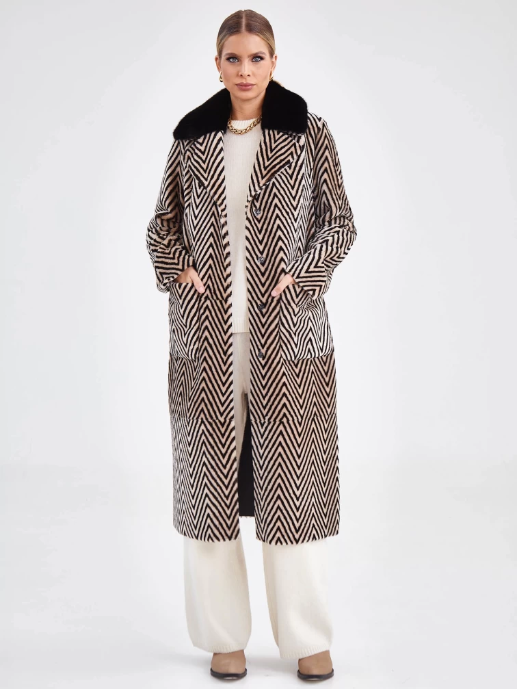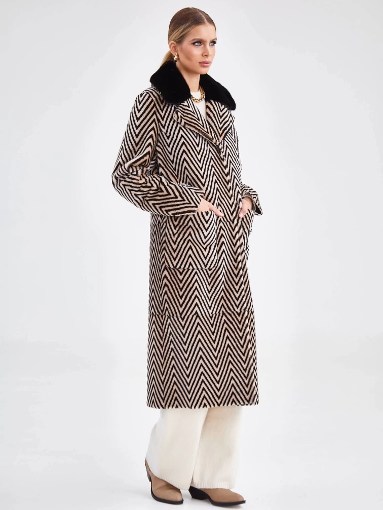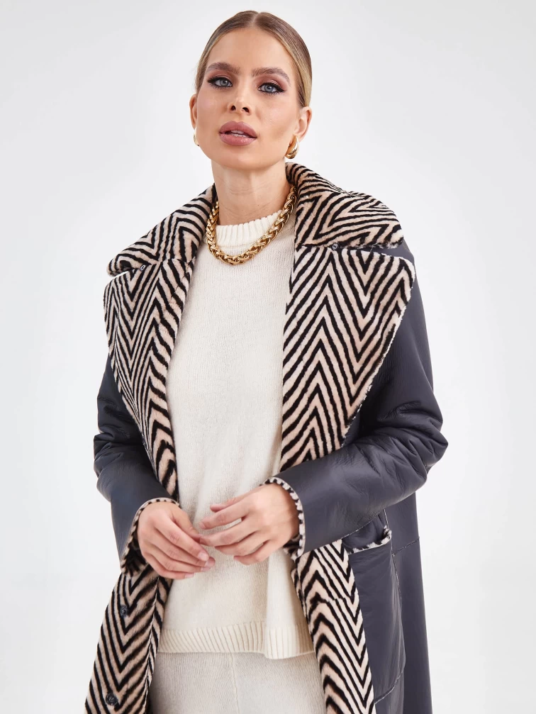 Лимитированная серия: роскошное двустороннее женское пальто премиум-класса длиной 119 см сочетает принтованный мех ягнёнка, известный как астраган, с одной стороны и благородное бронзовое металлизированное покрытие — с другой. Свободный силуэт со съёмным английским воротником из густого чёрного меха норки и застёжкой на кнопках создаёт изысканный образ. Дополнено накладными карманами и длинным поясом, завязываемым на талии. Нежнейший шелковистый материал гарантирует премиальное качество. Совет стилиста: наденьте со стороной из ягнёнка и меховым воротником с платьем-миди для вечера или со стороной-металлик без воротника с водолазкой и кожаными брюками для дерзкого повседневного стиля — одна вещь, два безупречных образа.