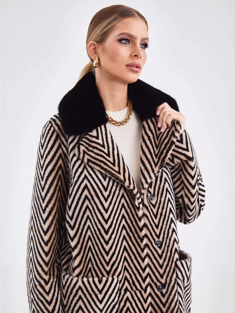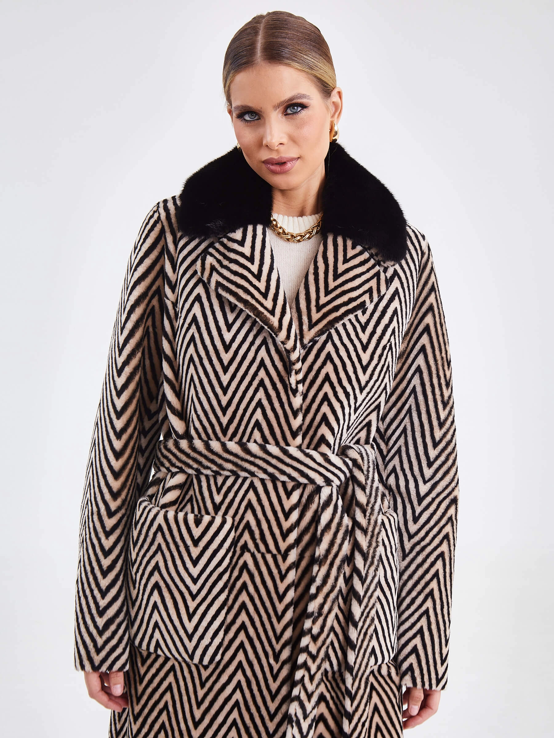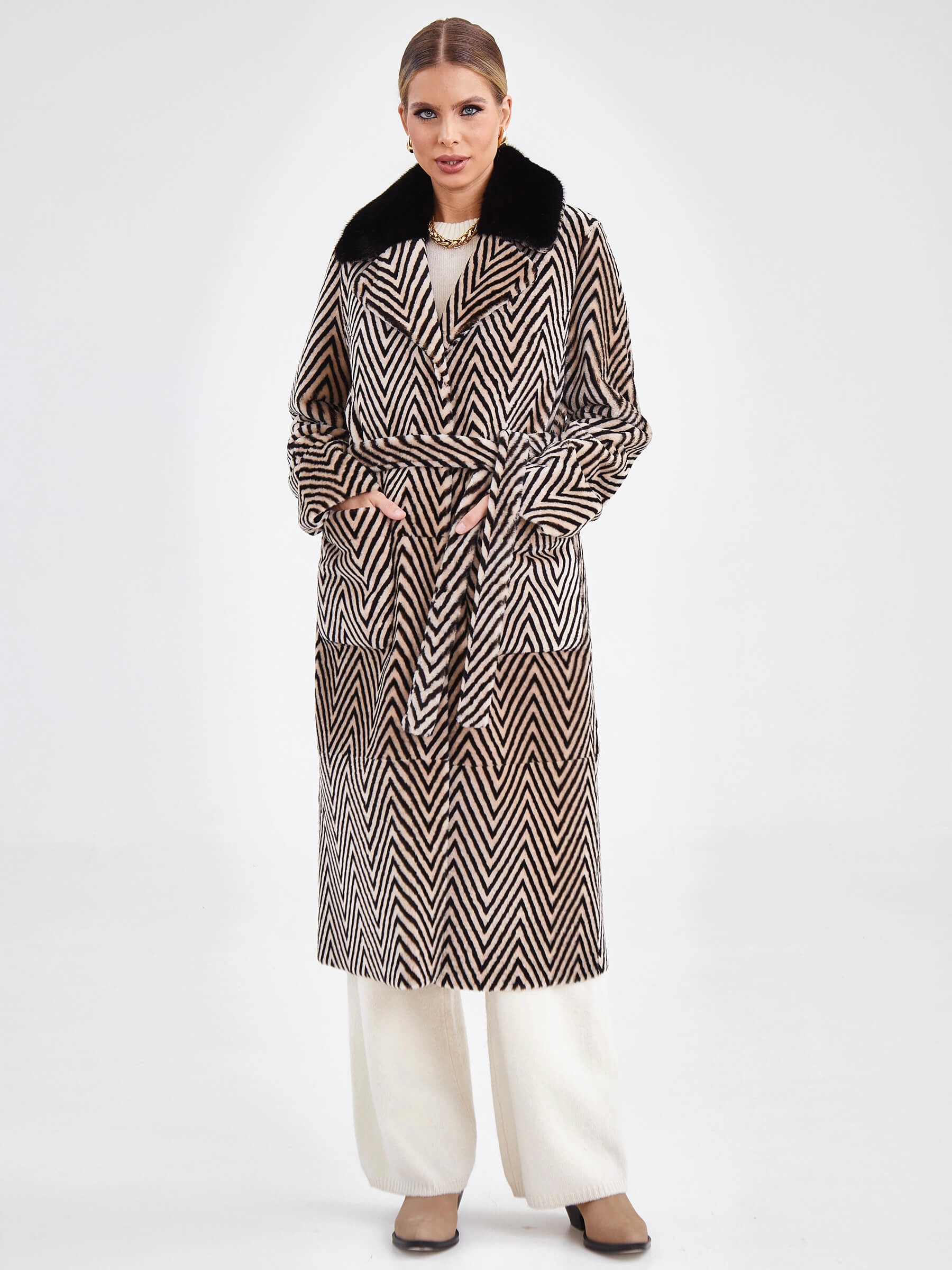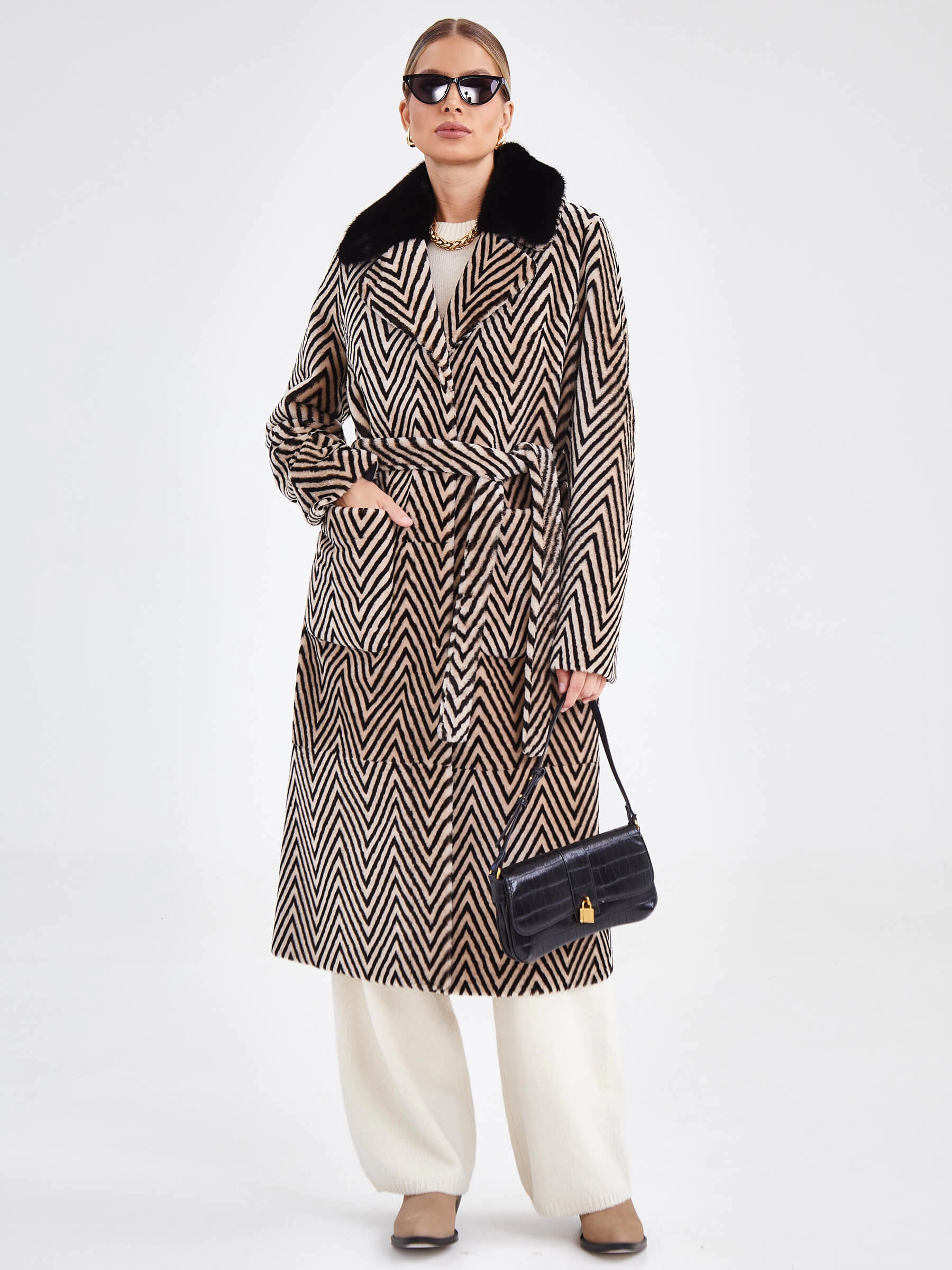 Лимитированная серия: роскошное двустороннее женское пальто премиум-класса длиной 119 см сочетает принтованный мех ягнёнка, известный как астраган, с одной стороны и благородное бронзовое металлизированное покрытие — с другой. Свободный силуэт со съёмным английским воротником из густого чёрного меха норки и застёжкой на кнопках создаёт изысканный образ. Дополнено накладными карманами и длинным поясом, завязываемым на талии. Нежнейший шелковистый материал гарантирует премиальное качество. Совет стилиста: наденьте со стороной из ягнёнка и меховым воротником с платьем-миди для вечера или со стороной-металлик без воротника с водолазкой и кожаными брюками для дерзкого повседневного стиля — одна вещь, два безупречных образа.