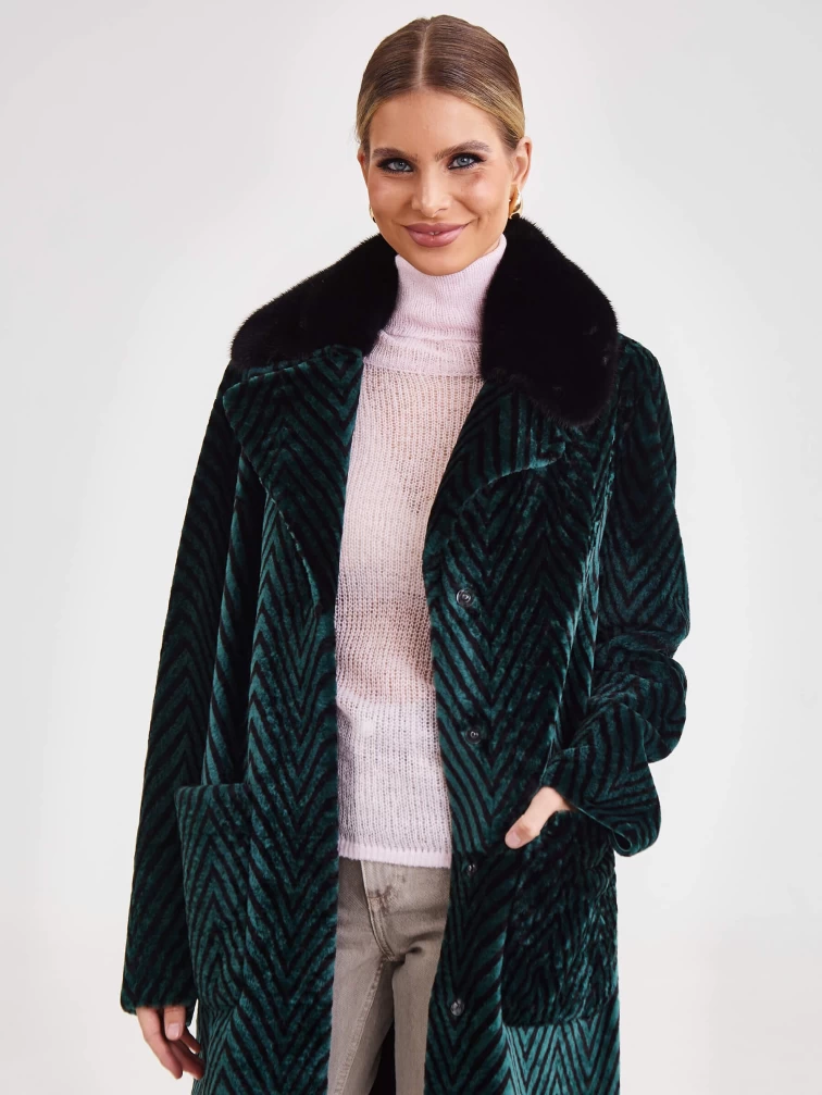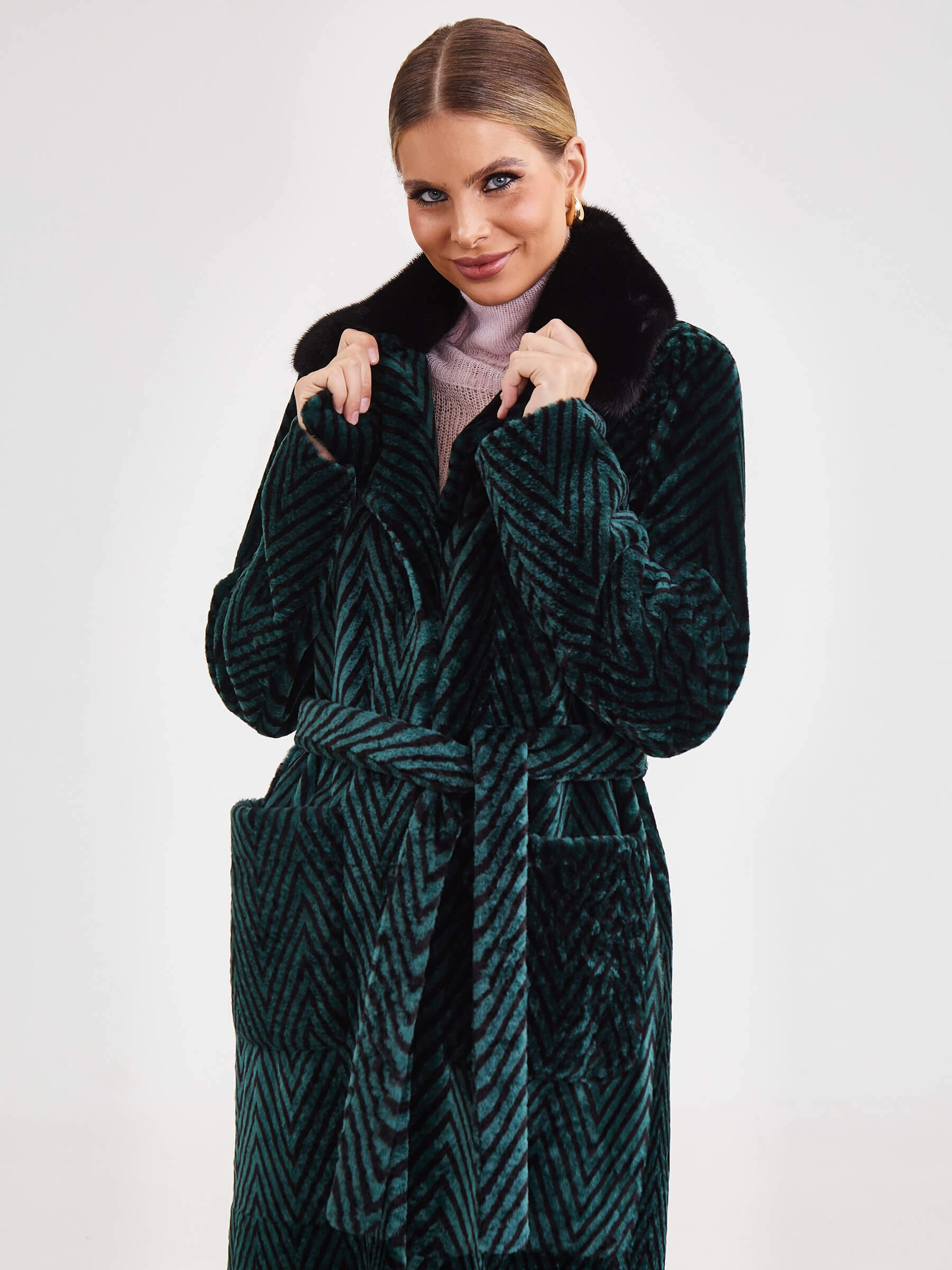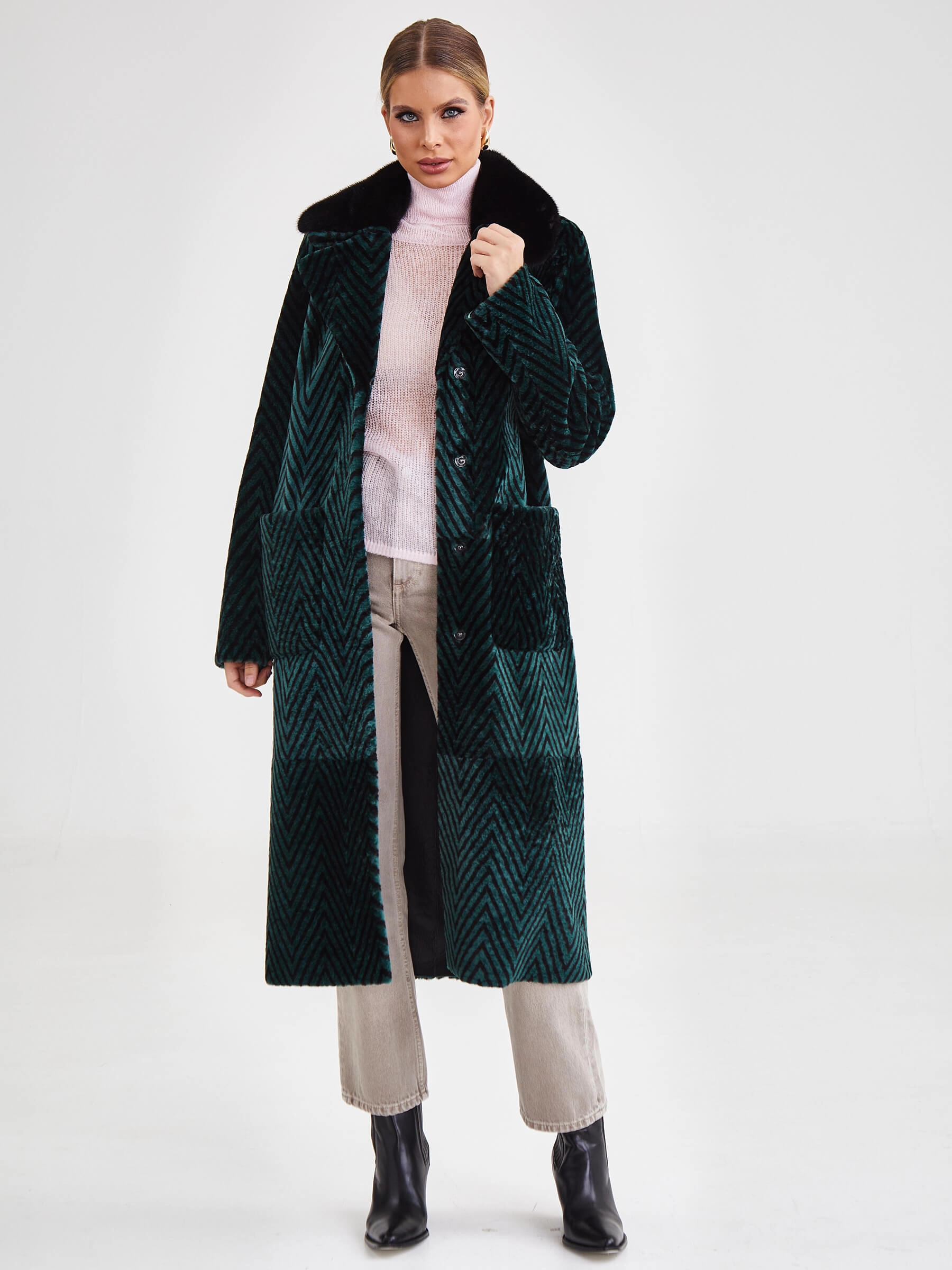 Товар двустороннее женское пальто с воротником из меха норки премиум класса 2003, зеленое, размер 46, артикул 25480 выполнен из астраган с застежкой кнопки. Рассчитан на сезон: осень-зима. Длина изделия 119 см, силуэт свободный.