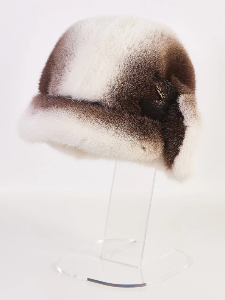 Женский головной убор Завиток с небольшими полями, объемный, но при этом легкий и теплый. Аксессуар выполнили из шелковистого меха норки с густой подпушью. Украшением для аксессуара послужила декоративная аппликация из натуральной кожи.