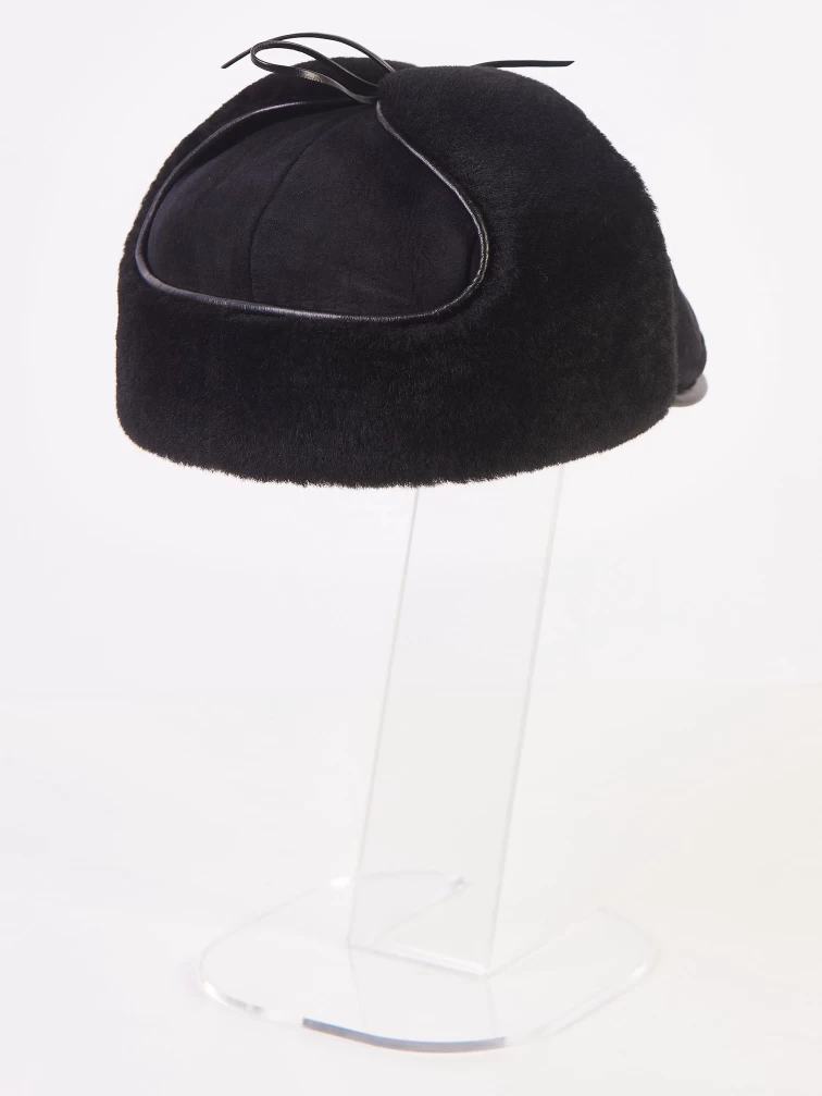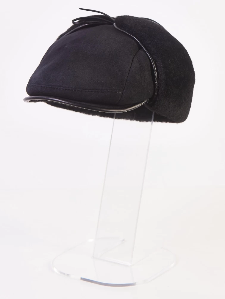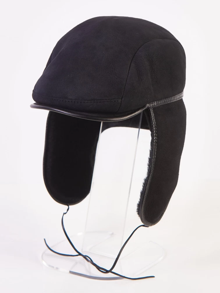 Мужской головной убор выполнили из плотной овчины, которая хорошо сохраняет тепло. Лицевая из натуральной замши. Жесткий козырек, ушки опускаются или фиксируются тонким шнурком из натуральной кожи. Меховой ветрозащитный клапан надежно защитит от ветра.