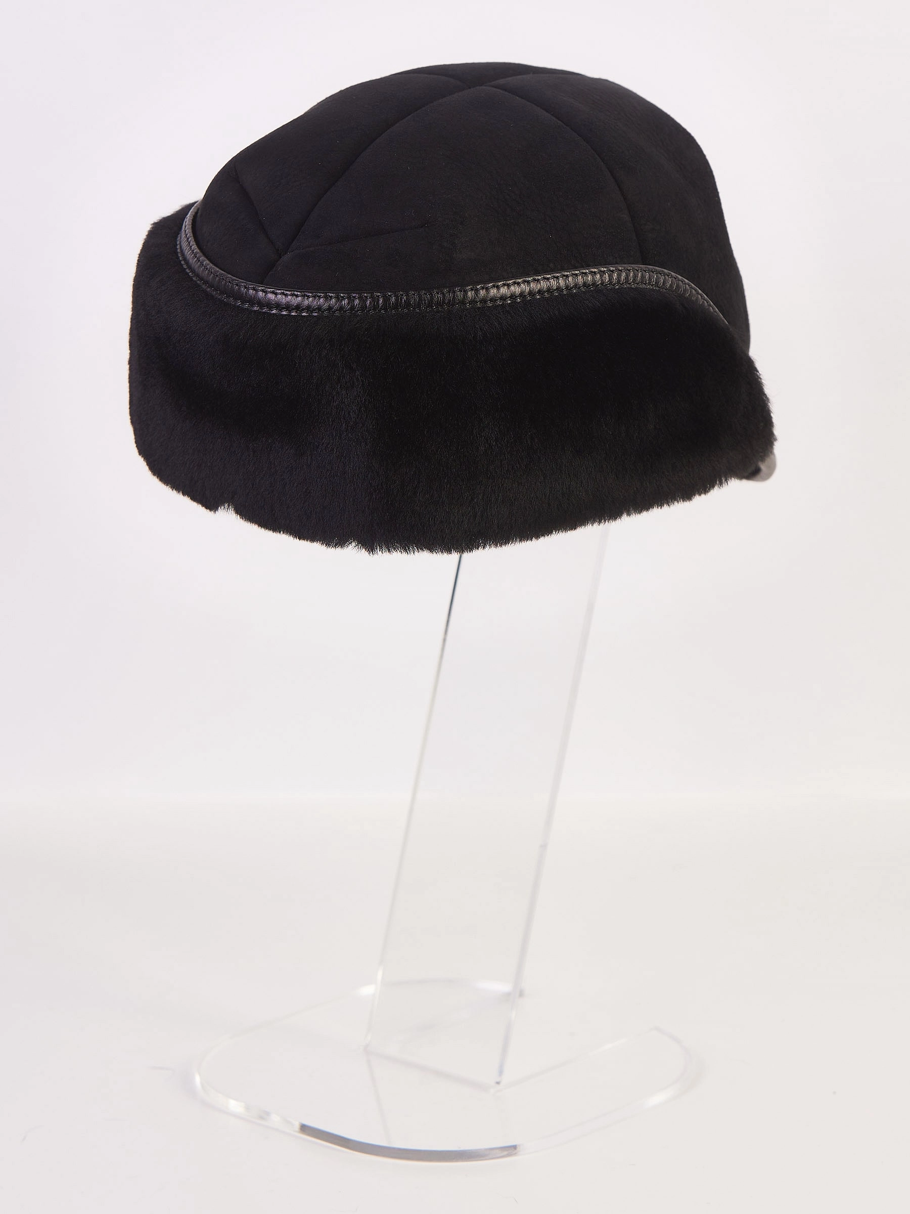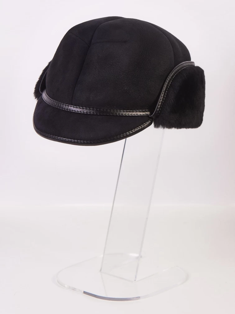 Модель с небольшим козырьком и широким меховым отворотом. Отделка из натуральной кожи. Ветрозащитный отворот при необходимости хорошо закрывает уши и шею. Подкладка - натуральная овчина. Изделие практичное, легкое и очень теплое.