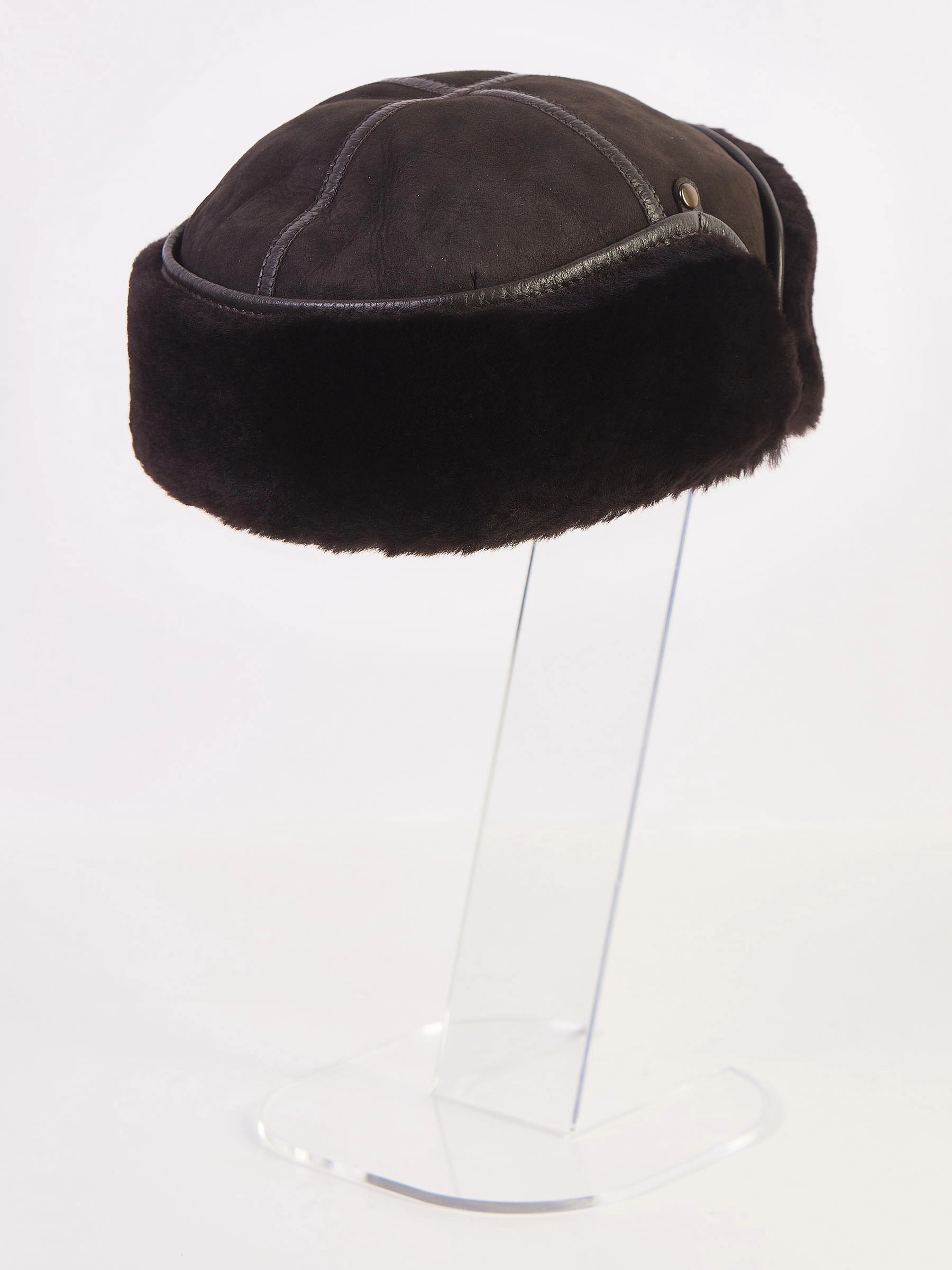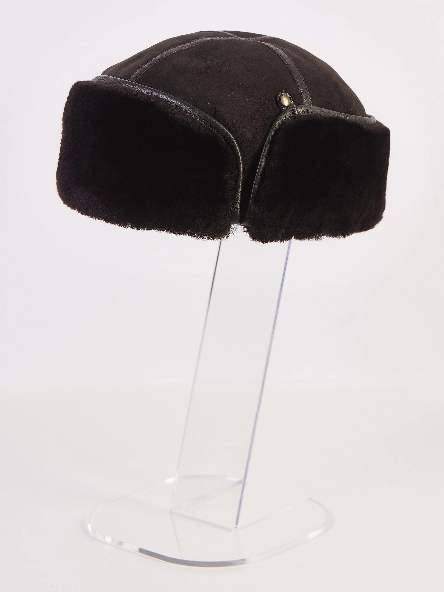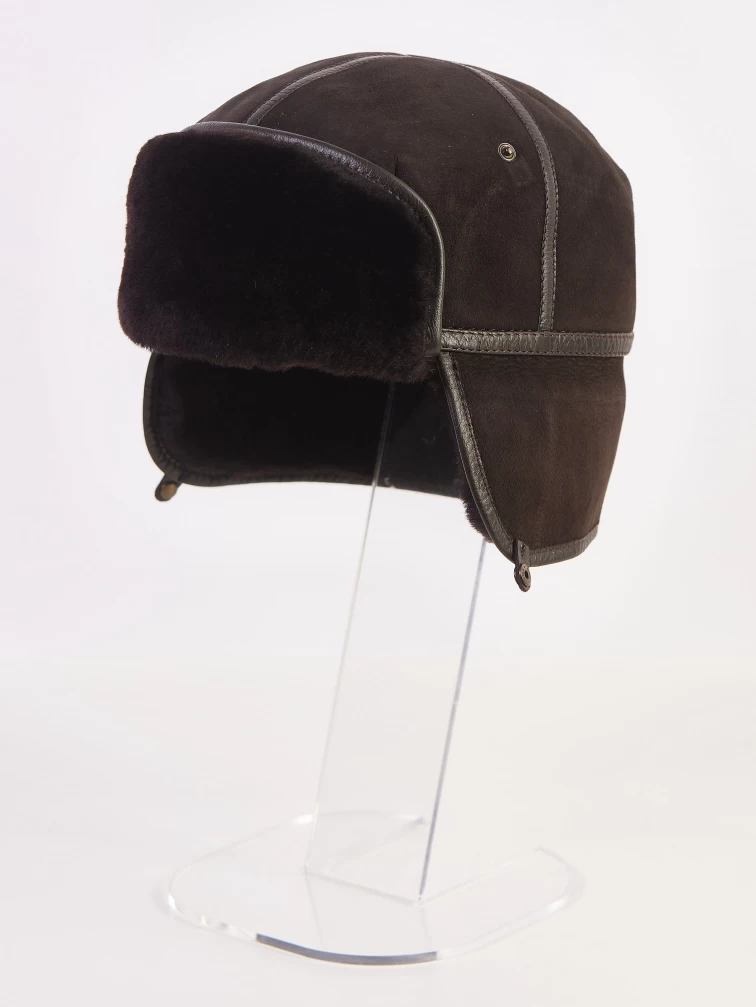 Мужской головной убор выполнен из плотной меховой овчины. Лицевая сторона из натуральной замши. Ветрозащитный клапан фиксируется кнопками и опускается.