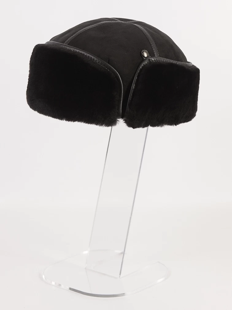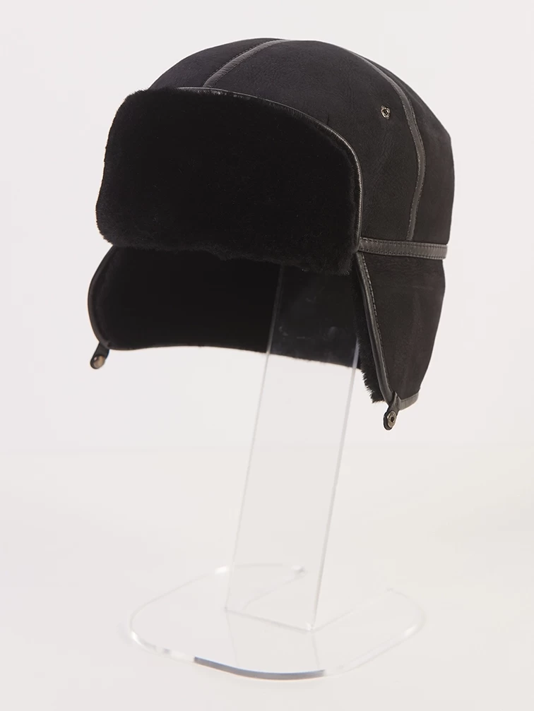 Мужской головной убор выполнен из плотной меховой овчины. Лицевая сторона из натуральной замши. Ветрозащитный клапан фиксируется кнопками и опускается.