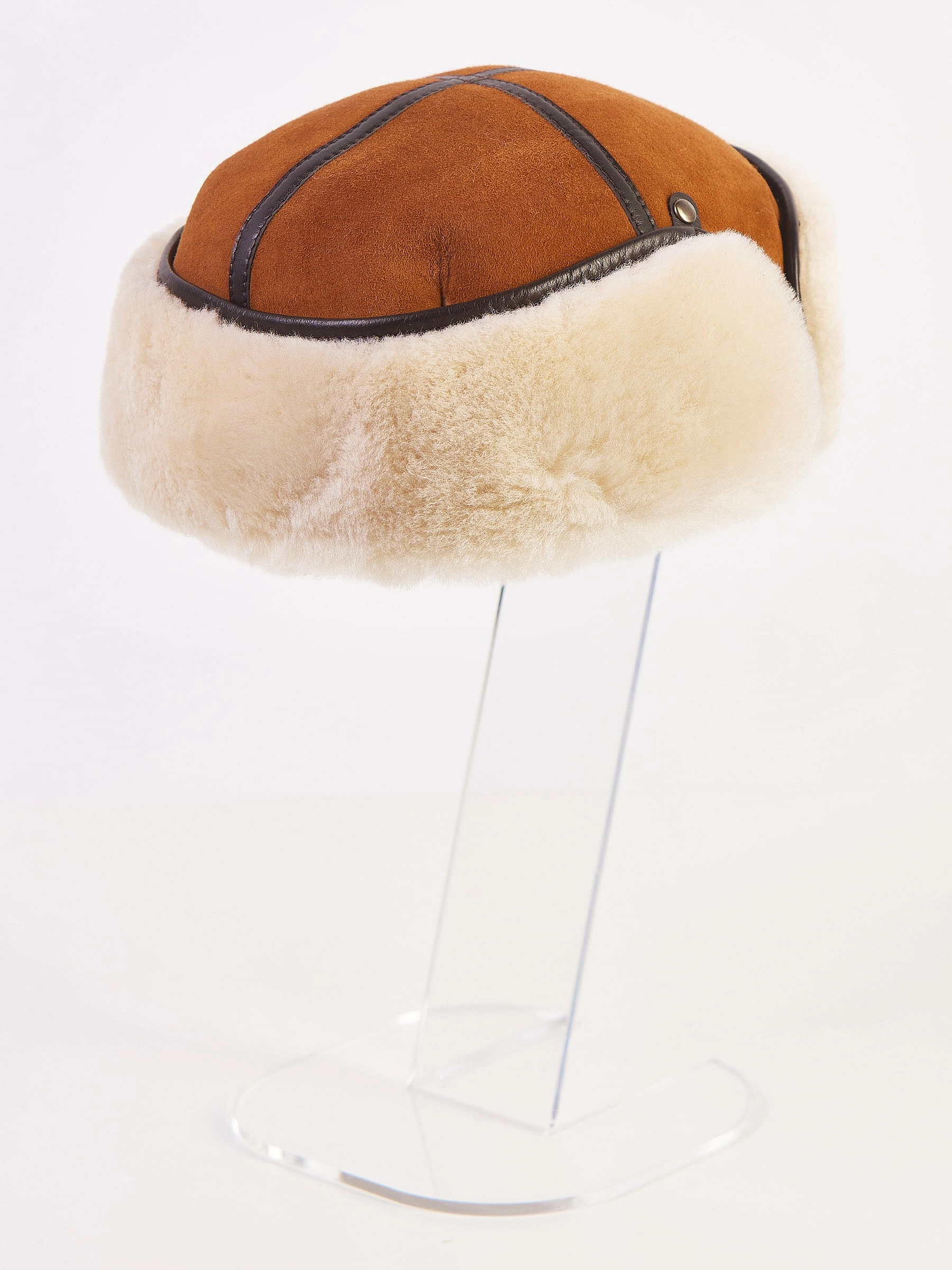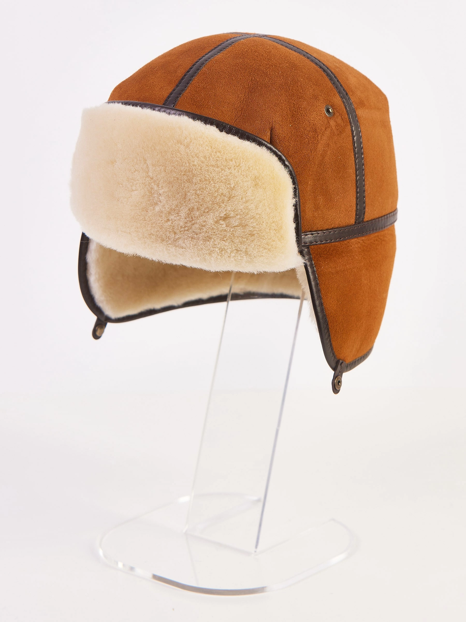 Мужской головной убор выполнен из плотной меховой овчины. Лицевая сторона из натуральной замши. Ветрозащитный клапан фиксируется кнопками и опускается.