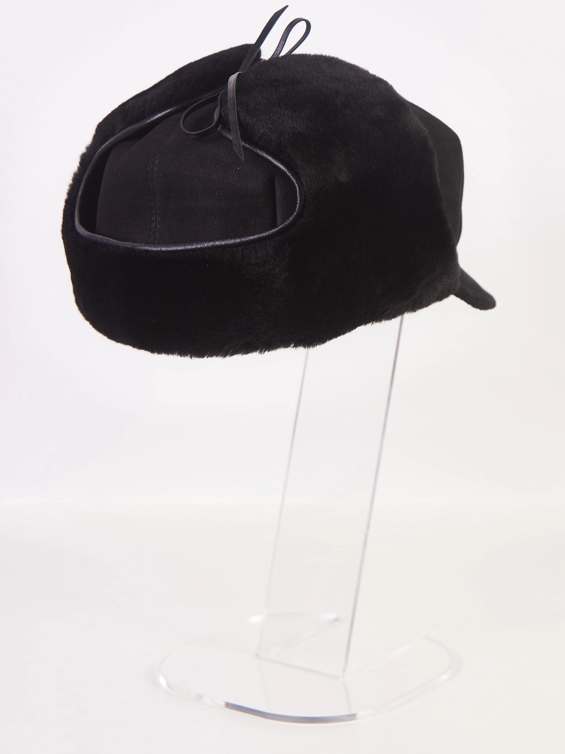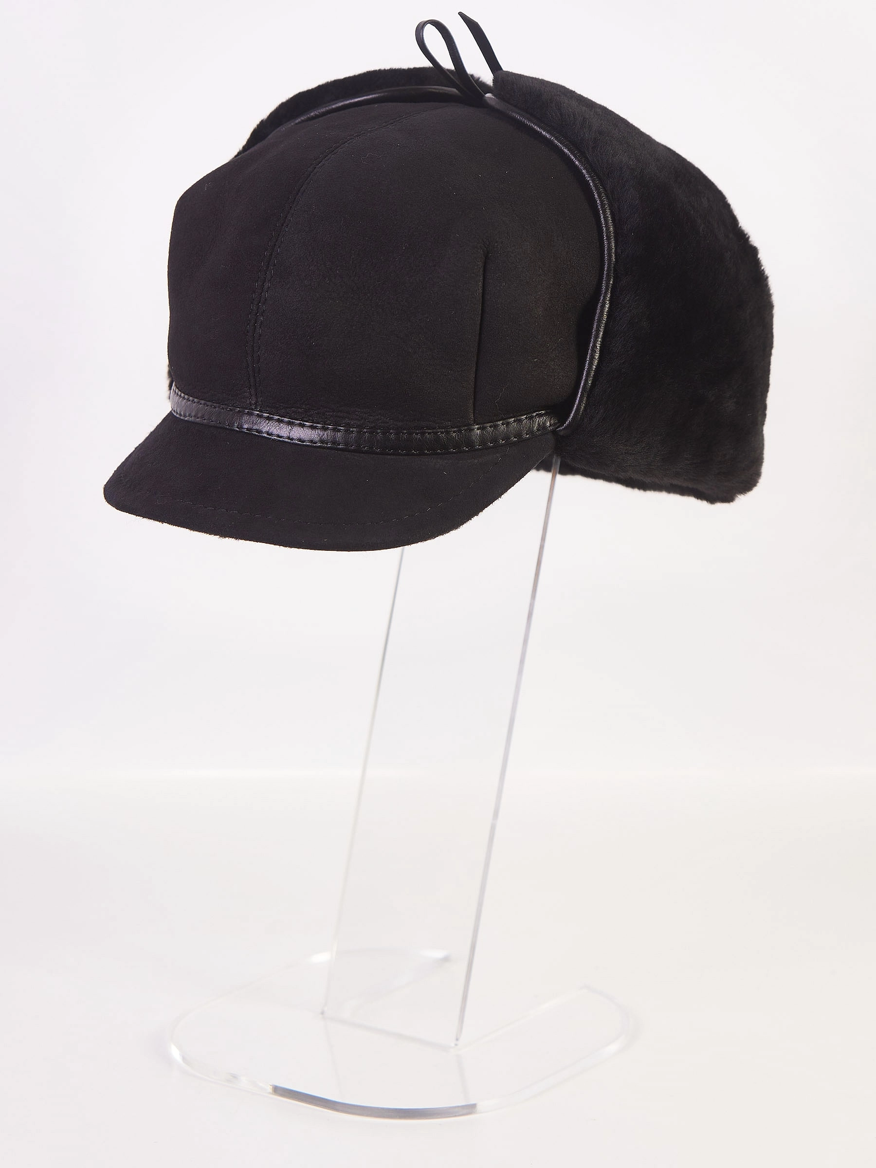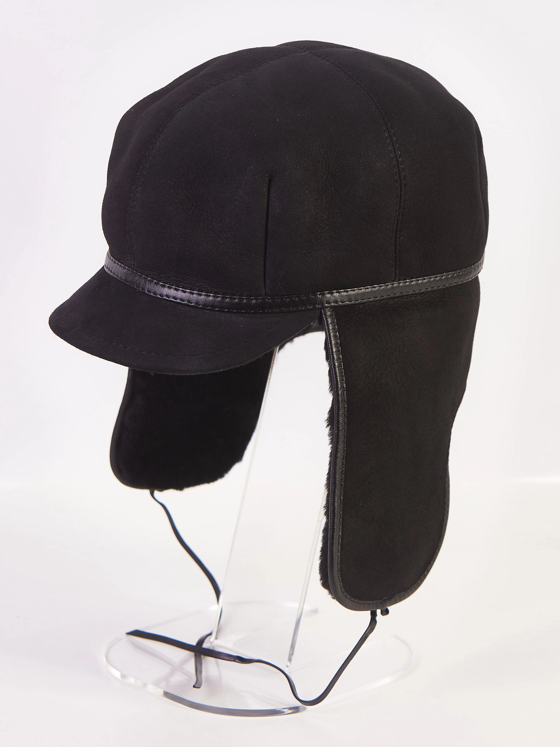 Мужской аксессуар изготовлен из натуральной овчины. Лицевая сторона - замша, внутренняя - плотная овчина. При необходимости ушки изделия отворачиваются и фиксируются тонкими шнурками из натуральной кожи.
