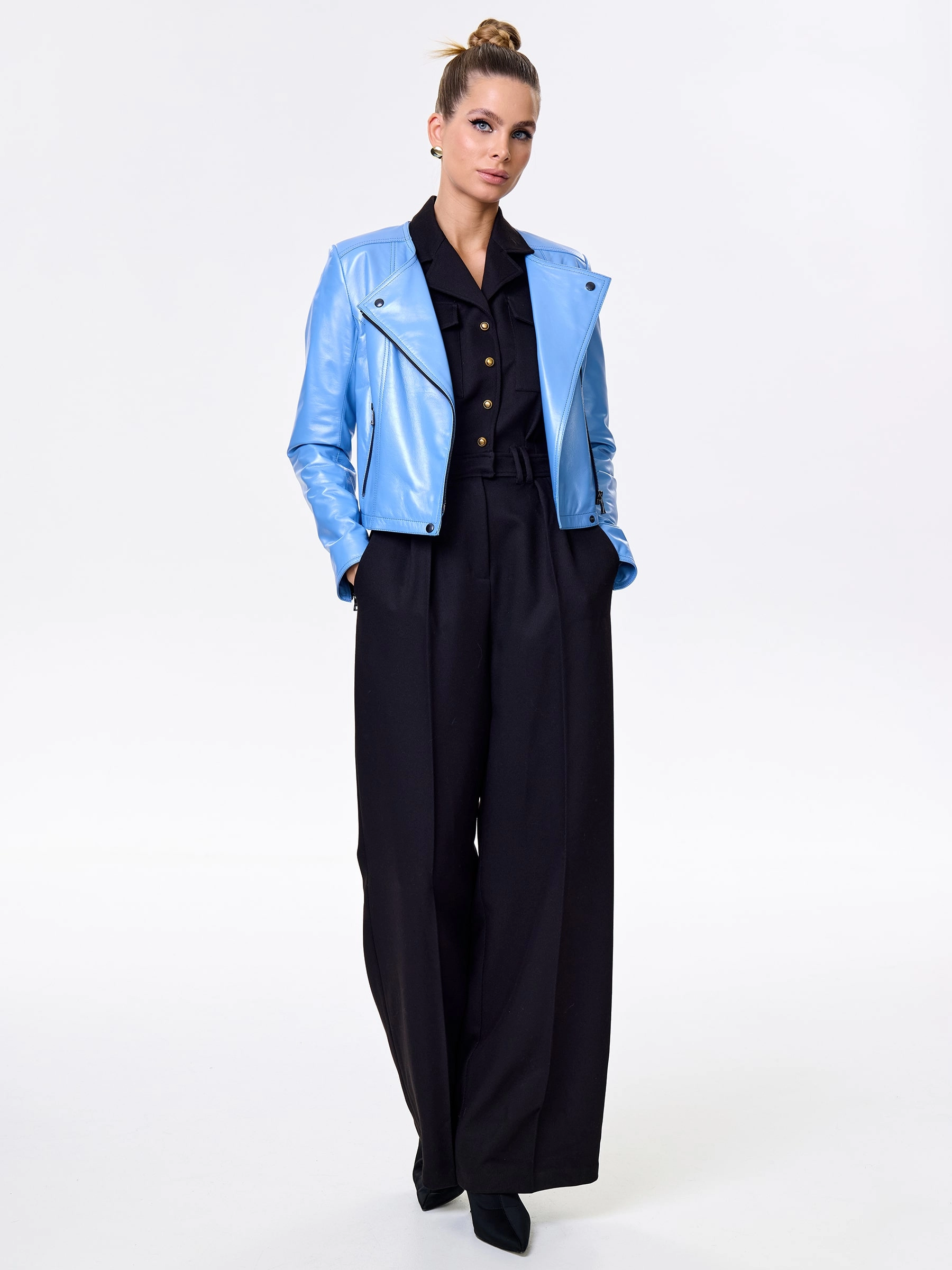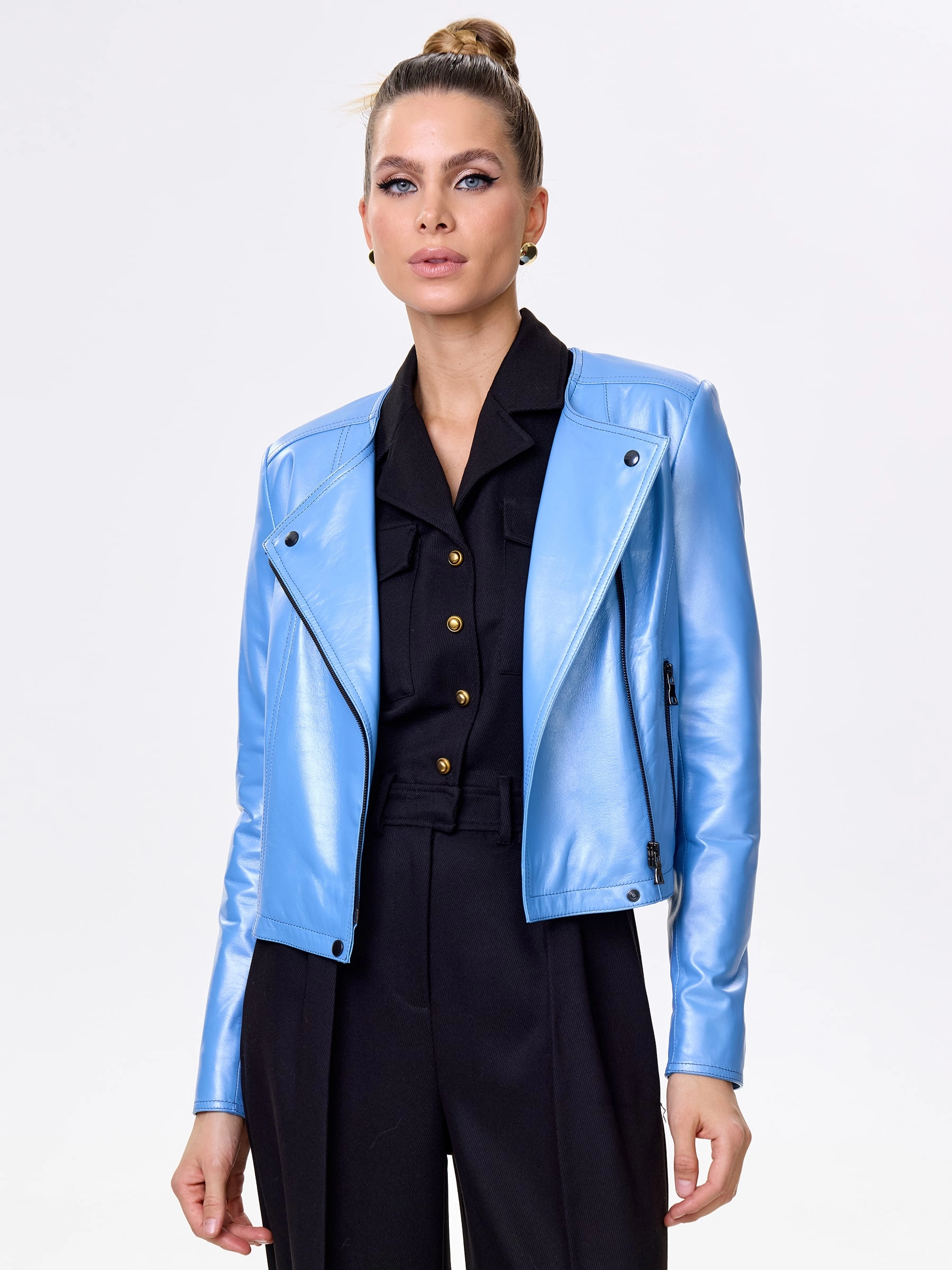 Женская косуха из гладкой натуральной кожи нежно-голубого переливающегося оттенка. Полуприлегающий силуэт с застежкой-молнией без воротника излучает современную элегантность. Регулируемые боковые паты обеспечивают идеальную посадку, подчеркивая фигуру, а втачные рукава и два врезных кармана на молниях гарантируют функциональность. Этот переливающийся акцентный элемент станет звездой гардероба — сочетайте с шелковой рубашкой цвета слоновой кости, белыми джинсами-бойфрендами и лоферами для нежного лука или с черным кроп-топом, кожаными брюками и серебряными кроссовками для дерзкого сияния.