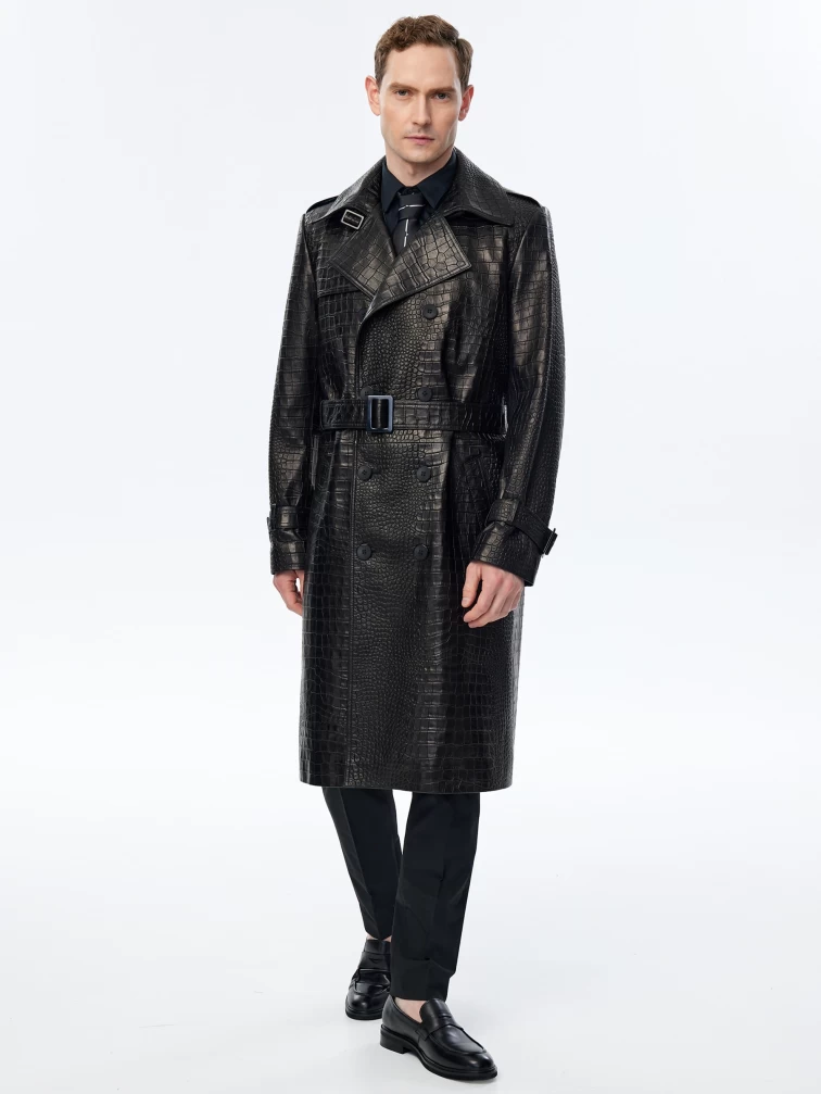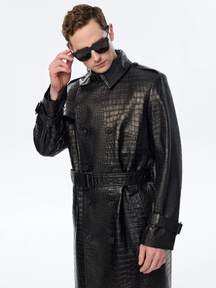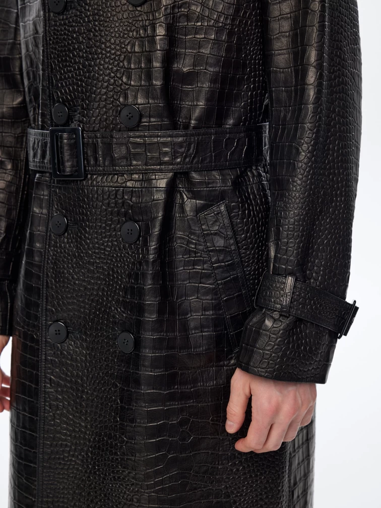 Классическое двубортное кожаное пальто с полным отсутствием декора из мягкой кожи кроко премиального качества. Широкие лацкана и два боковые кармана. Идеальное сочетание с любыми брюками.