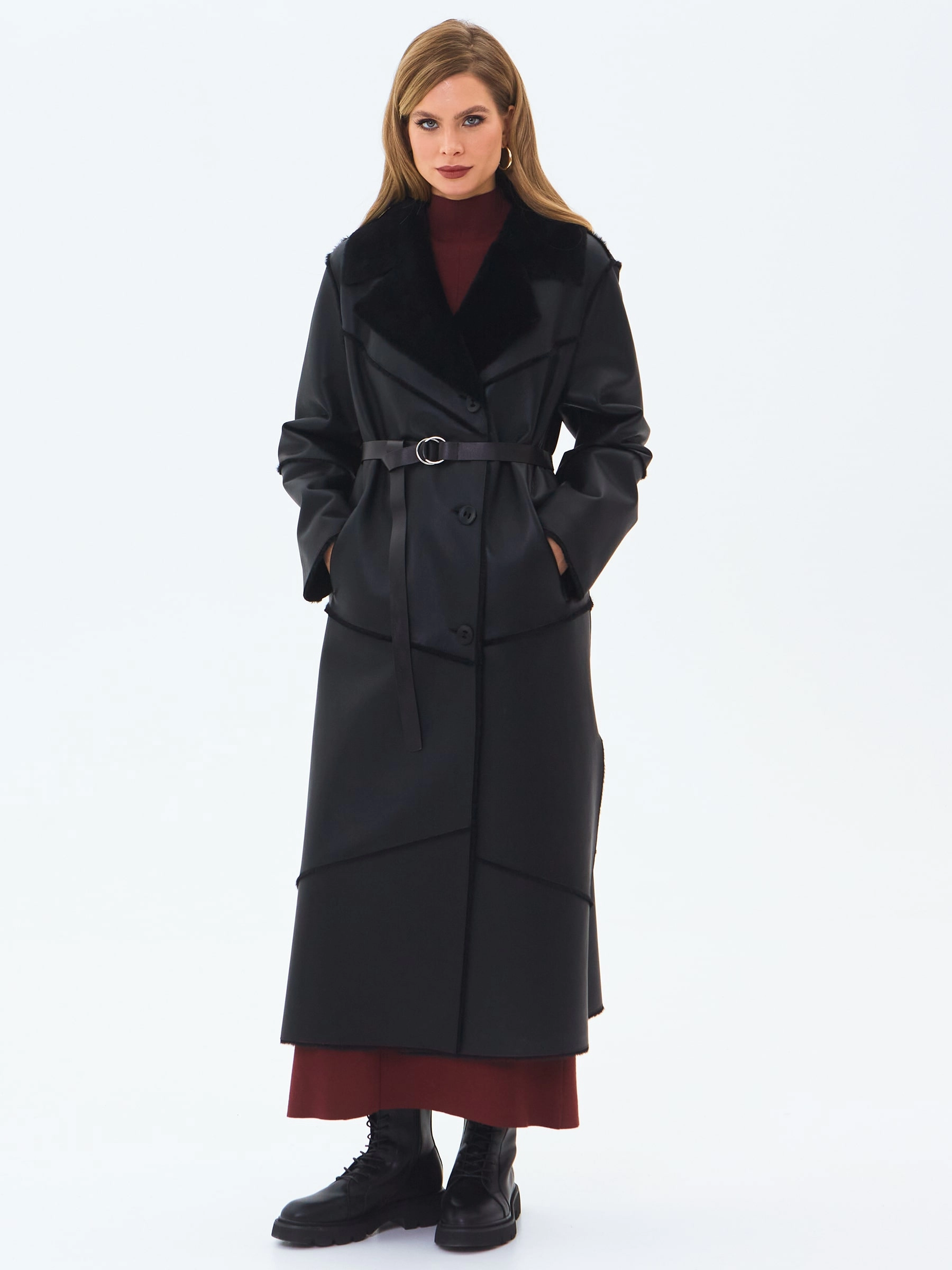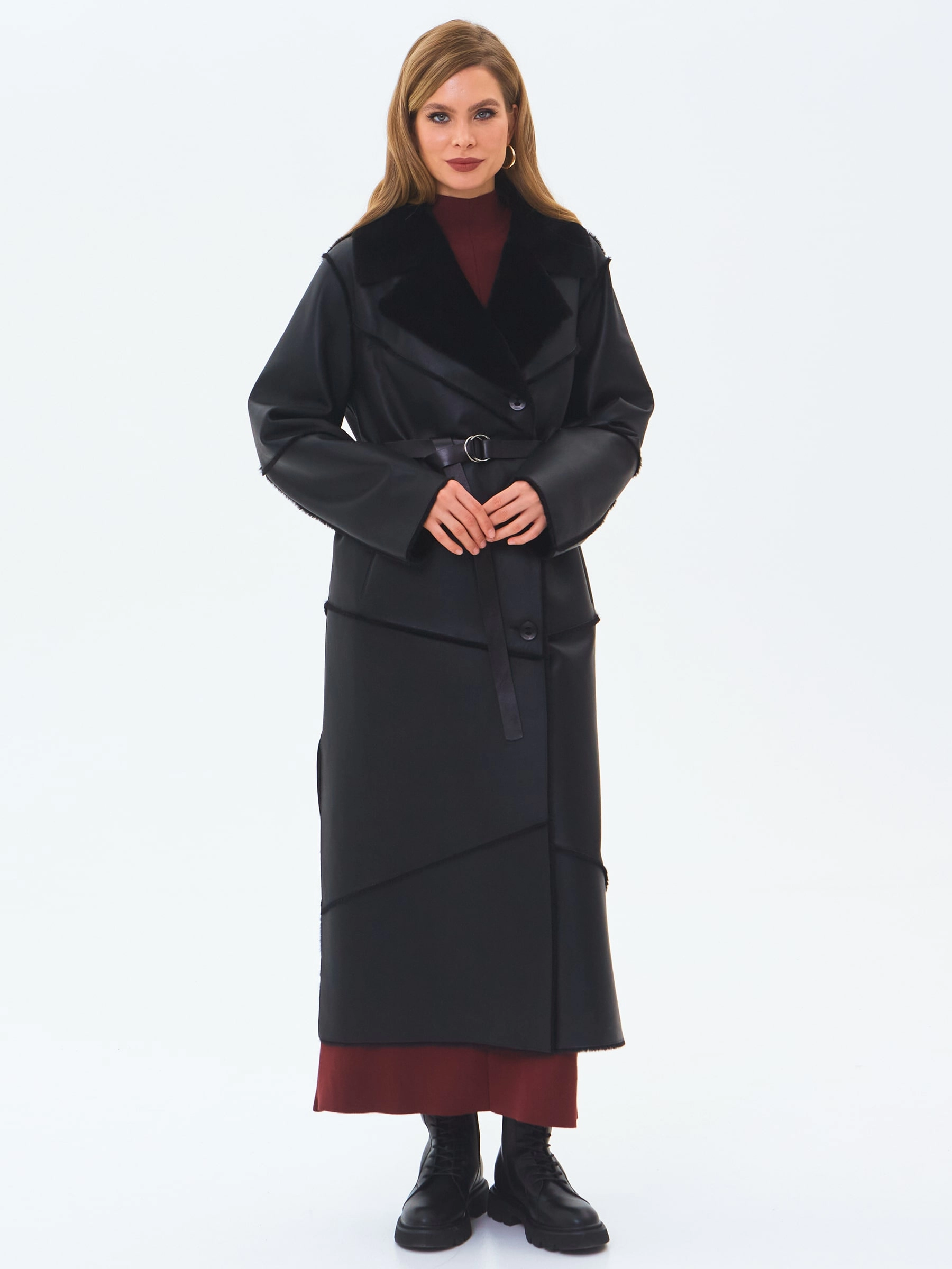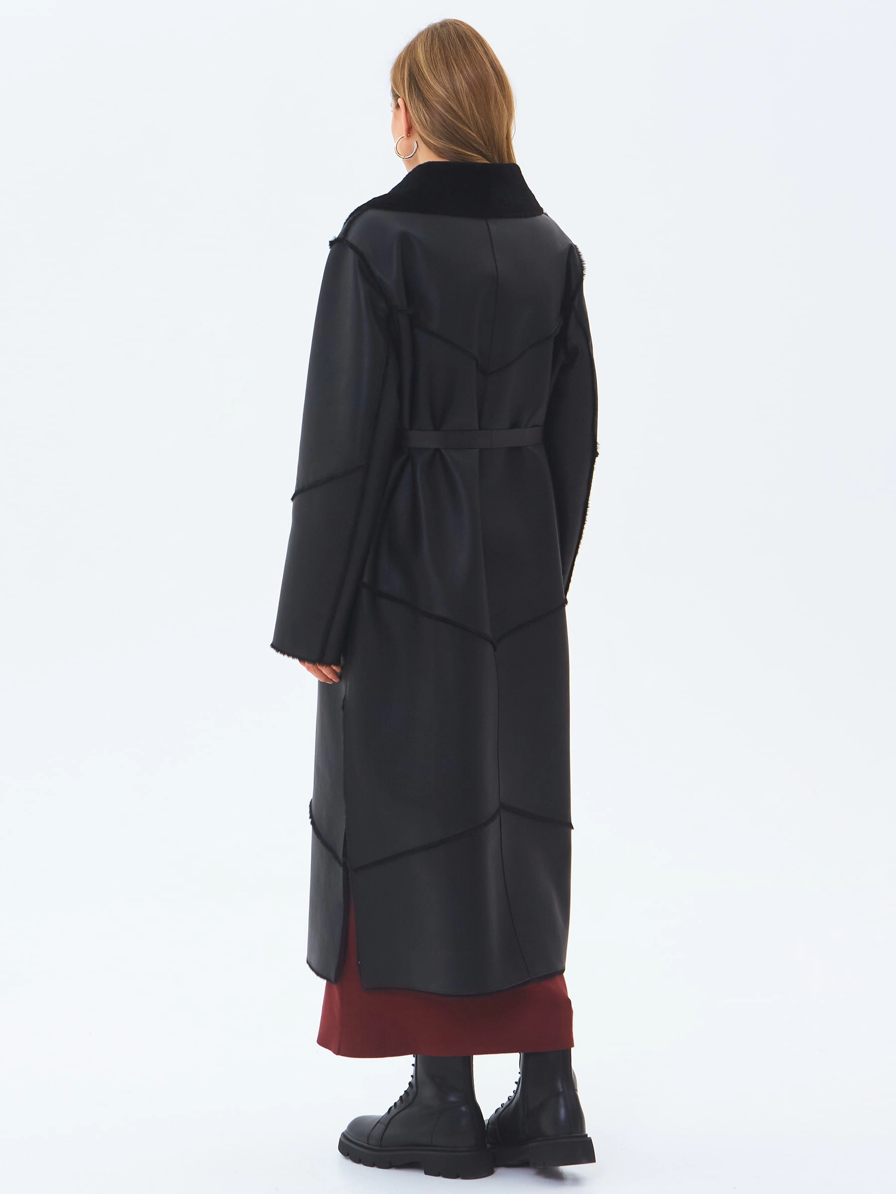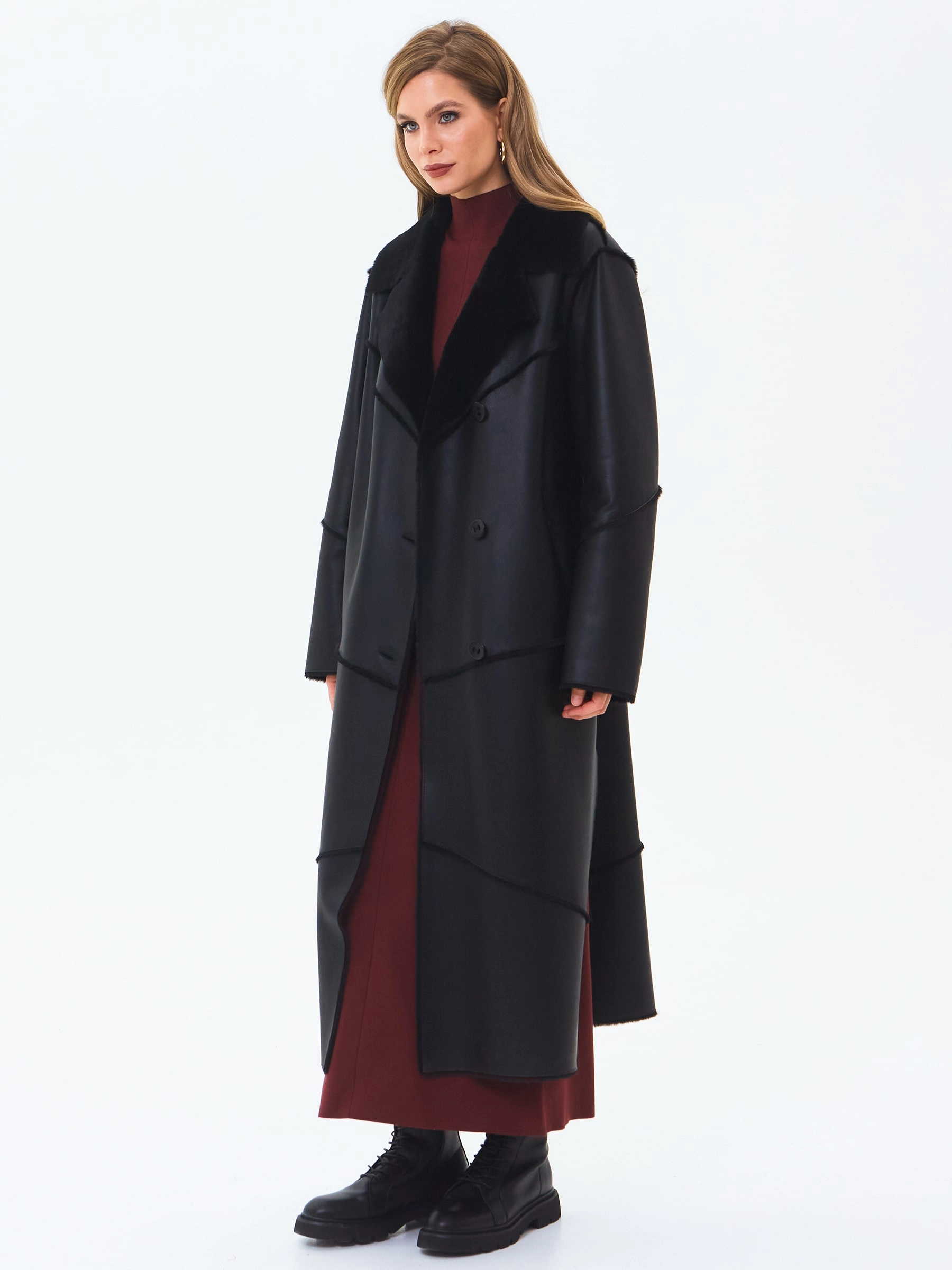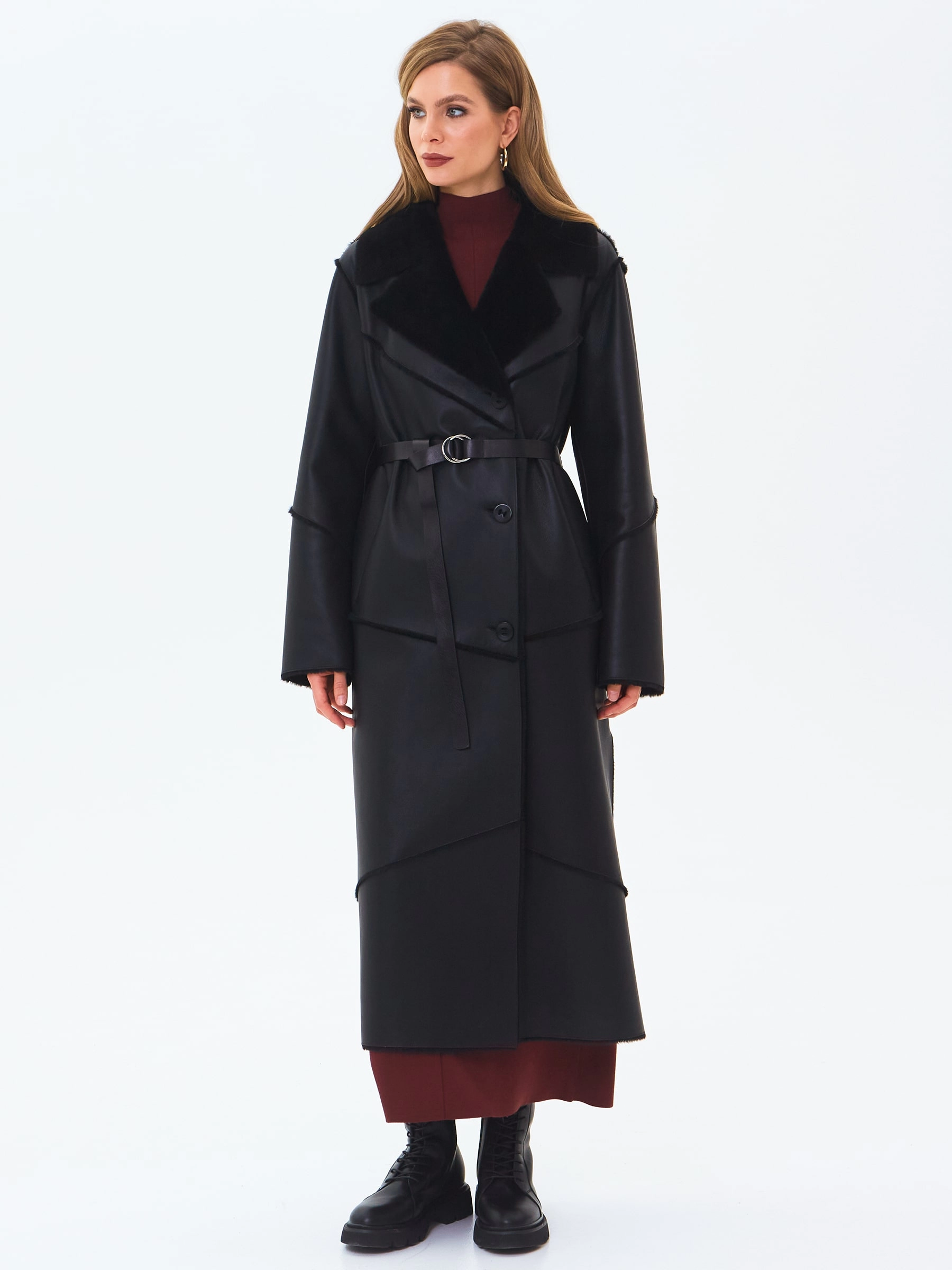 Классическое длинное пальто с вывернутыми наружу швами выполнили из бережно выделанной овчины в универсальном черном цвете. Прямой крой, английский воротник, два врезных кармана, глубокие разрезы по бокам.Застежка фиксируется кожаным поясом. Полное отсутствие декора, подчеркивает в моделе элегантность и востребованность.