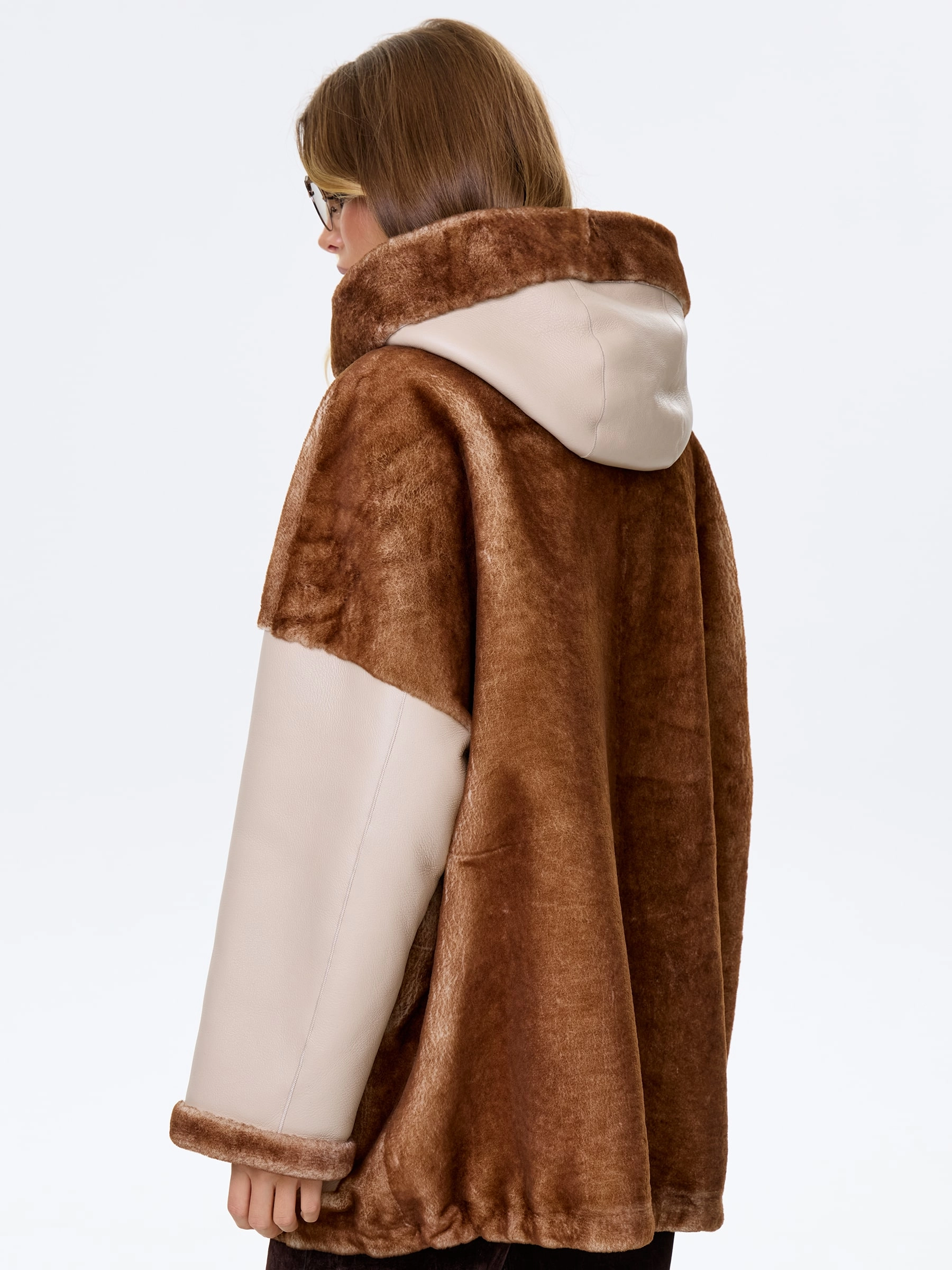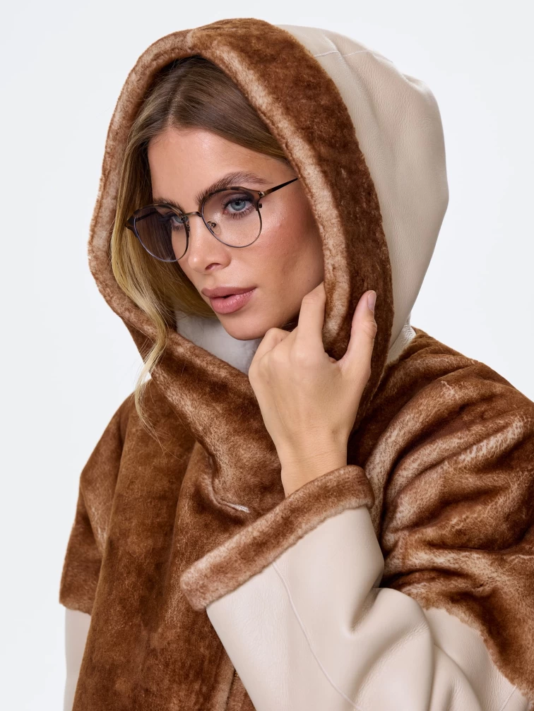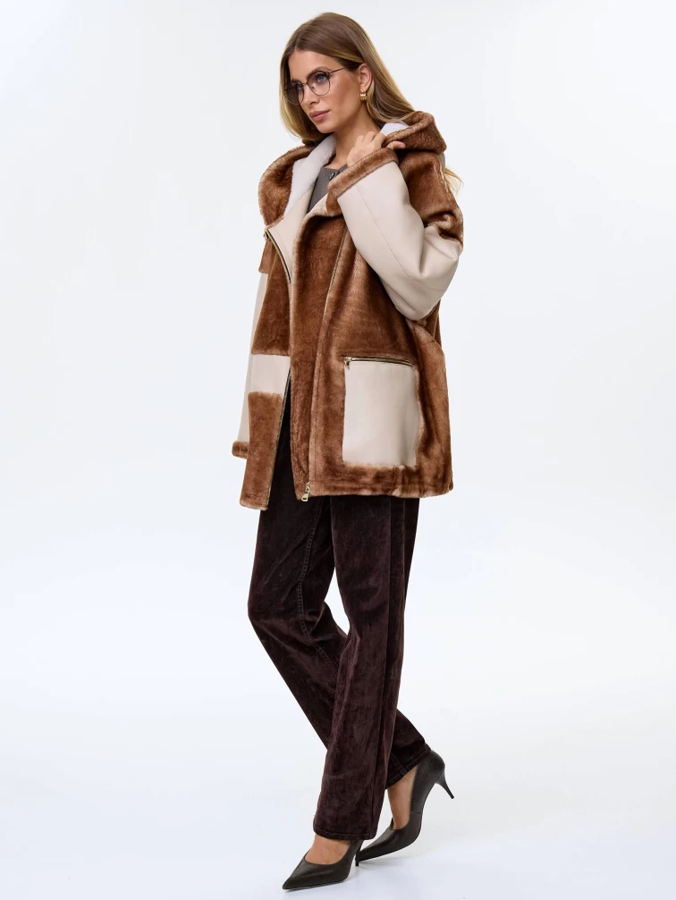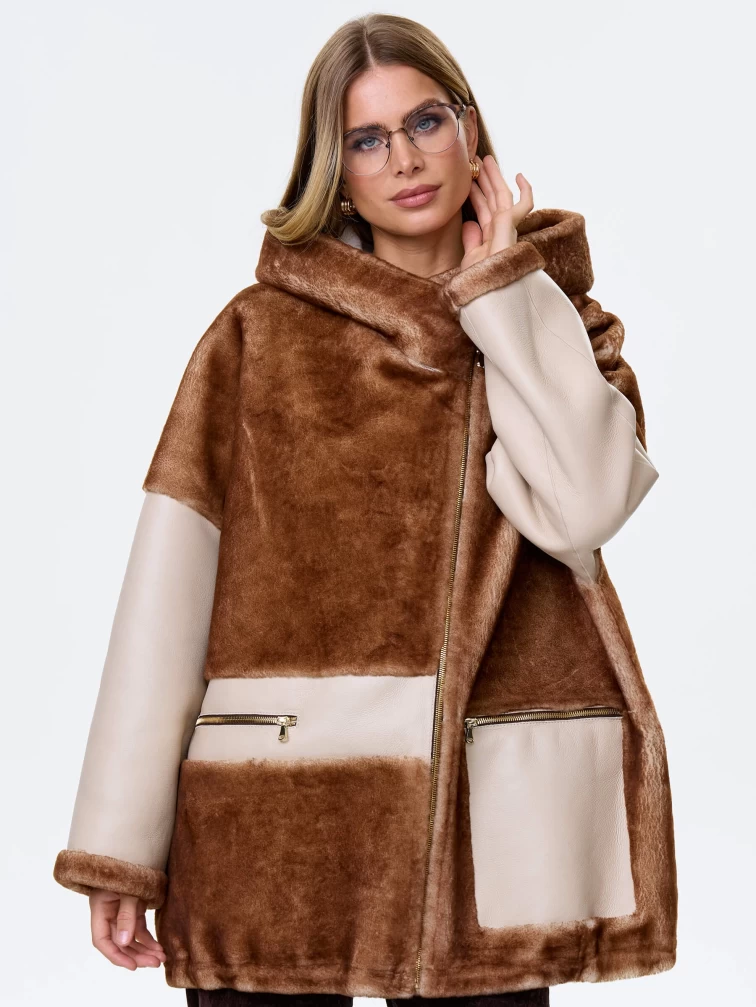 Товар комбинированная женская дубленка с капюшоном из астрагана премиум класса 2058, бежевая, размер 52, артикул 64140 выполнен из овчина "мерино" с застежкой молния. Рассчитан на сезон: осень-зима. Длина изделия 77 см, силуэт свободный.
