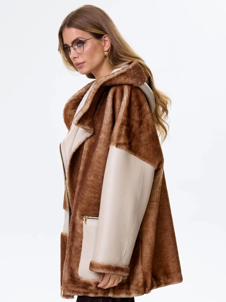 Комбинированная женская дубленка с капюшоном из астрагана премиум класса 2058, бежевая, размер 52, артикул 64140