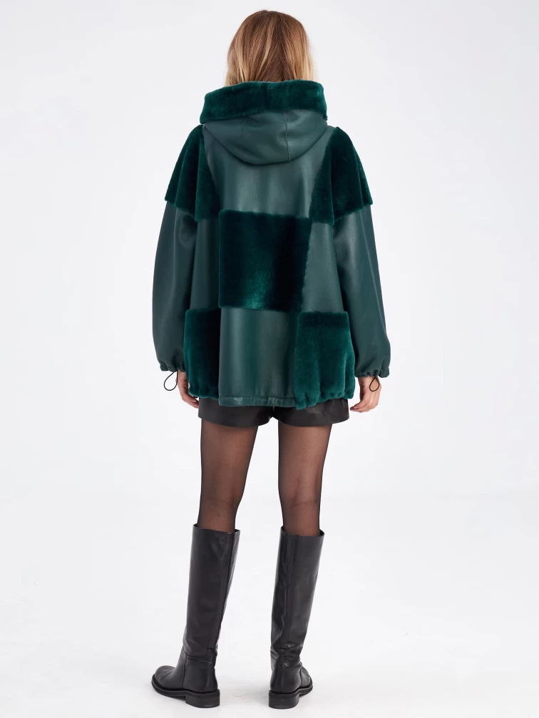 Зеленая куртка из овчины свободного кроя - удачный пример исключительно комфортной одежды для холодной погоды. Модель выполнили в комбинации овчины с меховой и кожаной поверхностью. За счет плотности меха, изделие великолепно сохраняет тепло. За защиту от ветра отвечает глубокий капюшон. Акцент сделали на накладные карманы дополненные декоративными крупными молниями.