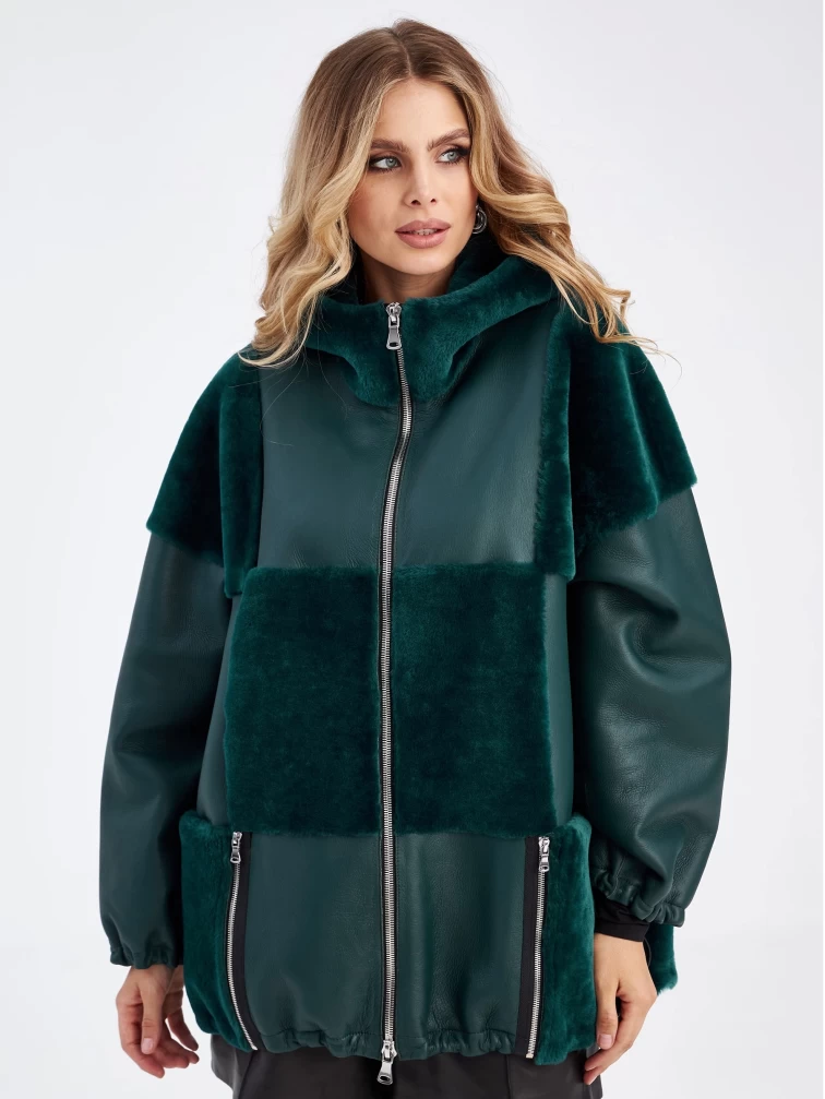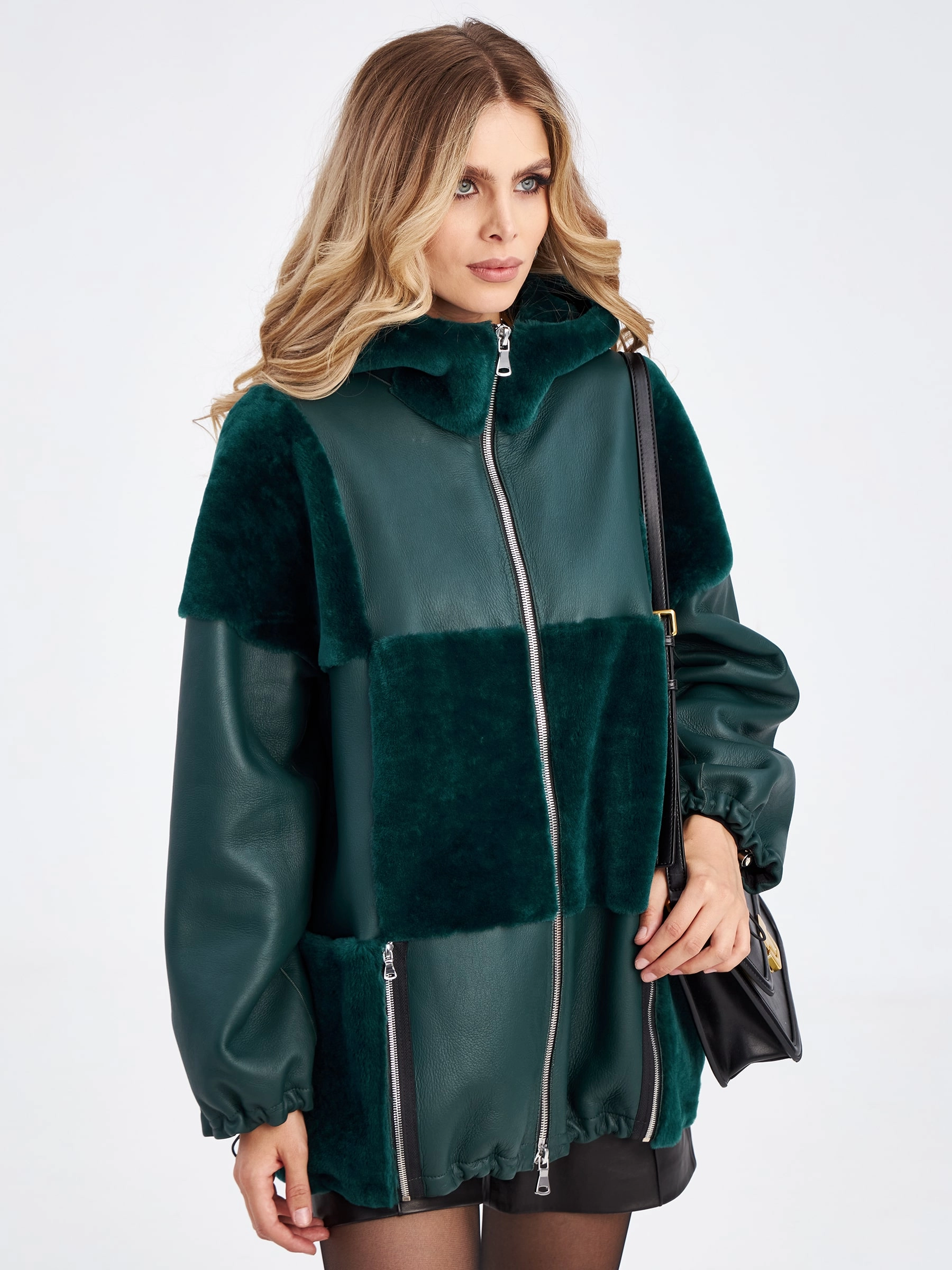 Товар комбинированная женская куртка из меховой овчины с капюшоном премиум класса 2039, зеленая, размер 42, артикул 63560 выполнен из овчина "мерино" с застежкой молния. Рассчитан на сезон: осень-зима. Длина изделия 74 см, силуэт прямой.