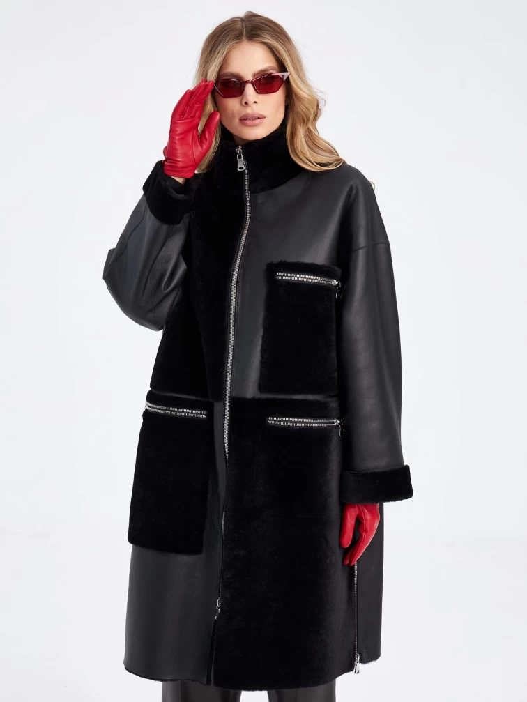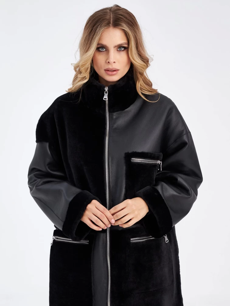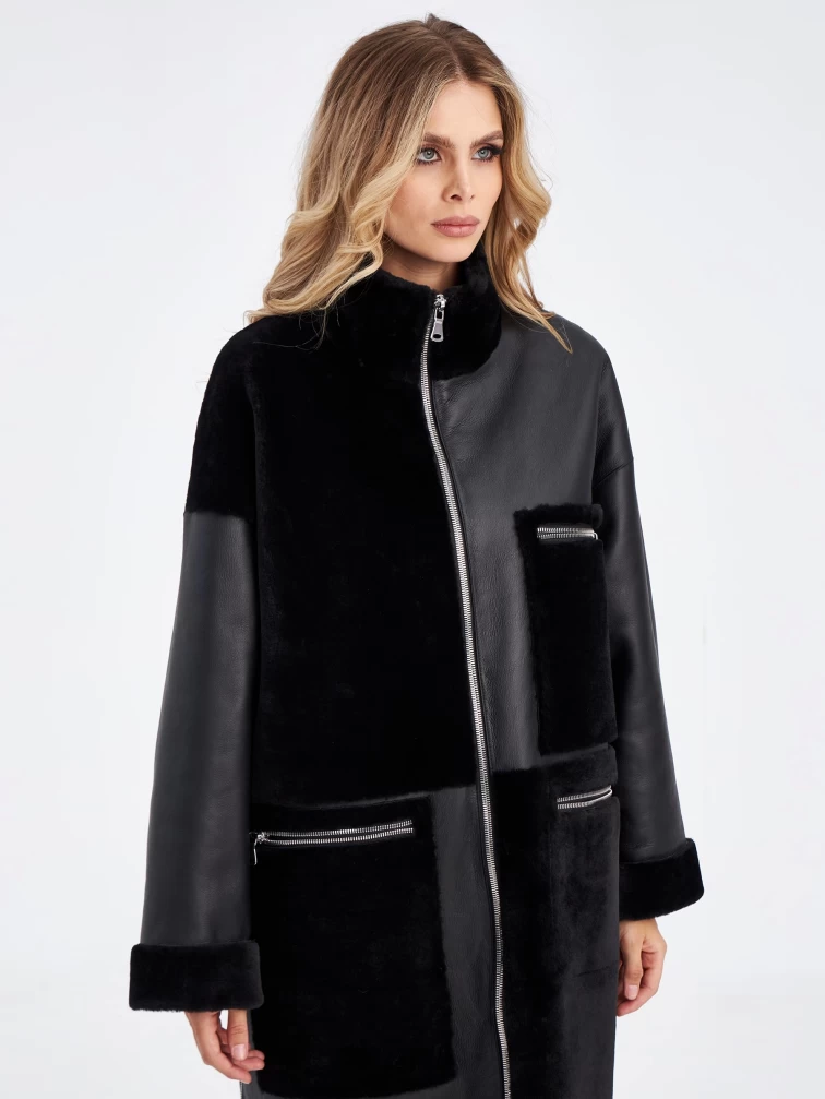 Комбинированное молодежное женское пальто из меховой овчины премиум класса 2044, черное, размер 48, артикул 63970