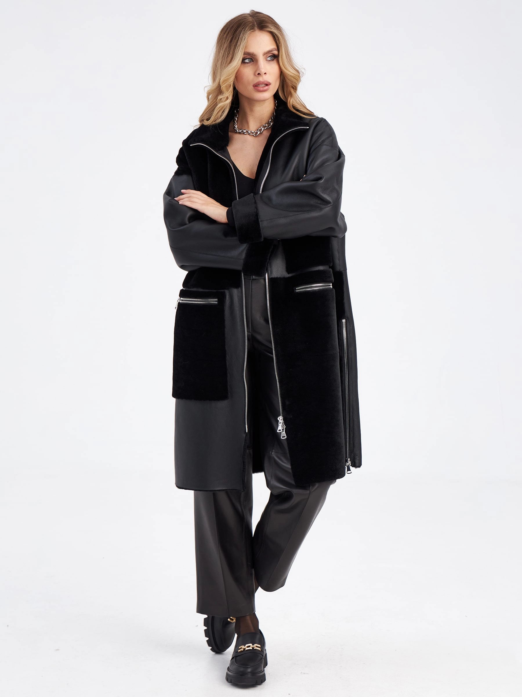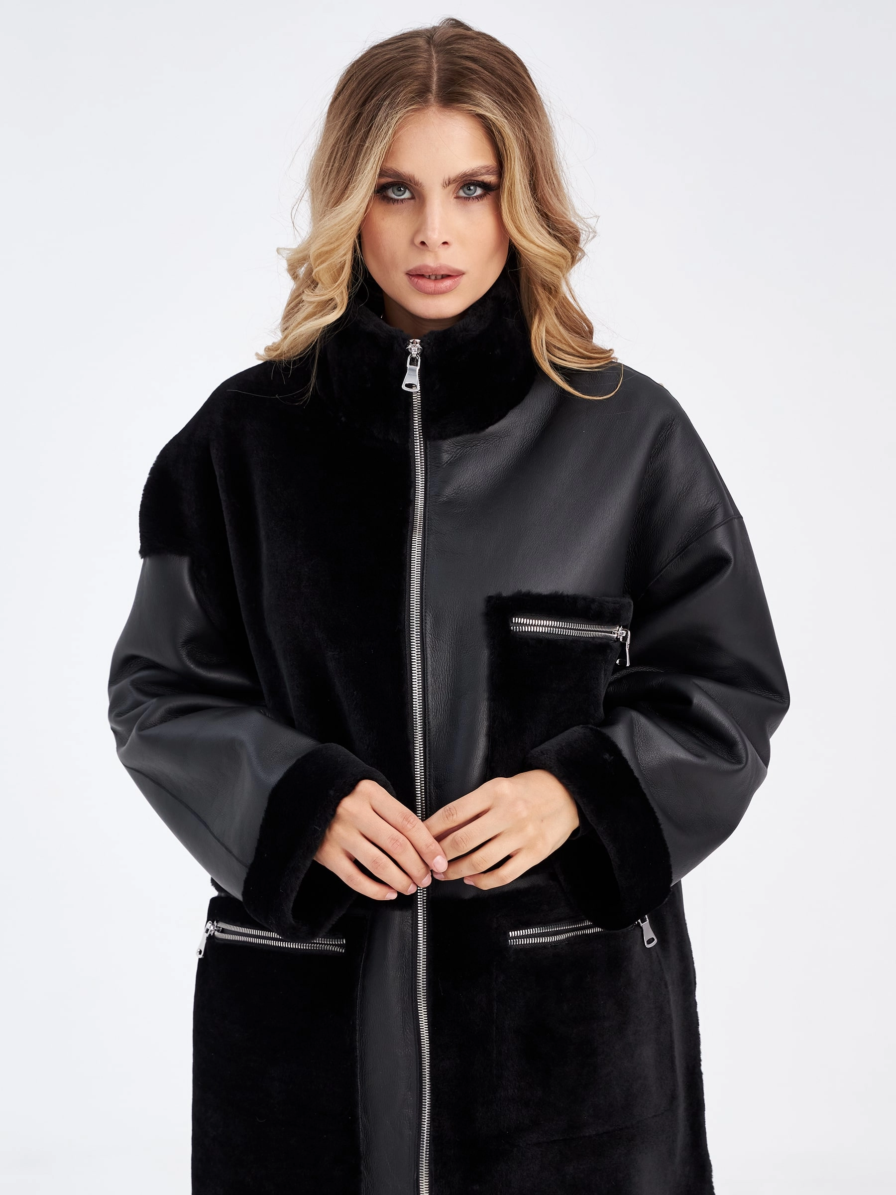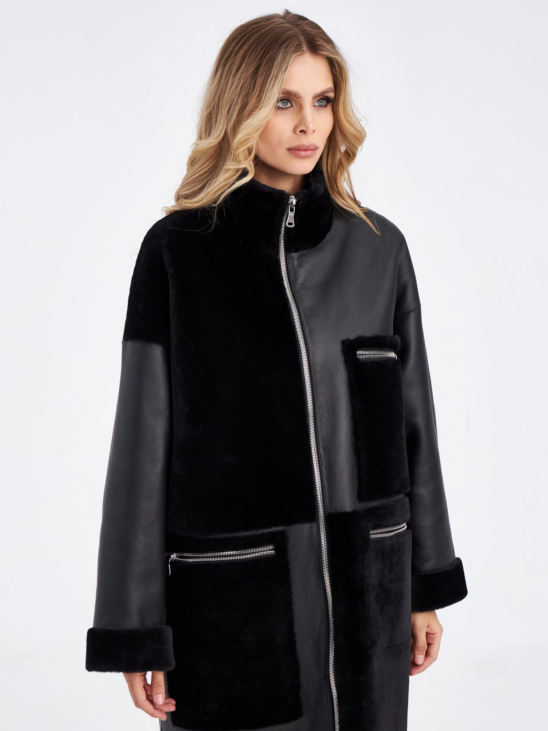 Товар комбинированное молодежное женское пальто из меховой овчины премиум класса 2044, черное, размер 48, артикул 63970 выполнен из овчина "мерино" с застежкой молния. Рассчитан на сезон: осень-зима. Длина изделия 110 см, силуэт прямой.