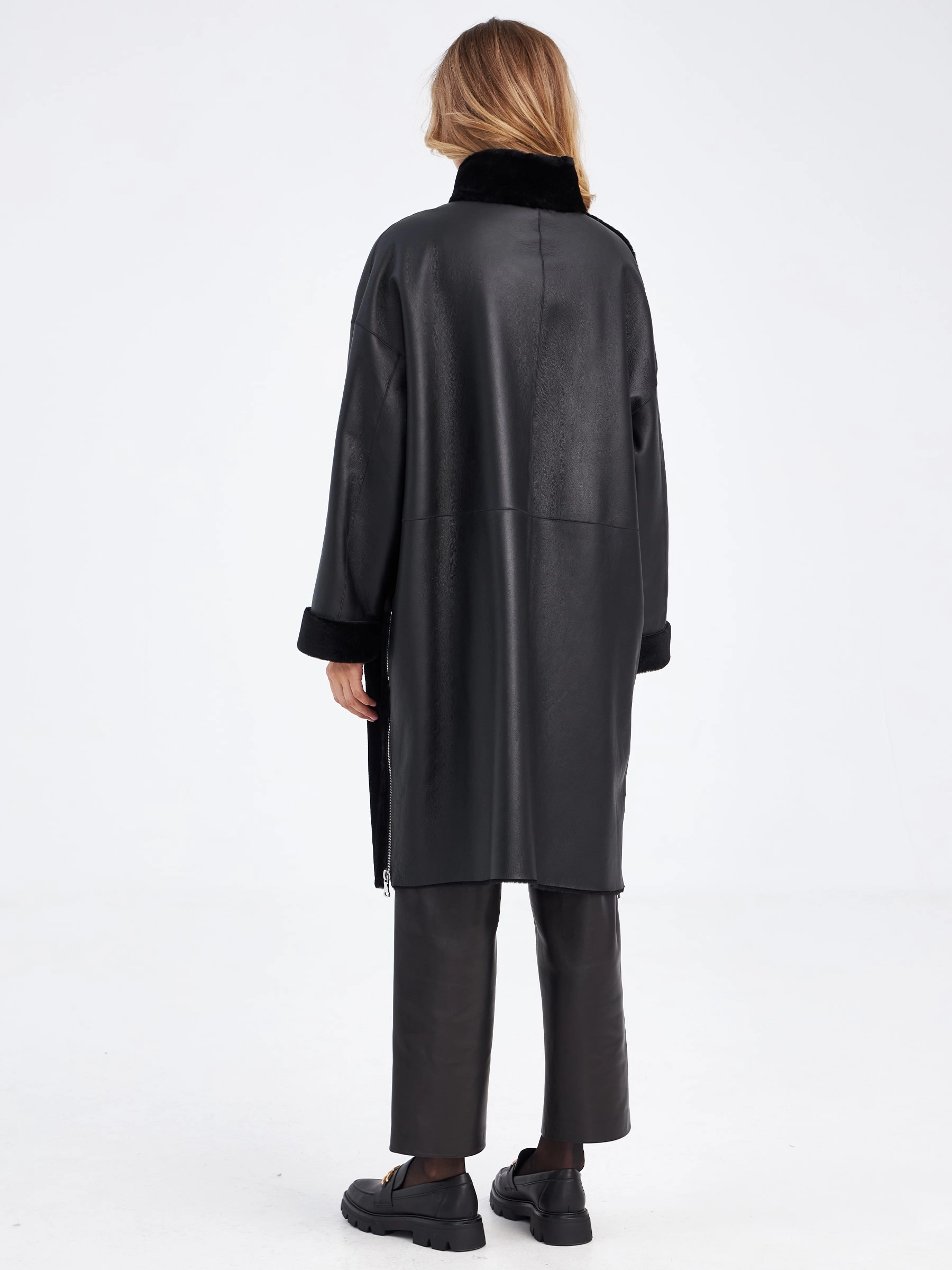 Для изготовления этого молодежного пальто прямого кроя, мастера выбрали плотную мягкую натуральную овчину. Материал разложили словно в шахматном порядке, чередуя изнаночную с лицевой стороной. Неповторимый комфорт и ощущение легкости читается в каждом движении. Накладные карманы, как и сама модель застегиваются на молнию.