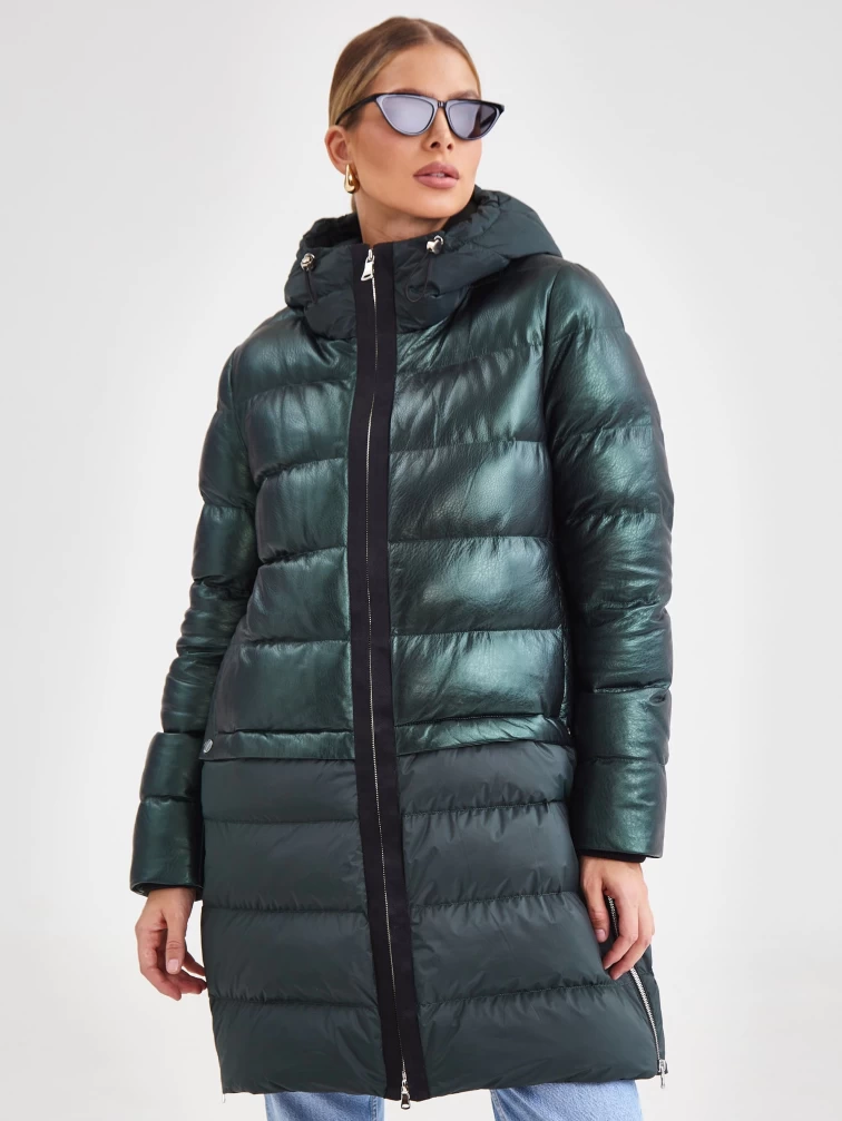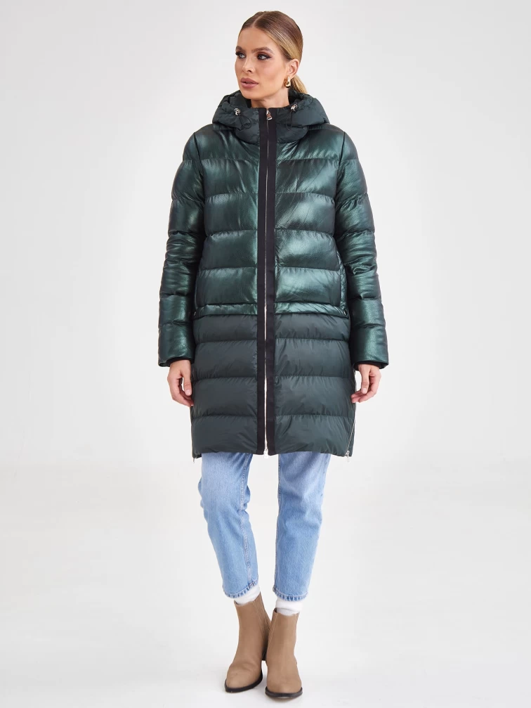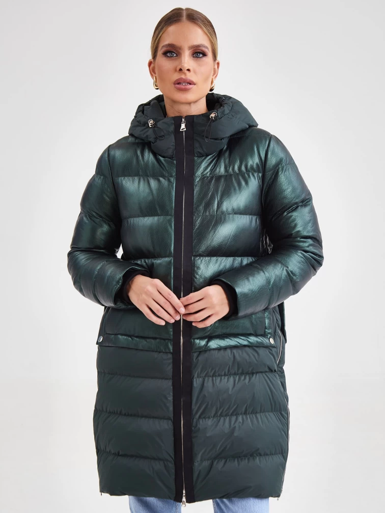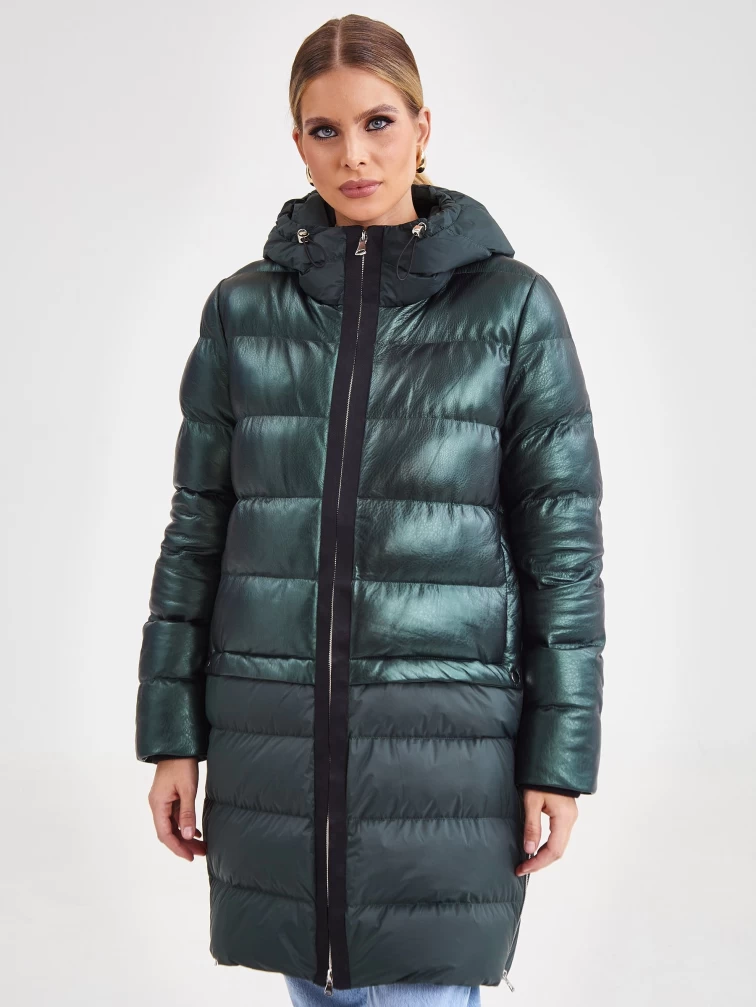 Товар комбинированный кожаный женский пуховик премиум класса 3049, размер 44, артикул 25460 выполнен из натуральной кожи с застежкой молния. Рассчитан на сезон: осень-зима. Длина изделия 90 см, силуэт прямой.