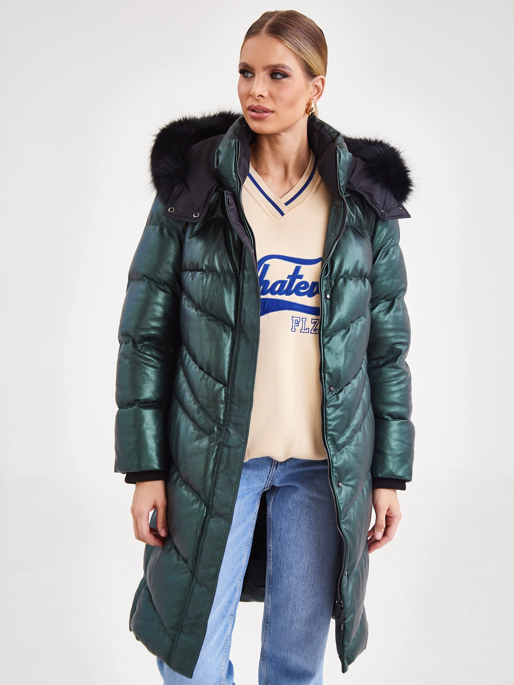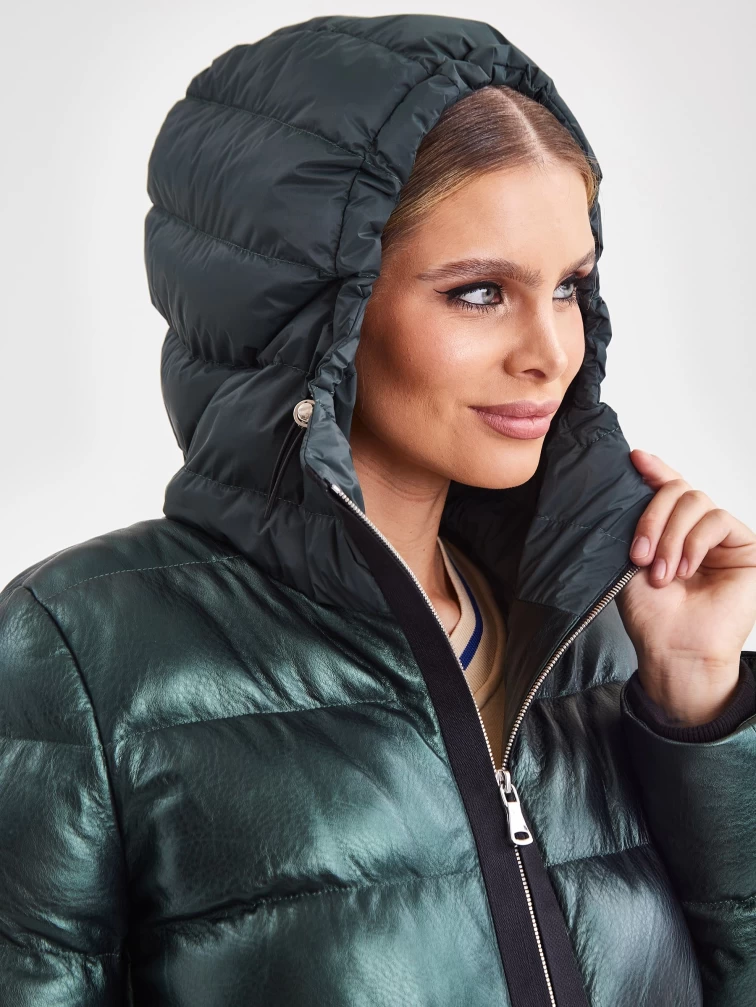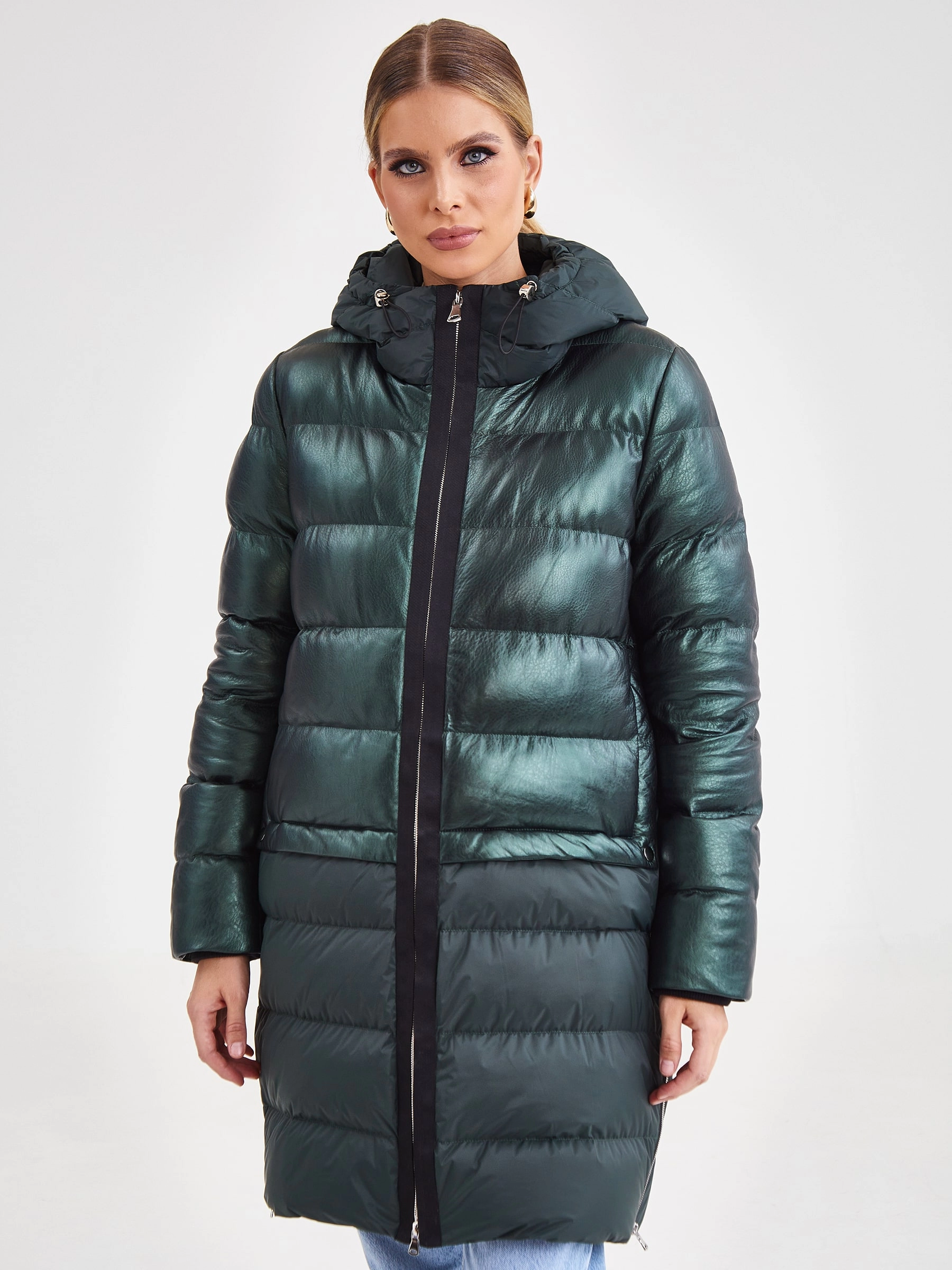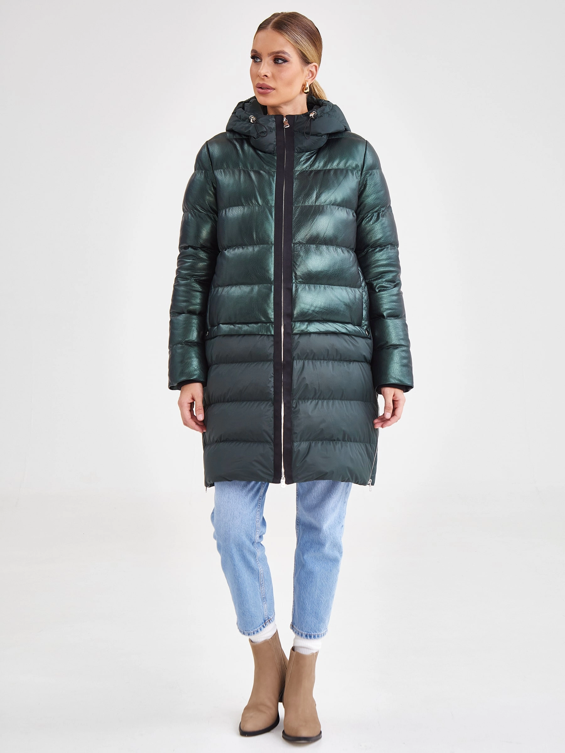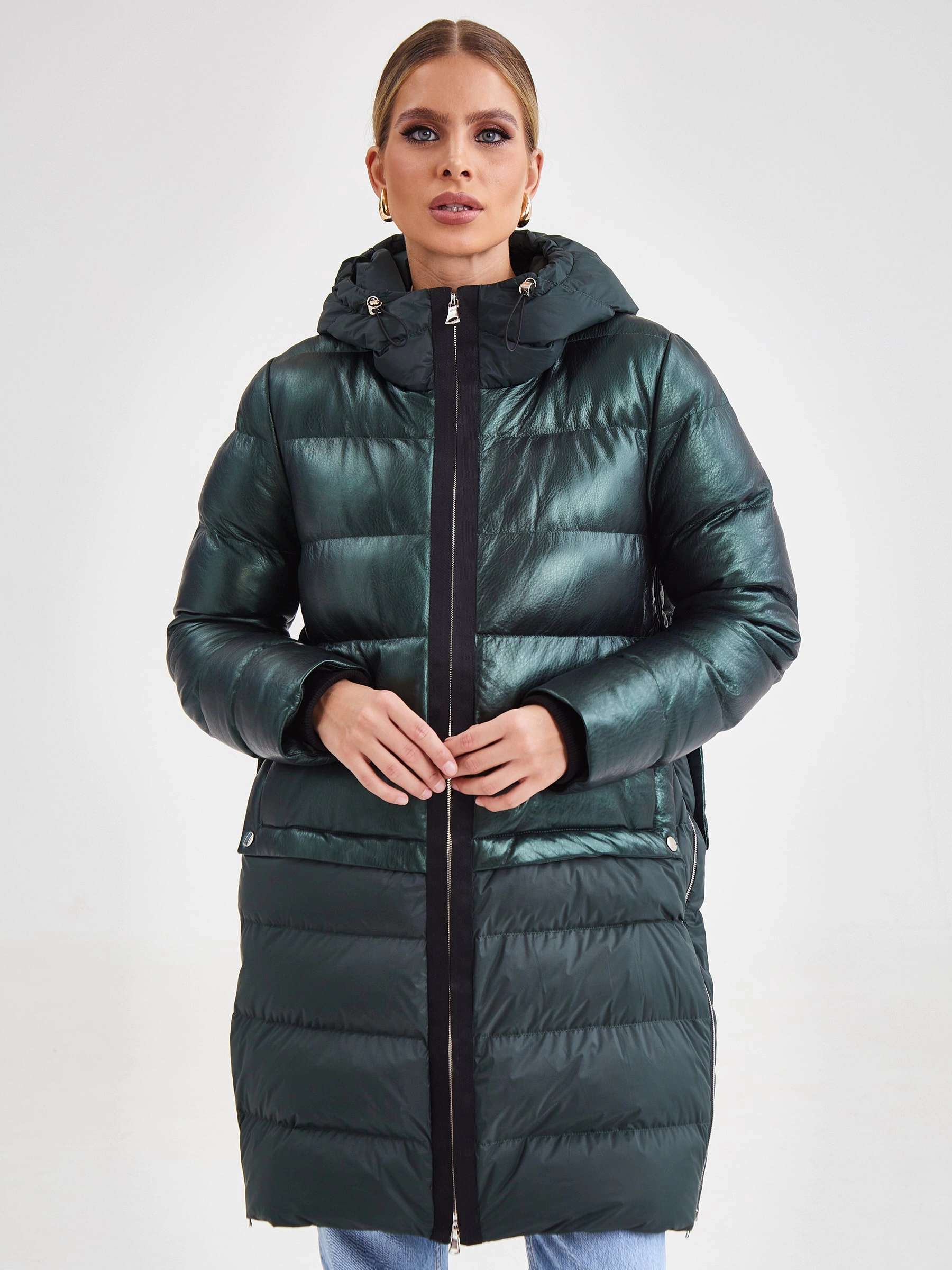 Комбинированный кожаный женский пуховик премиум класса 3049, размер 44, артикул 25460