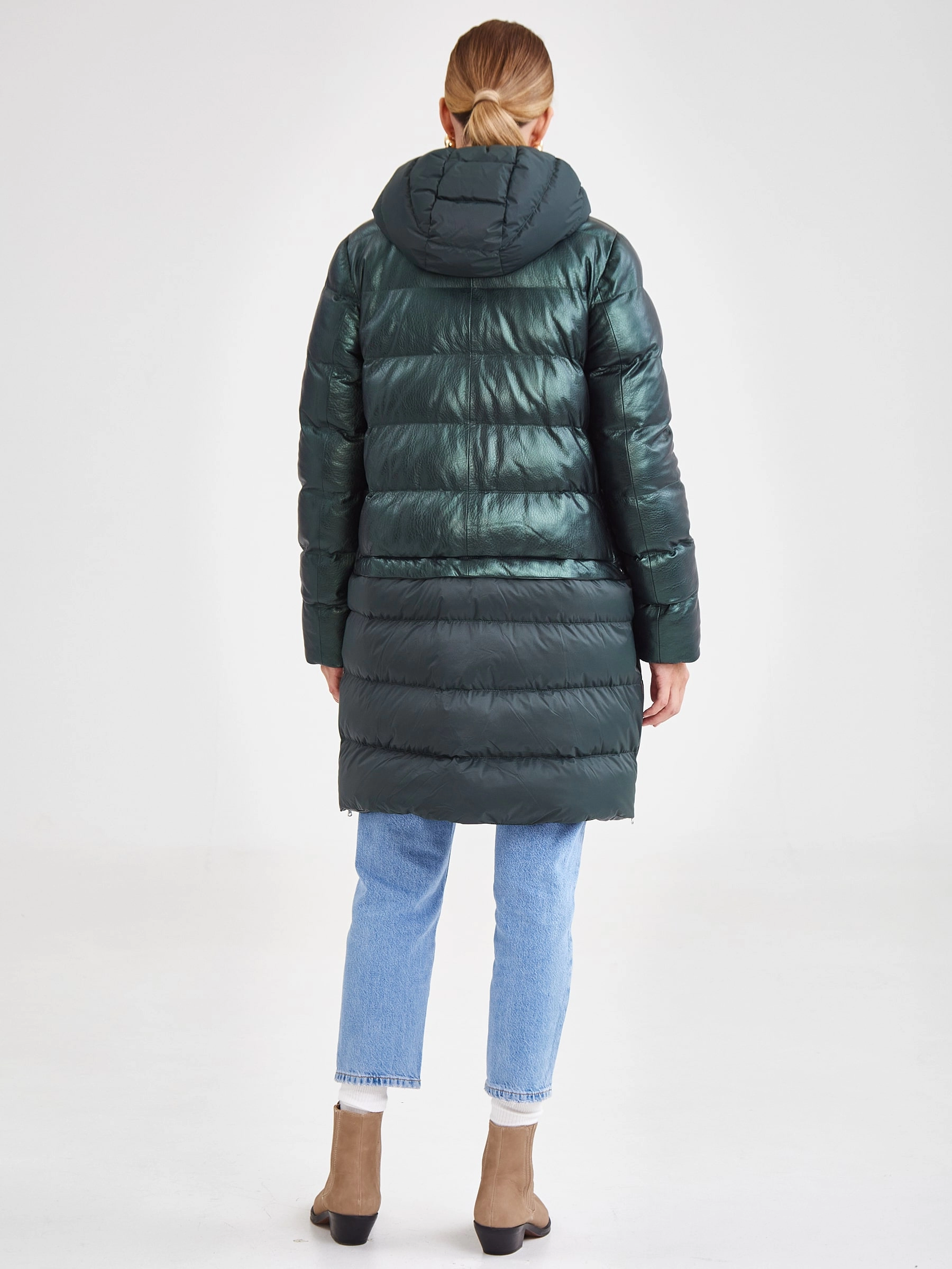 Прямой укороченный пуховик - отличное решение для холодной погоды. Изделие выполнили из мягкой натуральной кожи премиум класса в тандеме с тонкой плащевкой. Комфортная посадка по фигуре, глубокий капюшон фиксируется кулисками, боковые разрезы, как и само пальто застегиваются крупными молниями.