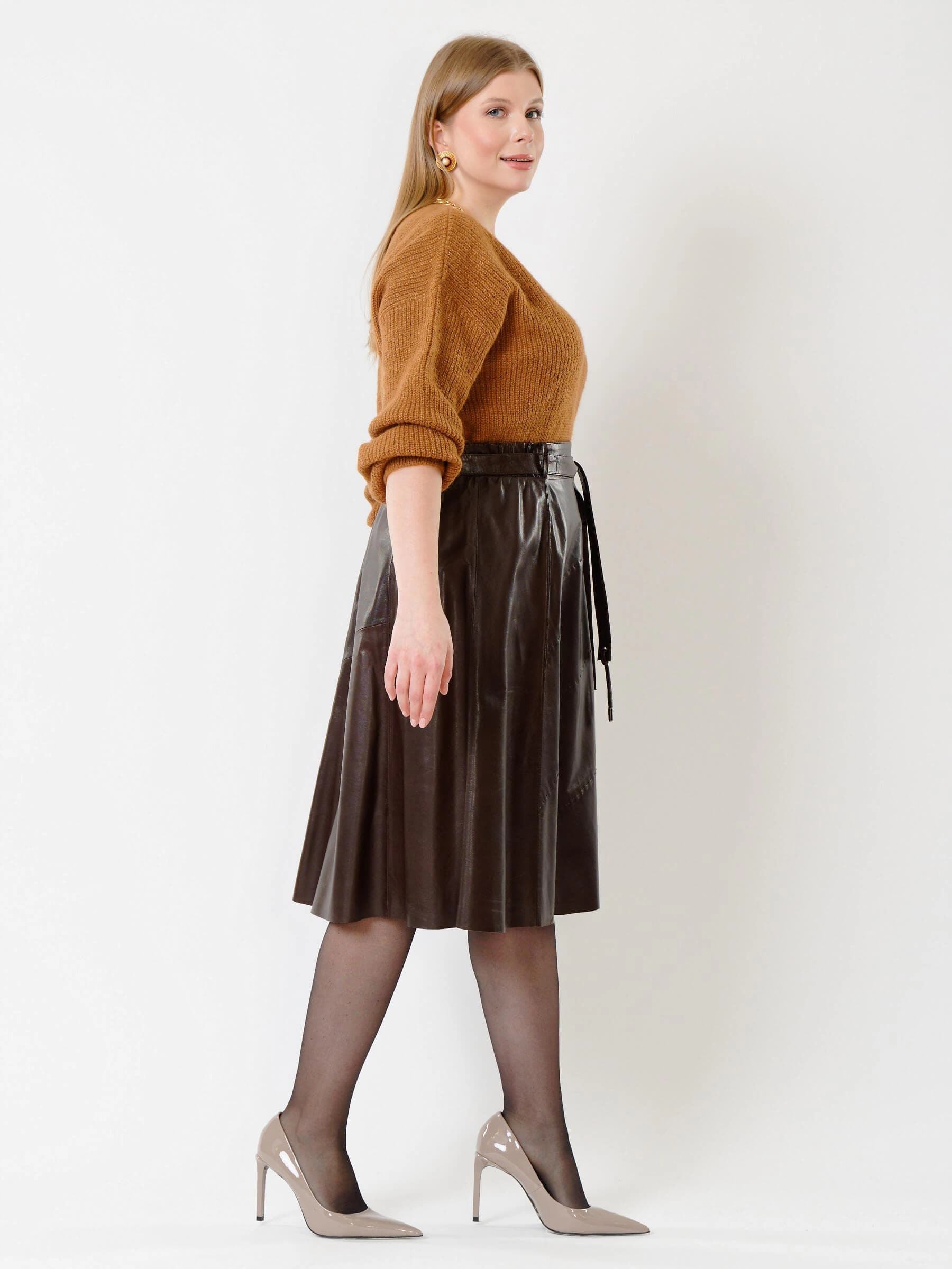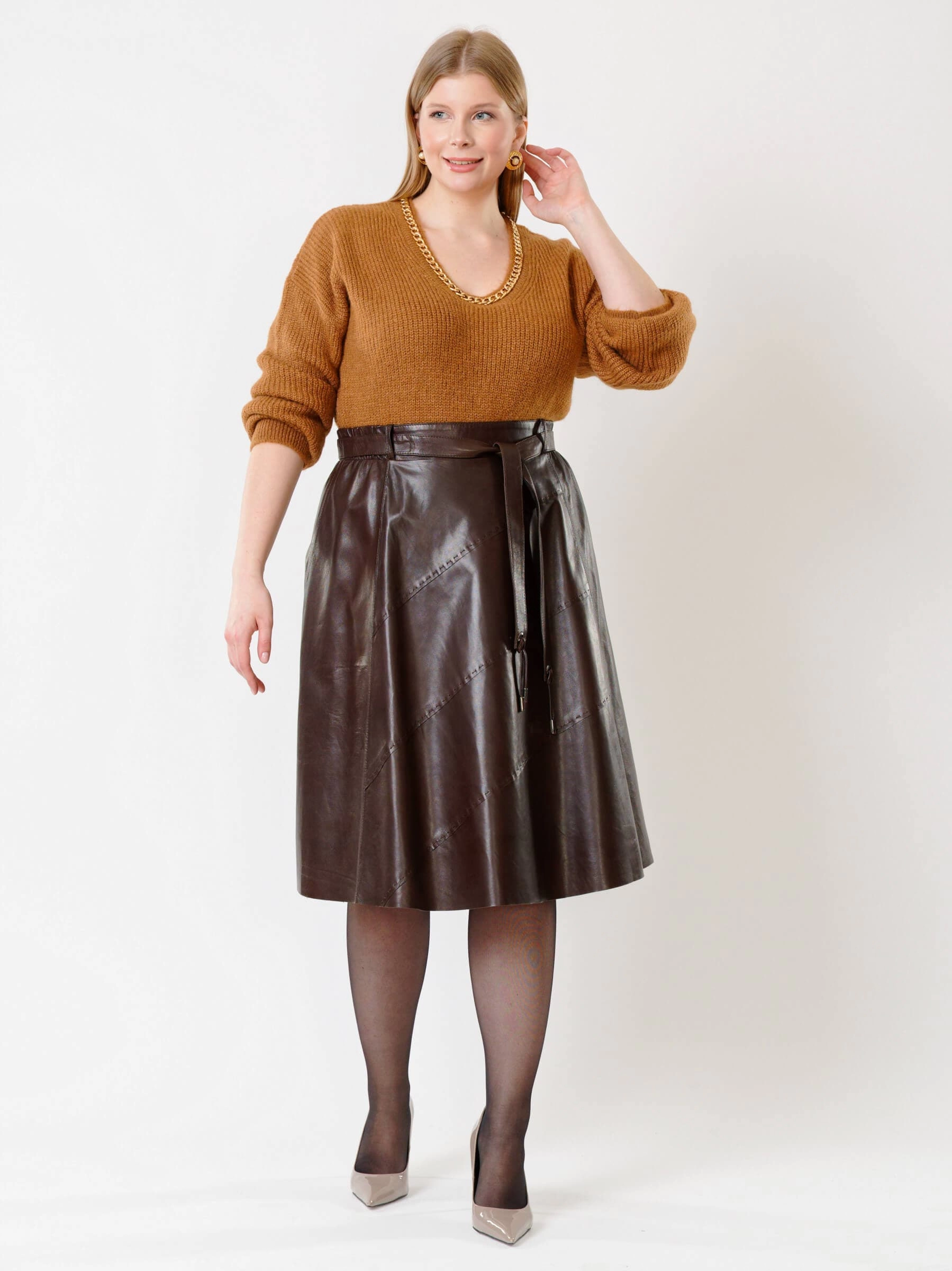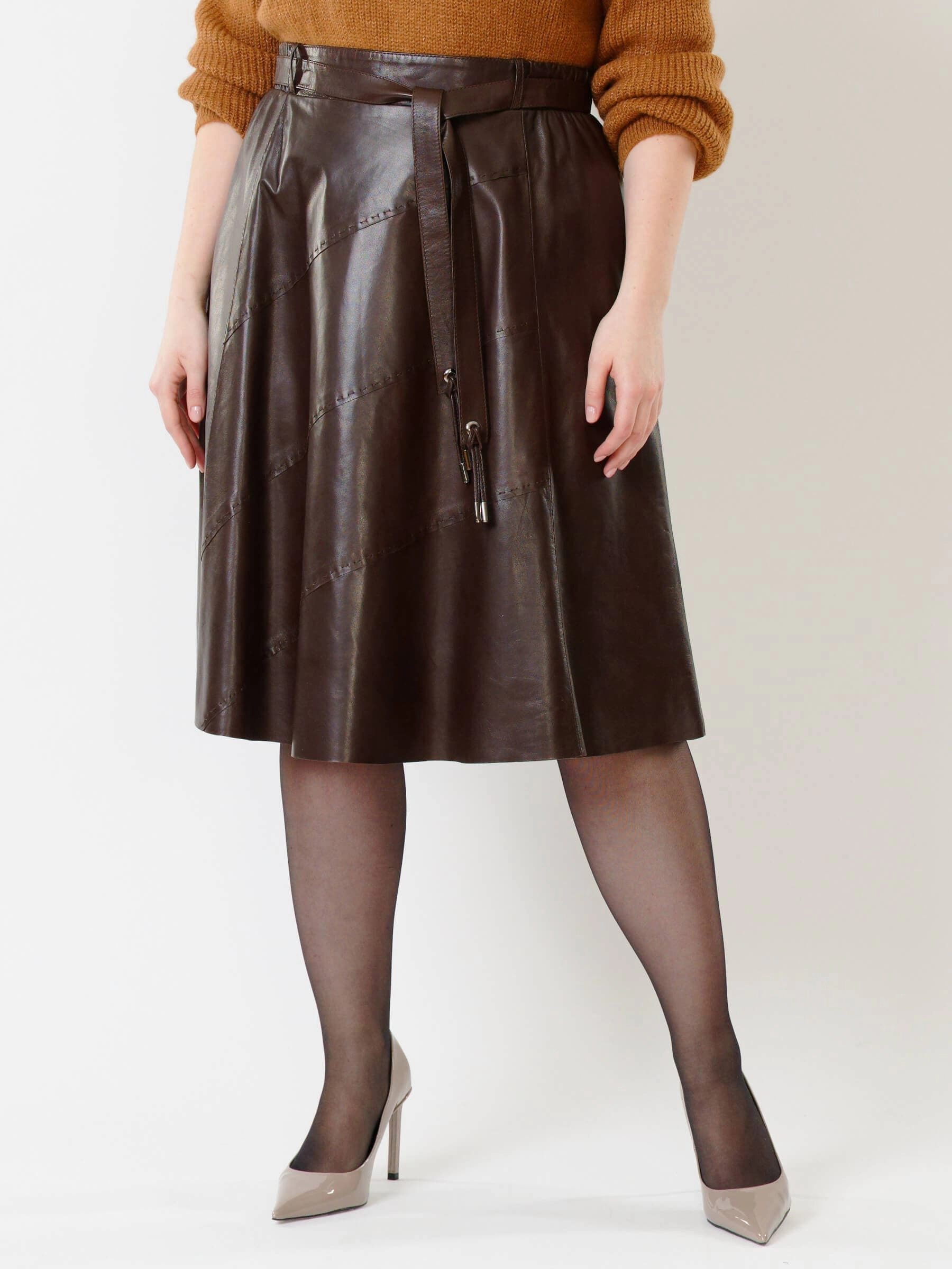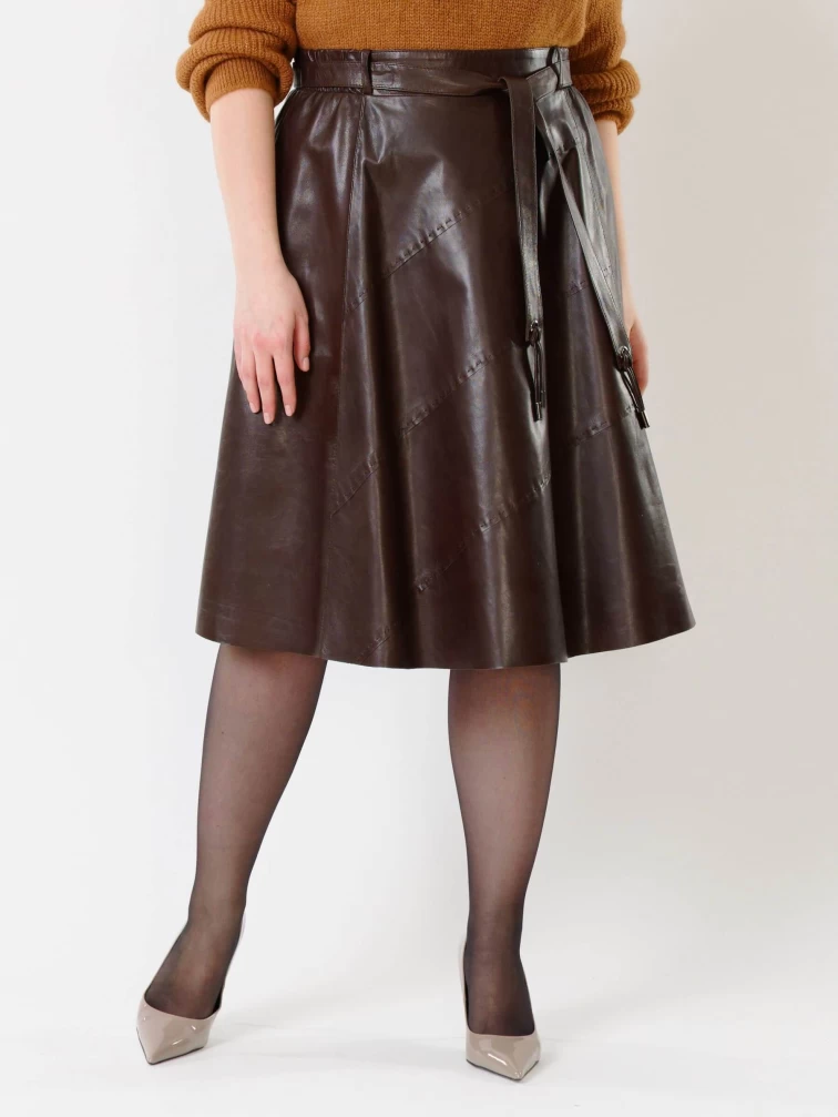 Товар коричневая кожаная юбка 01рс, размер 40, артикул 85132 выполнен из натуральной кожи с застежкой молния. Рассчитан на сезон: демисезон. Длина изделия 70 см, силуэт расклешенный.