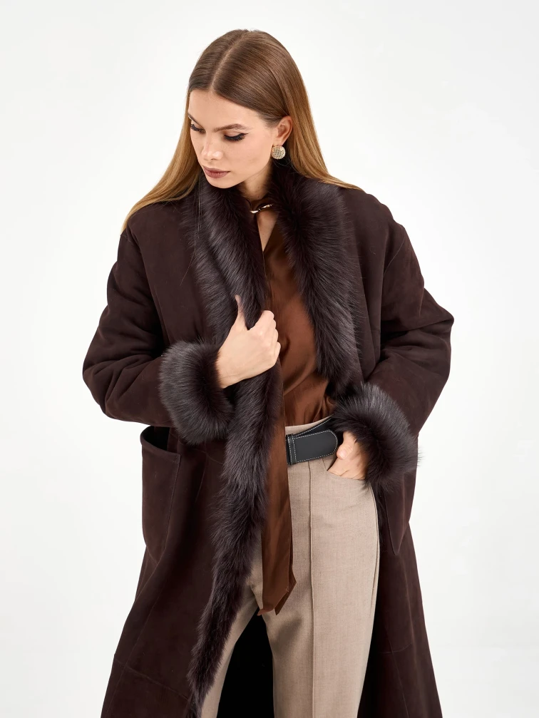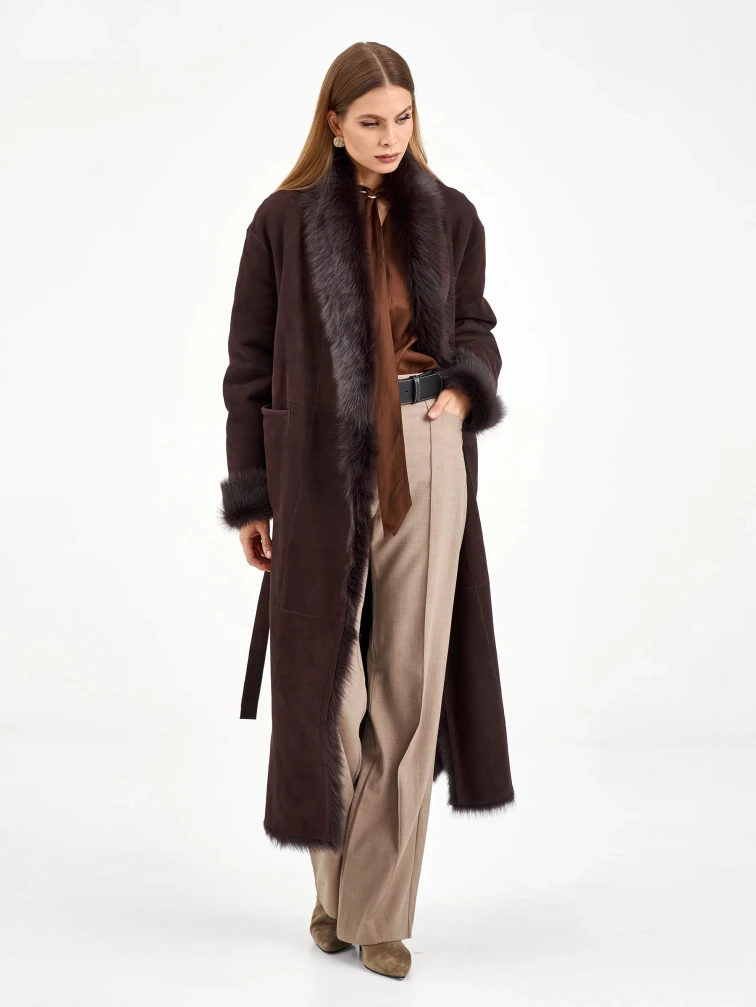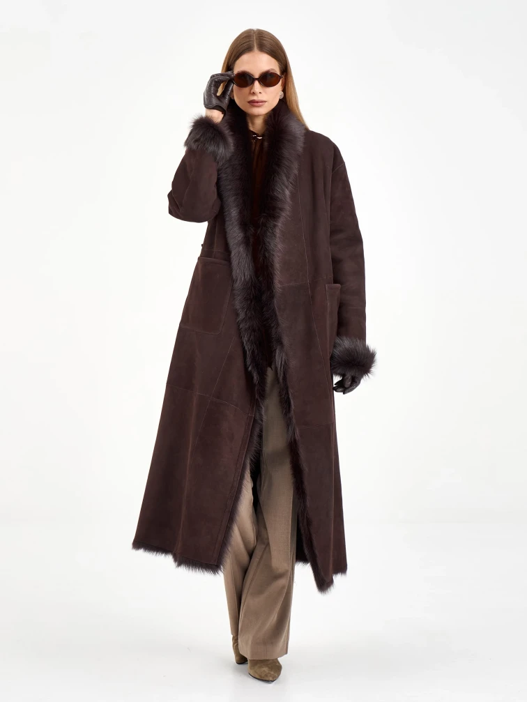 Товар коричневая женская дубленка из тосканы 2020, коричневая, размер 42, артикул 65090 выполнен из тосканская овчина с застежкой без застежки. Рассчитан на сезон: зима. Длина изделия 128 см, силуэт свободный.