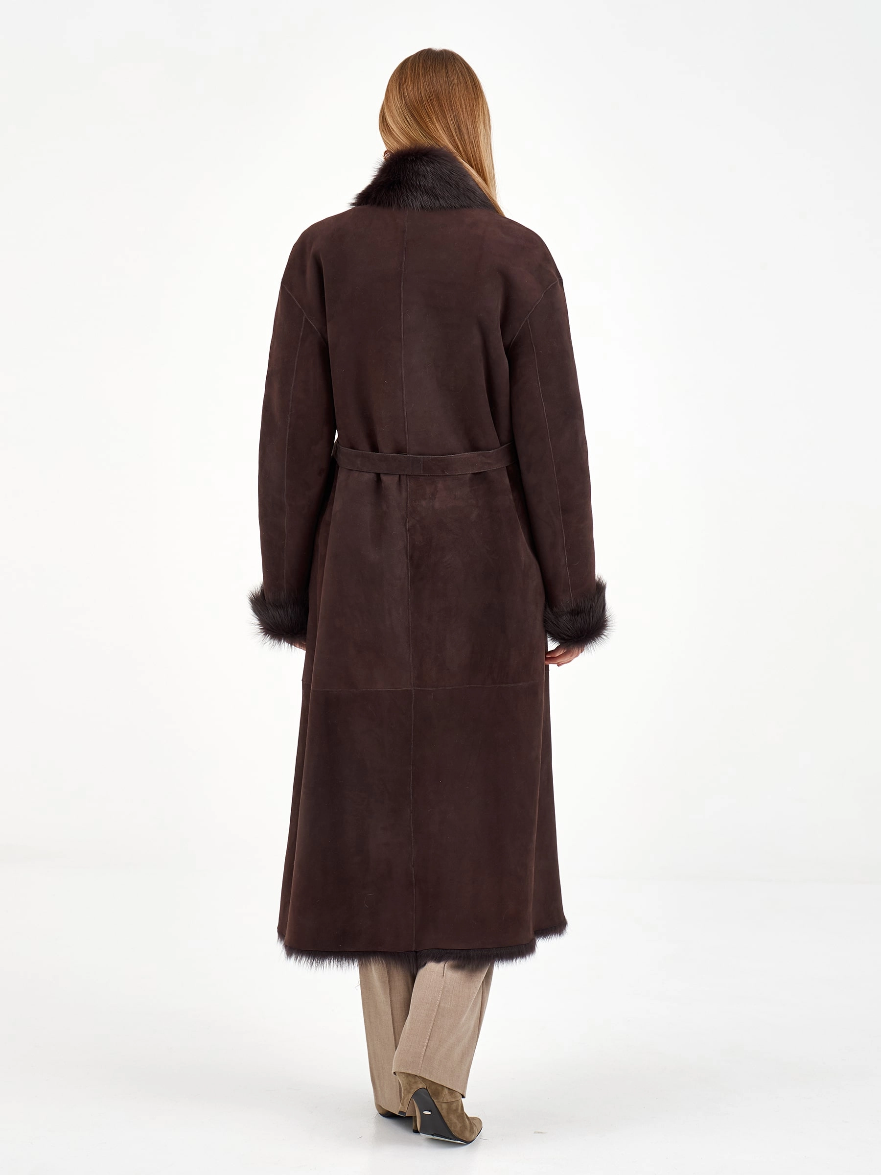 Эта длинная дубленка из натуральной овчины без капюшона воплощает современную классику. Свободный силуэт и запах, фиксируемый поясом, дарят комфорт и универсальность. Благодаря роскошной тосканской овчине и шалевидному воротнику модель выглядит по-настоящему дорого. Для создания законченного образа наденьте ее с водолазкой, кожаными брюками и уггами — это идеальный ансамбль для города в холодные дни.