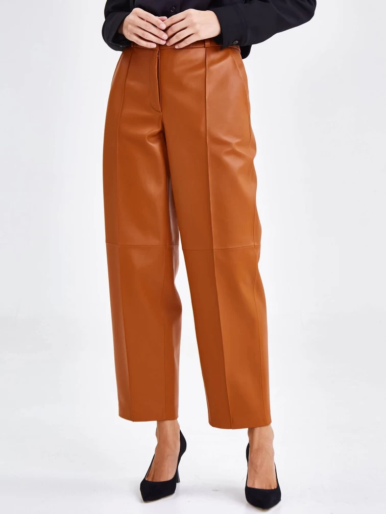 Создать эффектный образ помогут брюки со стрелками из натуральной кожи премиум-класс. Прямой крой, средняя посадка, удобные боковые карманы.