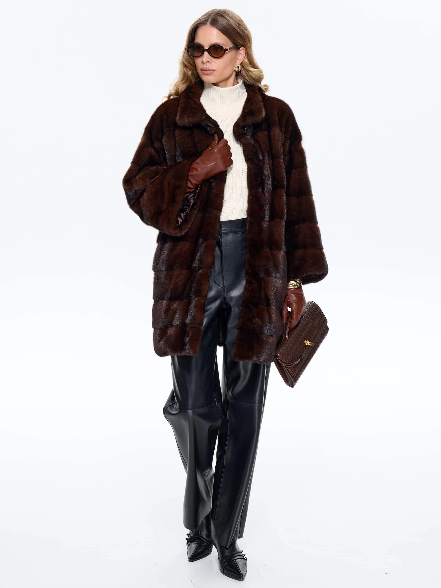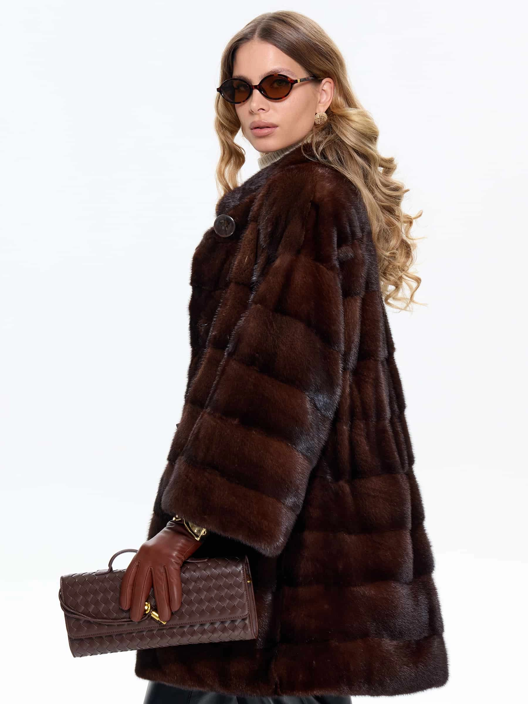 Короткую шубу в универсальной длине выполнили из густой коричневой норки премиум-класса в диагональной раскладке, где ручная сортировка шкурок гарантирует безупречный глянцевый блеск, равномерную плотность и шелковистую текстуру меха. Спущенный крой рукавов создает модный силуэт с мягкой линией плеч, который маскирует сутулость, добавляет образу легкости и не ограничивает подвижность, делая модель идеальной для активной городской жизни. Воротник-стойка надежно защищает от ветра и гармонично сочетается с любыми аксессуарами, а скрытые клипсы обеспечивают надежную фиксацию без повреждения меха, сохраняя чистоту линий фасона. Модель дополнена двумя удобными боковыми карманами и широким кожаным поясом для акцента на талии.