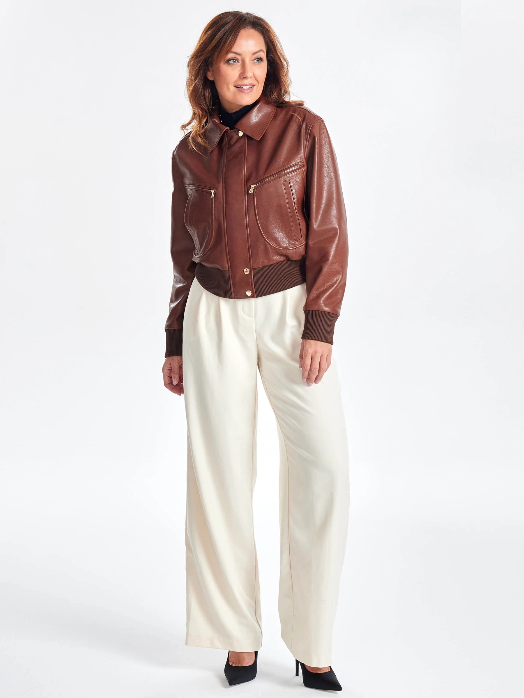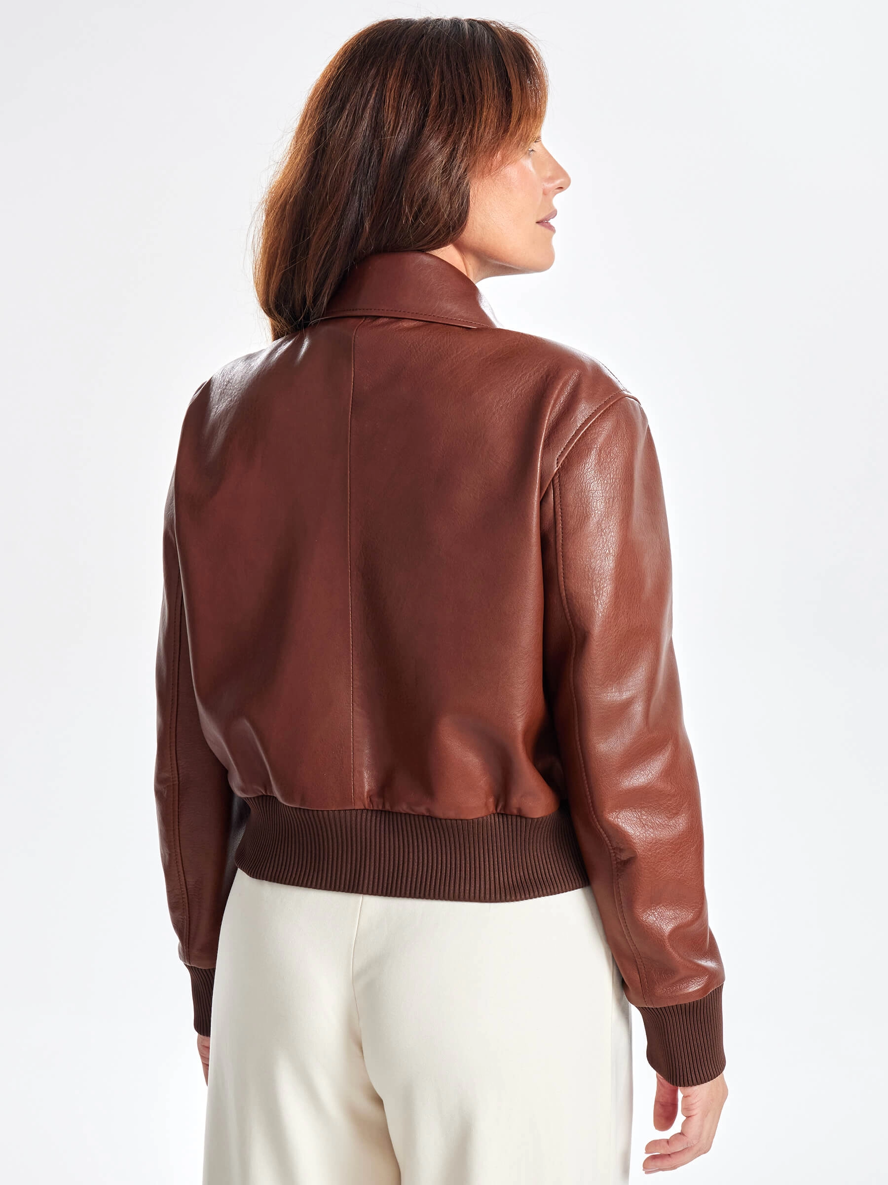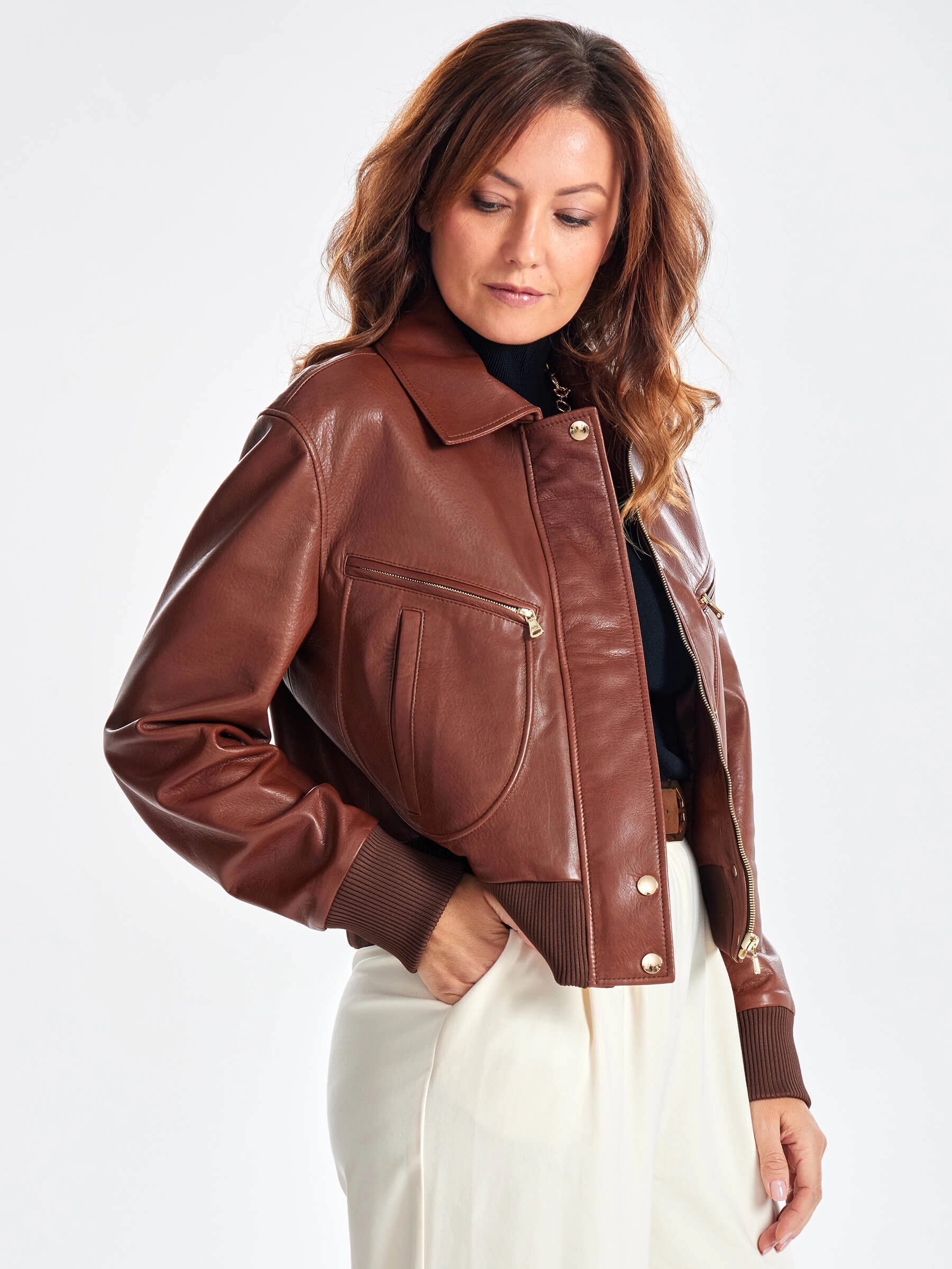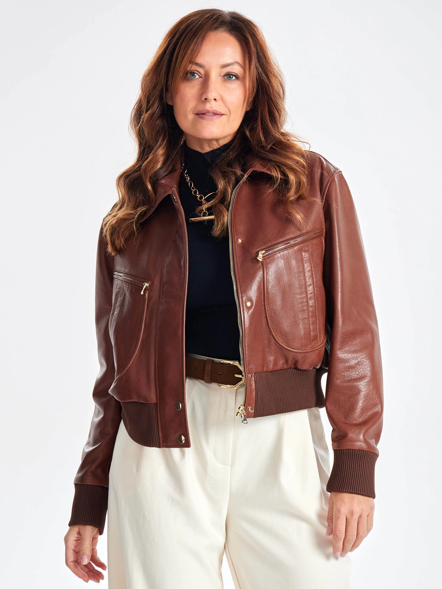 Короткая кожаная куртка-бомбер для женщин премиум-класса — идеальный выбор для межсезонья: для пошива свободной модели с отложным воротником и четырьмя карманами использовали мелкозернистую кожу премиум-класса, а тонкая выделка сделала материал мягким и пластичным, благодаря чему куртка длиной 53 см комфортно садится по фигуре и не ограничивает движения, создавая спортивный расслабленный силуэт со спущенным плечом. Продуманные детали обеспечивают функциональность и стиль — четыре вместительных кармана добавляют практичности, встречная застежка-молния с широкой планкой надежно защищает от ветра, а трикотажные резинки на манжетах и поясе завершают образ классического бомбера; подкладка из 100% полиэстера гарантирует комфорт в прохладные дни весной и осенью. Совет стилиста: кожаный бомбер свободного кроя — универсальный элемент гардероба, который одинаково хорошо смотрится как с повседневными вещами вроде джинсов и кроссовок, так и с более женственными комплектами — попробуйте надеть его поверх легкого платья-ми