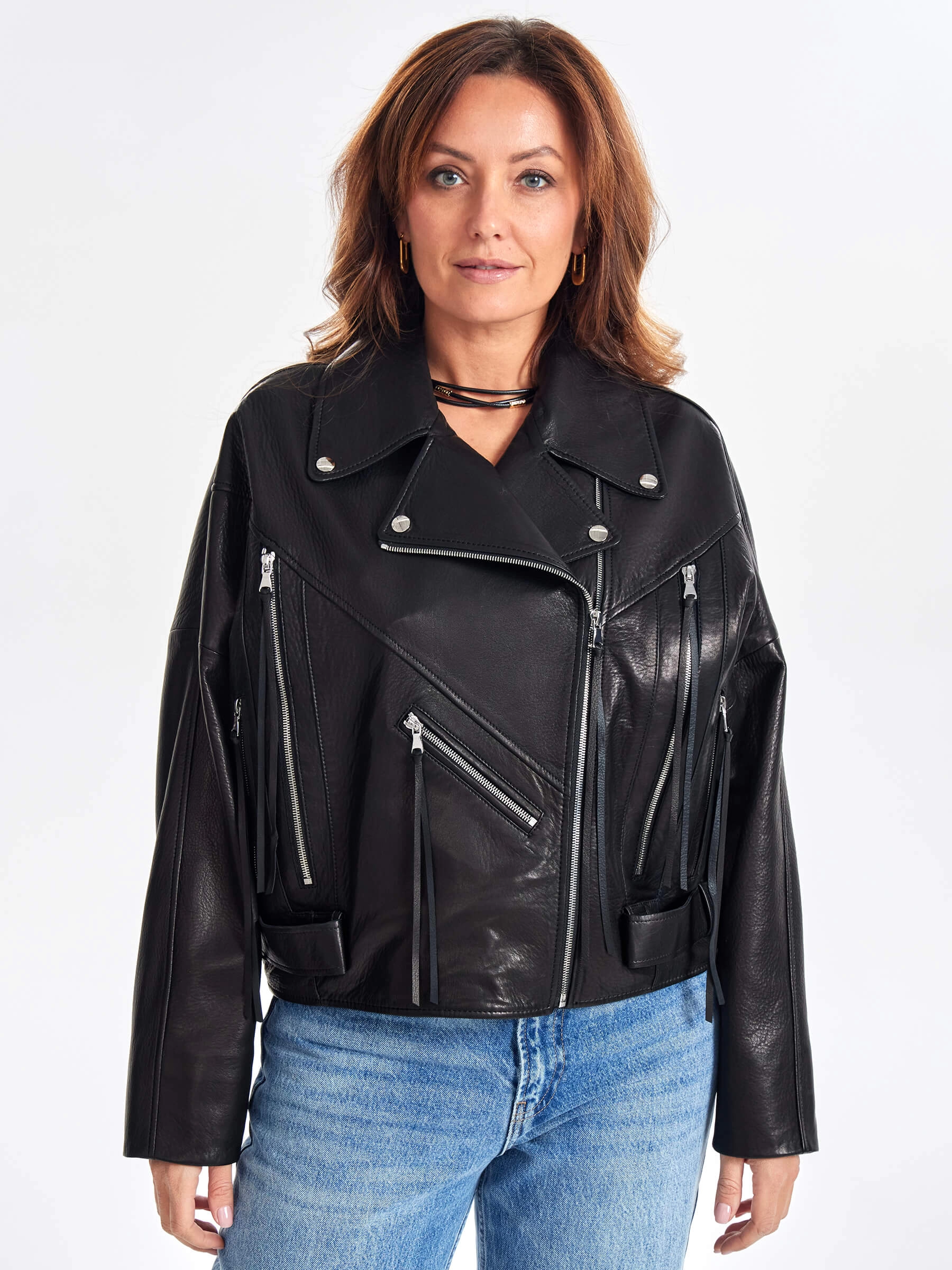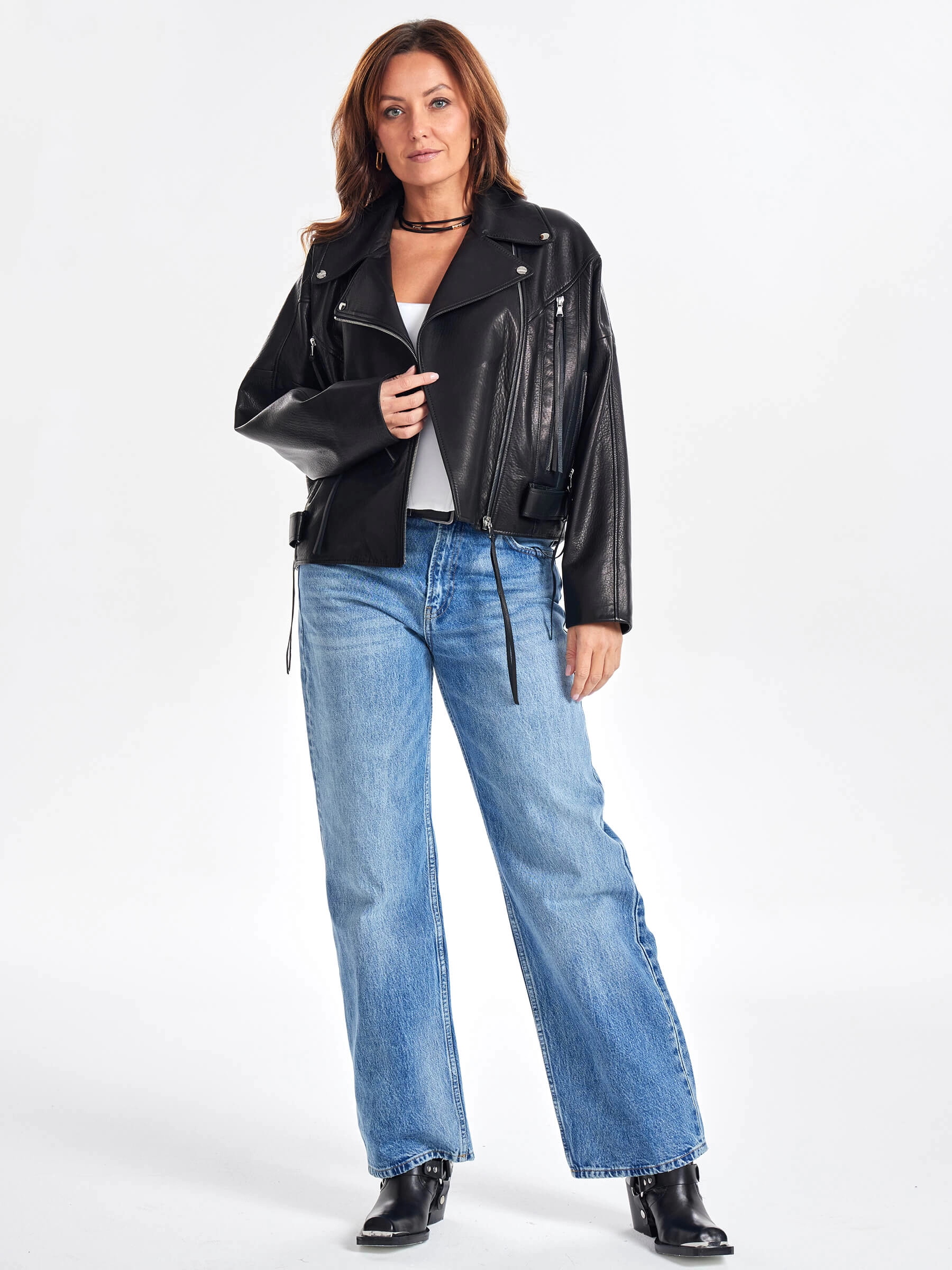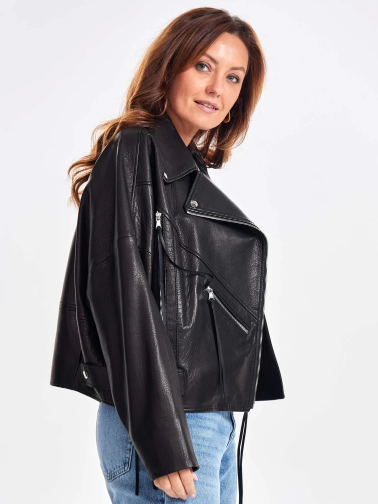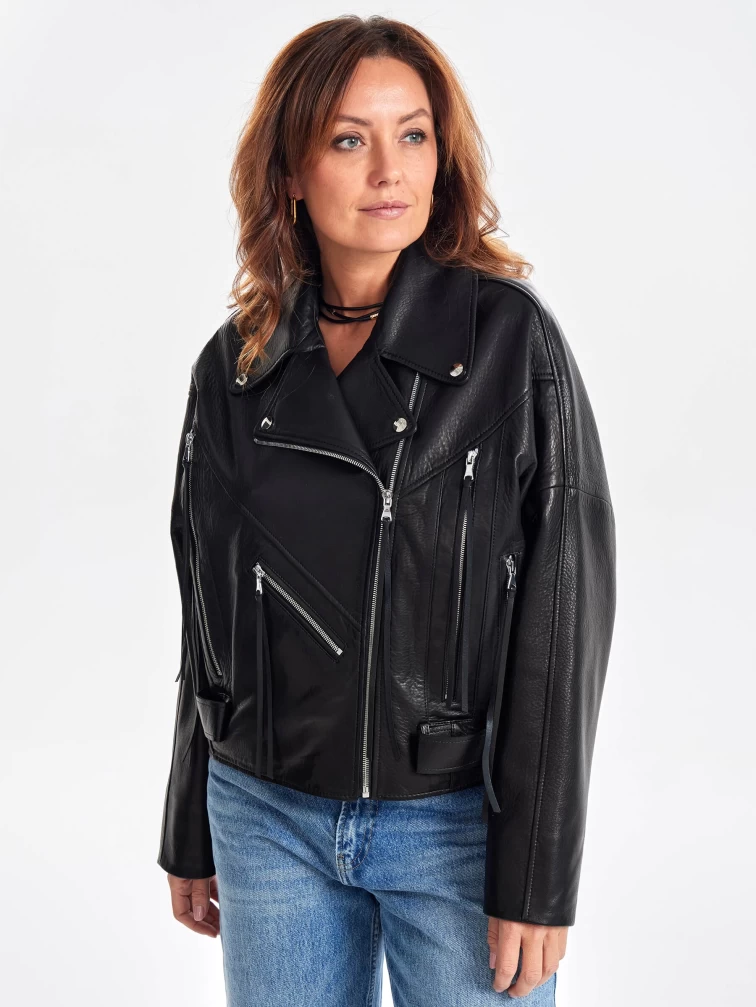 Свободную косуху со спущенной линией плеч выполнили из мелкозернистой кожи премиум класса. Благодаря бережной выделки материала, изделие получилось пластичным и комфортным. Модель дополнили широкими регулируемыми патами и множеством молний.
