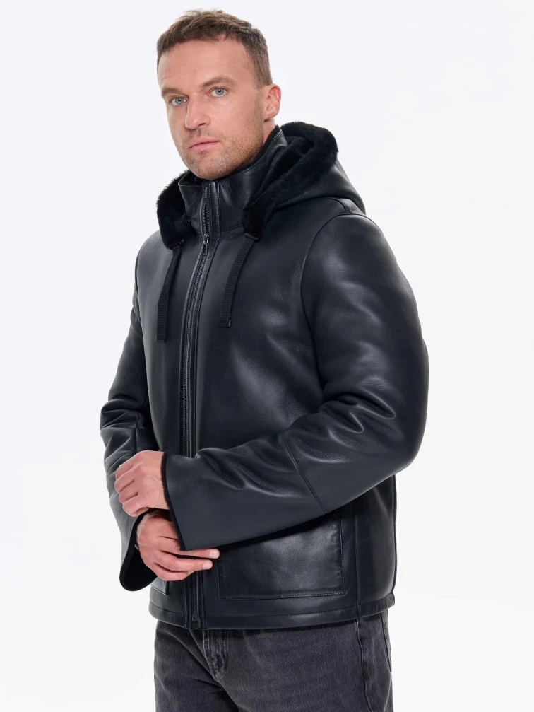 Товар короткая мужская дубленка с капюшоном премиум класса 441, черная, размер 48, артикул 41230 выполнен из овчина "мерино" с застежкой молния. Рассчитан на сезон: зима. Длина изделия 68 см, силуэт прямой.