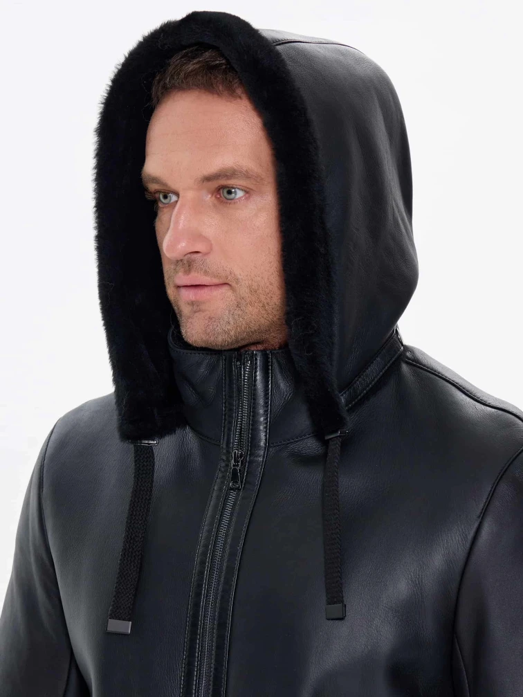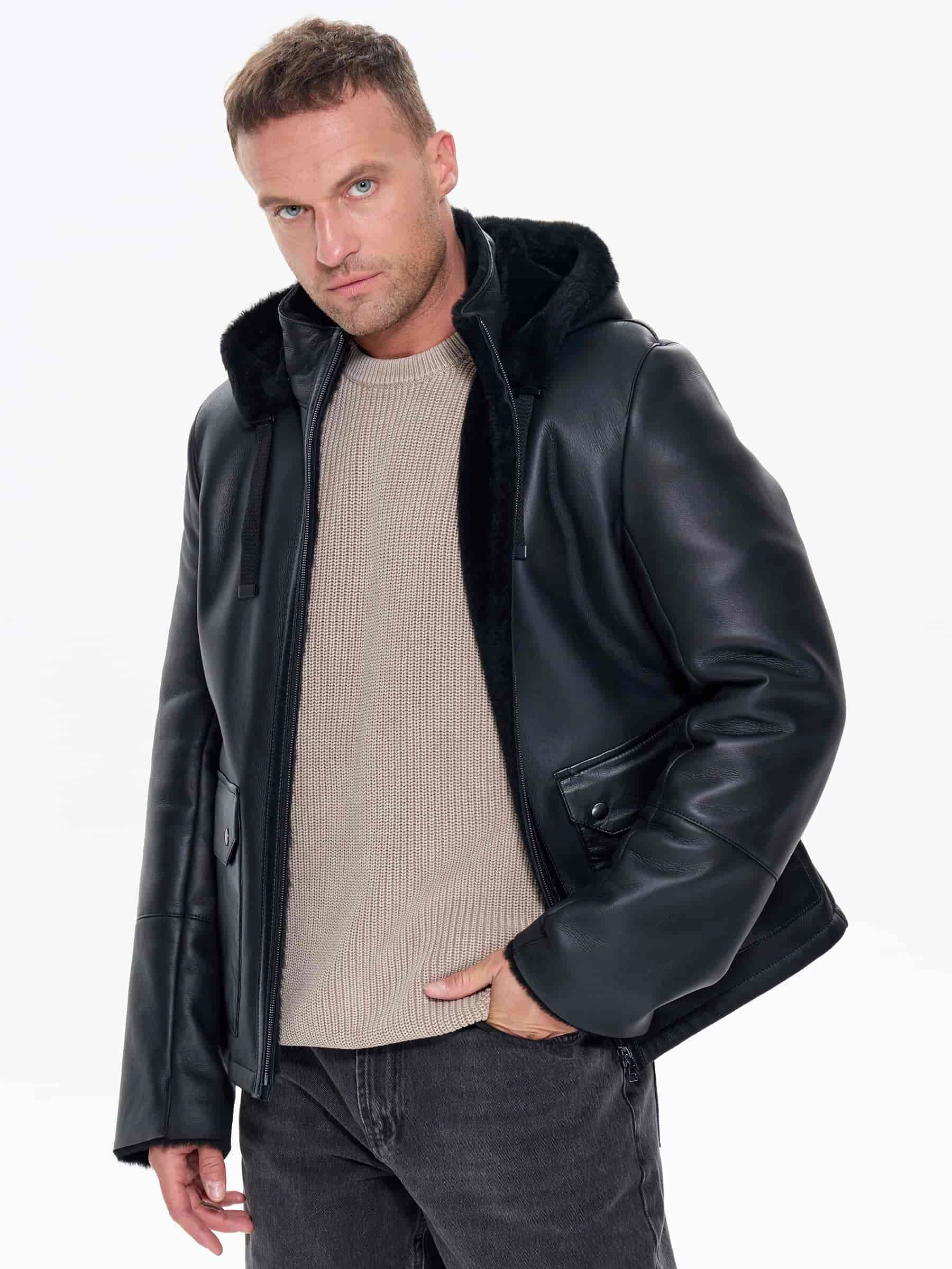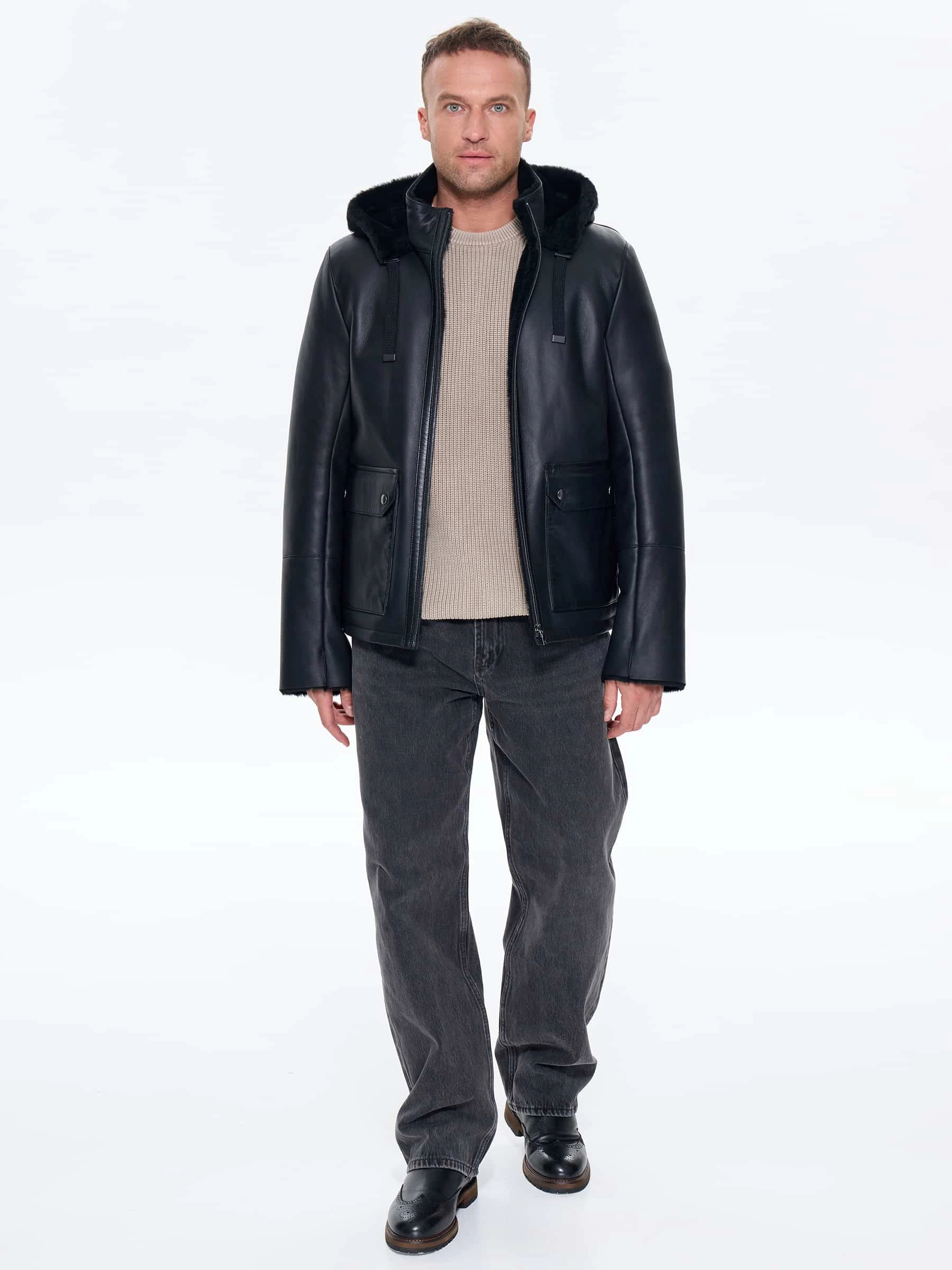 Короткая мужская дубленка с капюшоном премиум класса 441, черная, размер 48, артикул 41230