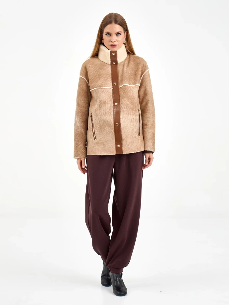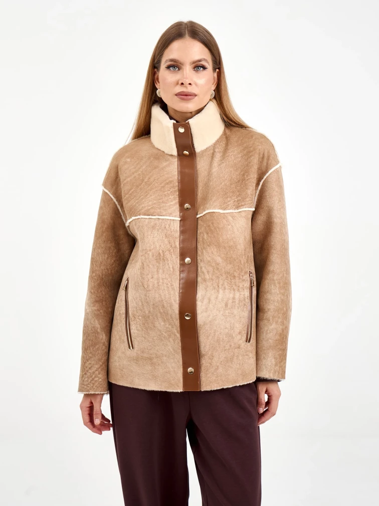 Короткая женская дубленка 2074, бежевая, размер 44, артикул 65250
