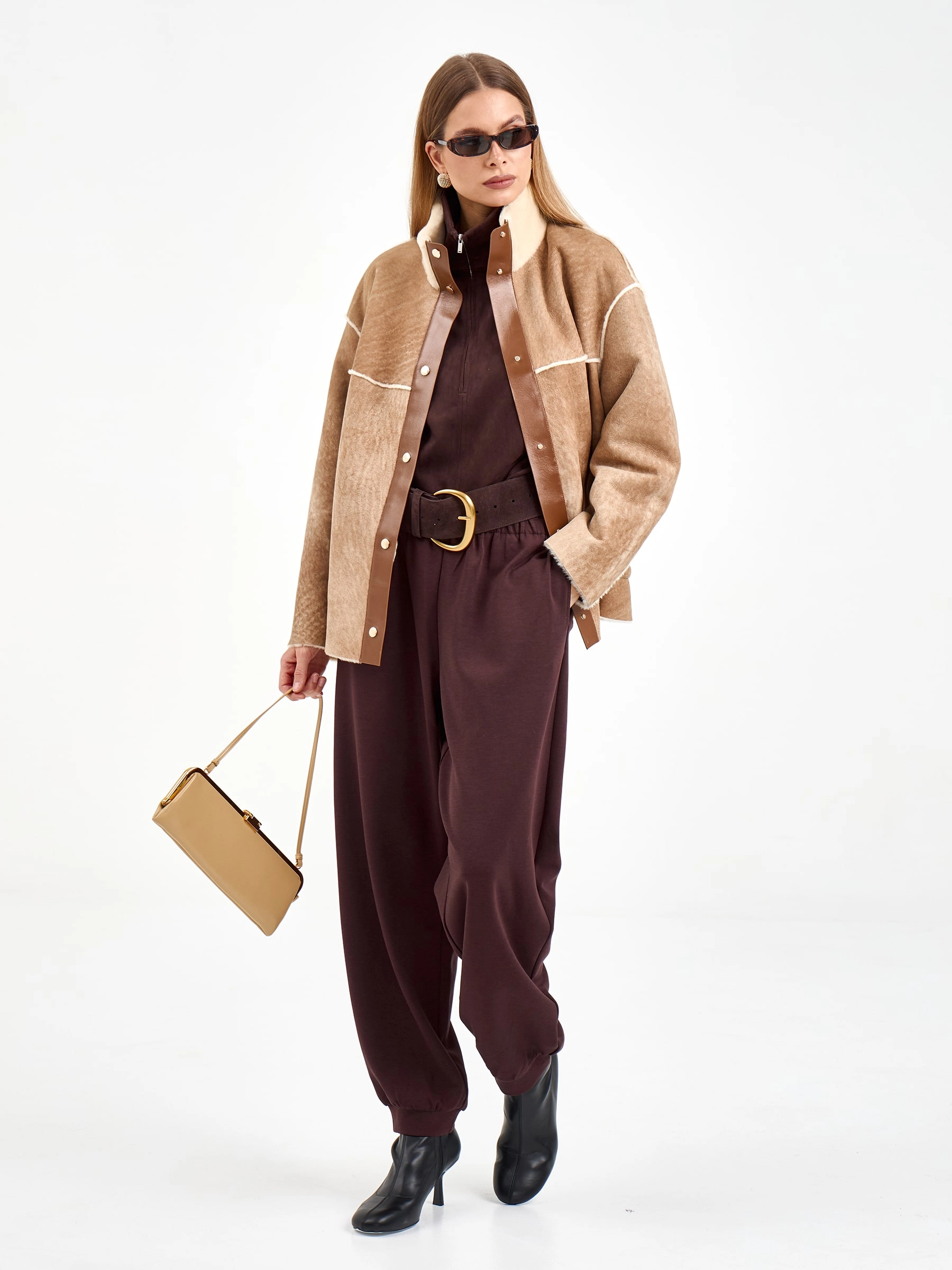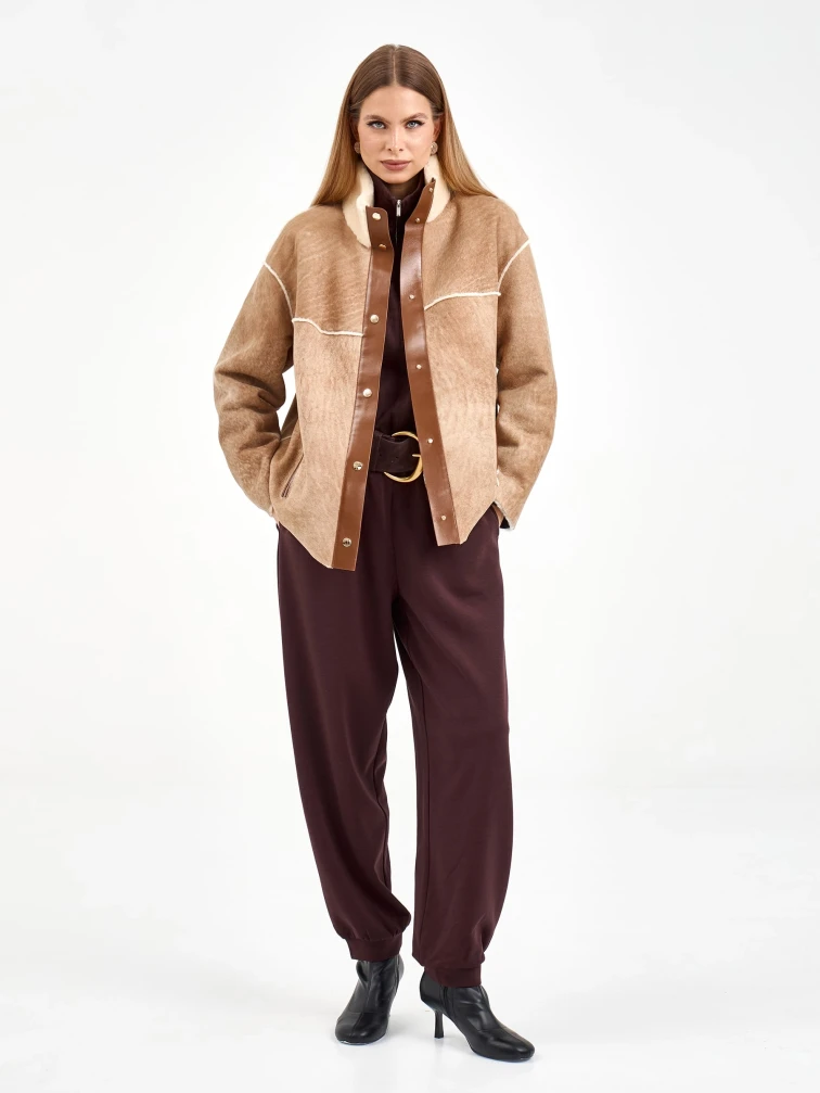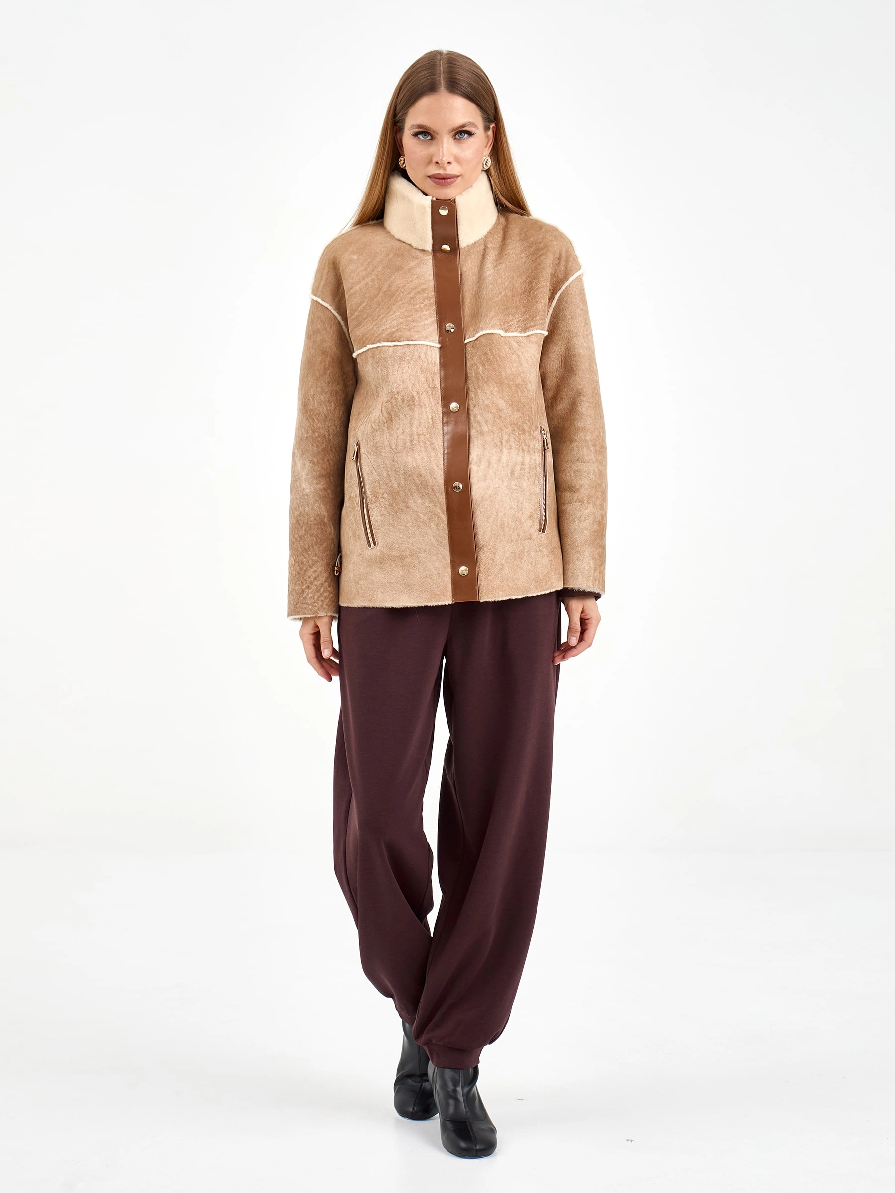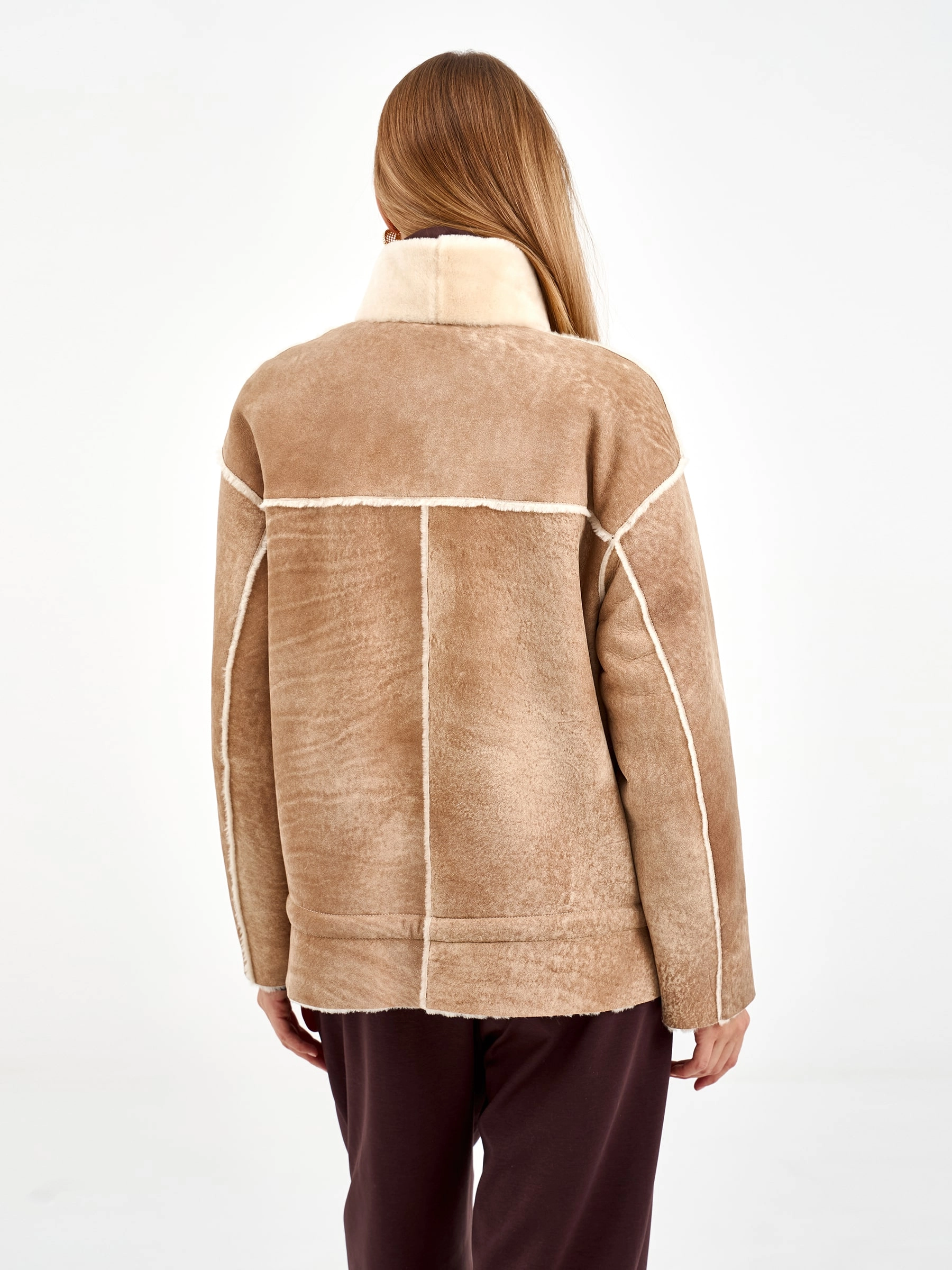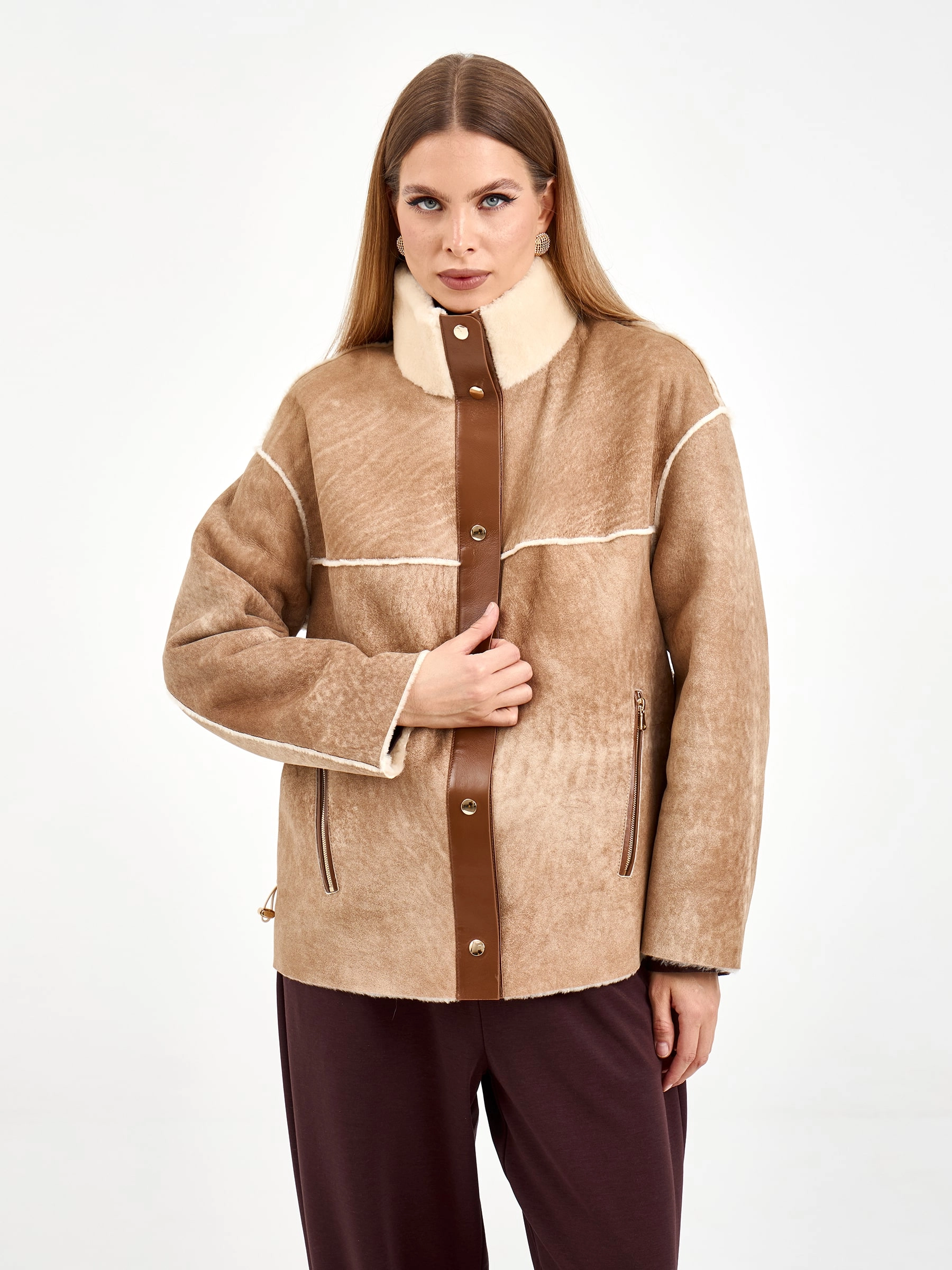 Короткая дубленка без капюшона из мягчайшей овчины мерино свободного кроя. Модель длиной 65 см с воротником-стойкой и спущенным рукавом демонстрирует утонченную эстетику: декоративные швы вывернуты мехом наружу, а карманы и планка на кнопках оформлены кожаными кантами с золотистой фурнитурой. Стилисты рекомендуют сочетать с водолазками, кожаными брюками и челси для создания образа в стиле smart casual — эта дубленка станет идеальным выбором для городских прогулок, добавляя образу непринужденной элегантности и уюта.