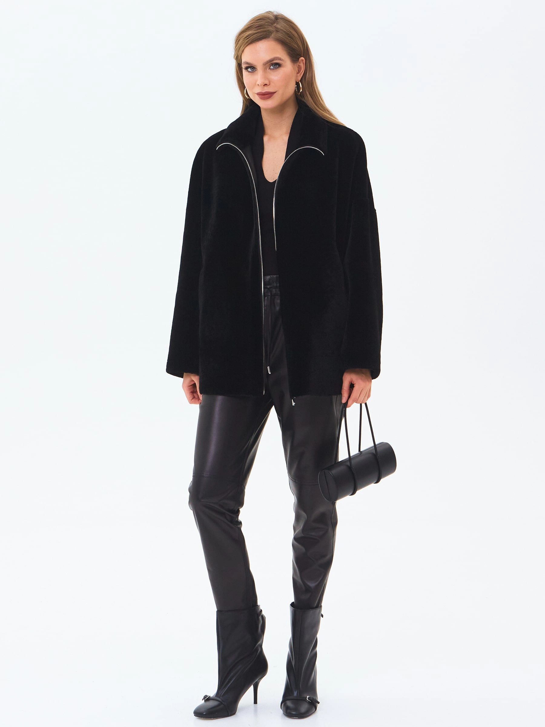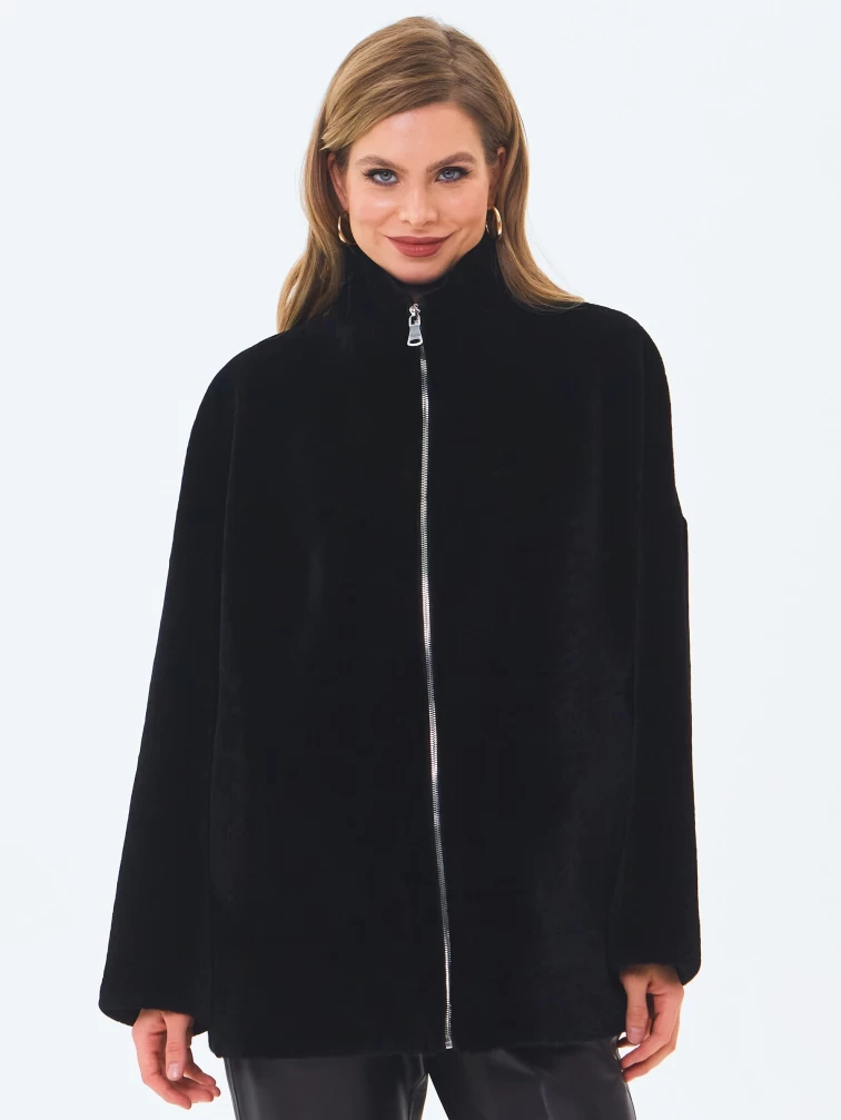Короткая женская дубленка из астрагана на молнии 2065, черная, размер 48, артикул 64680