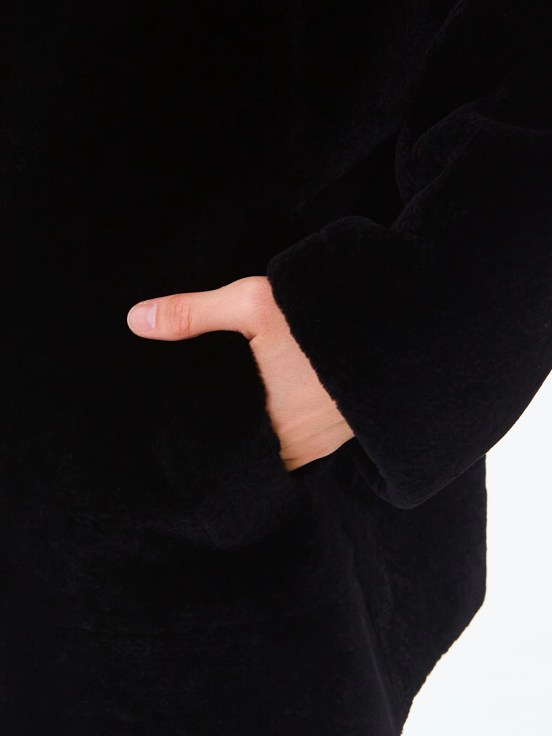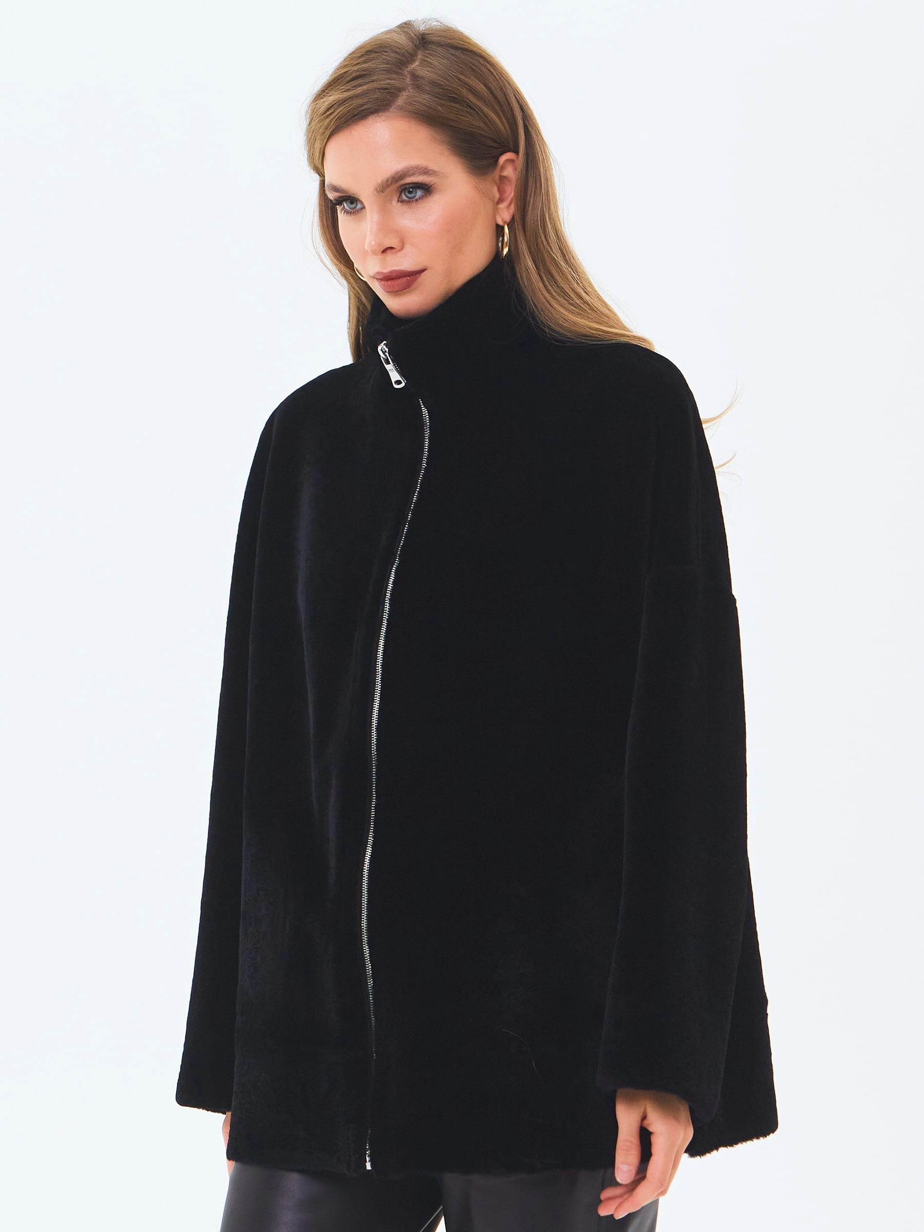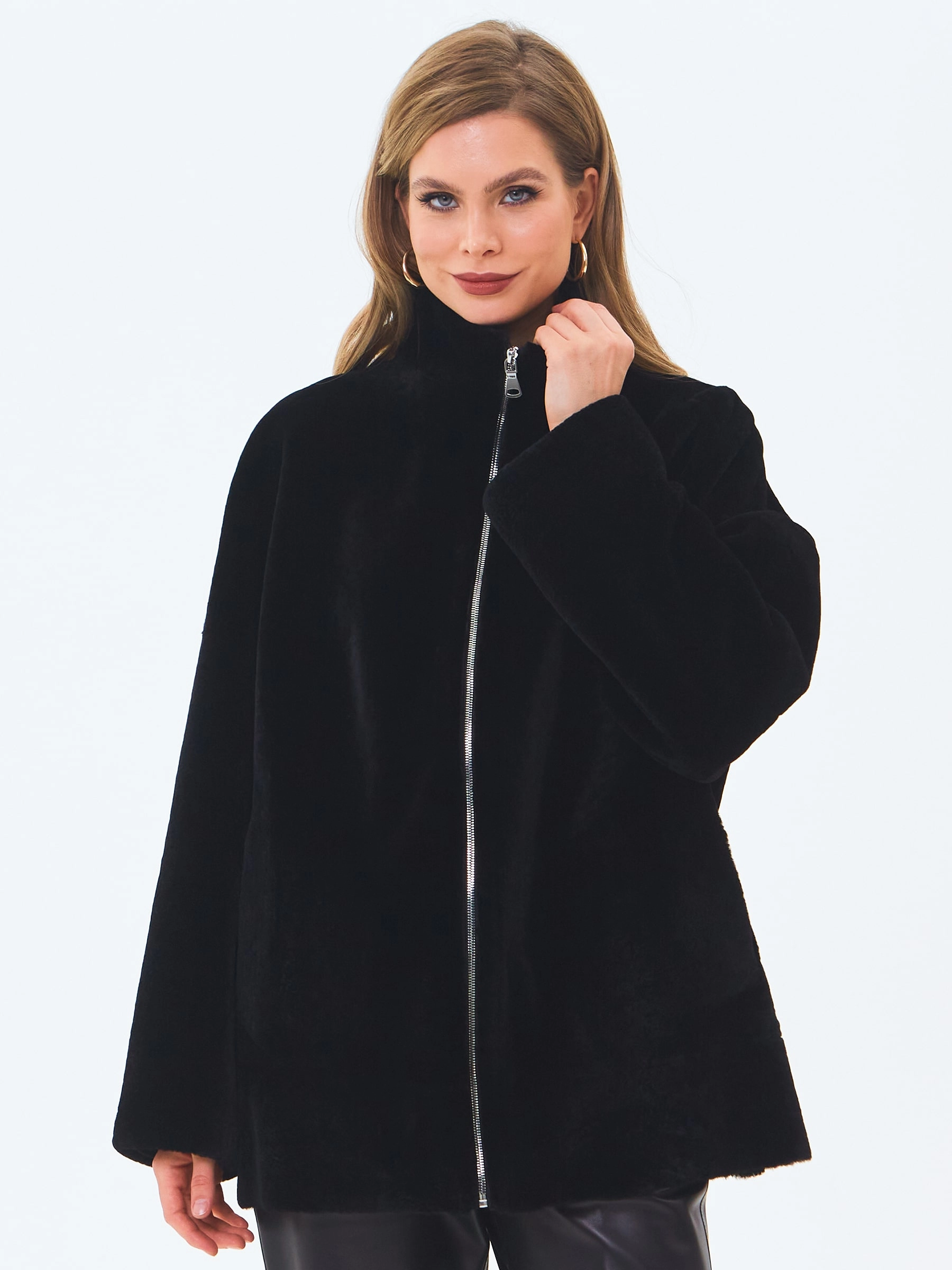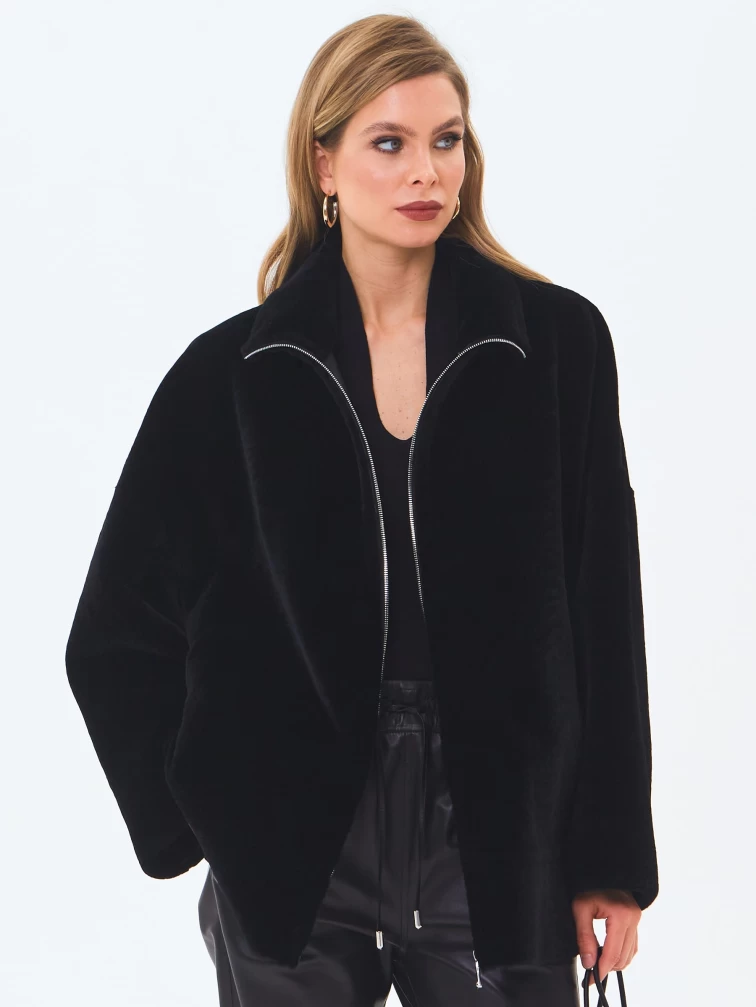 Для пошива короткой дубленки использовали мех овчины астраган тонкой выделки. Изделие свободного кроя комфортно садится по фигуре не ограничивая движения. Модель с воротником- стойка и двумя врезными карманами застегивается крупной молнией.