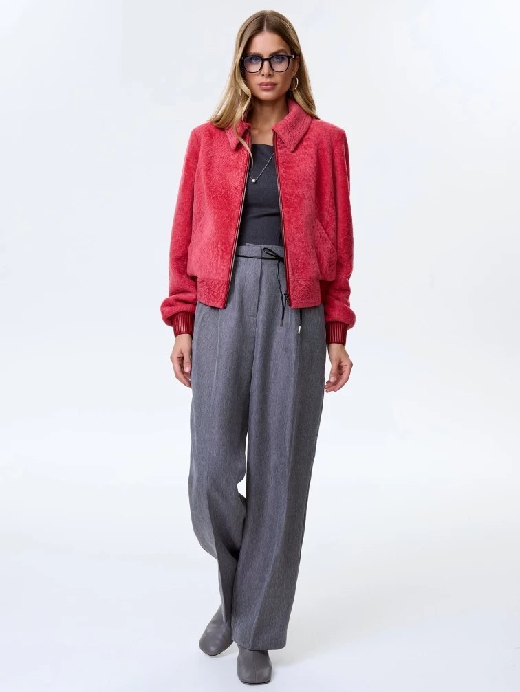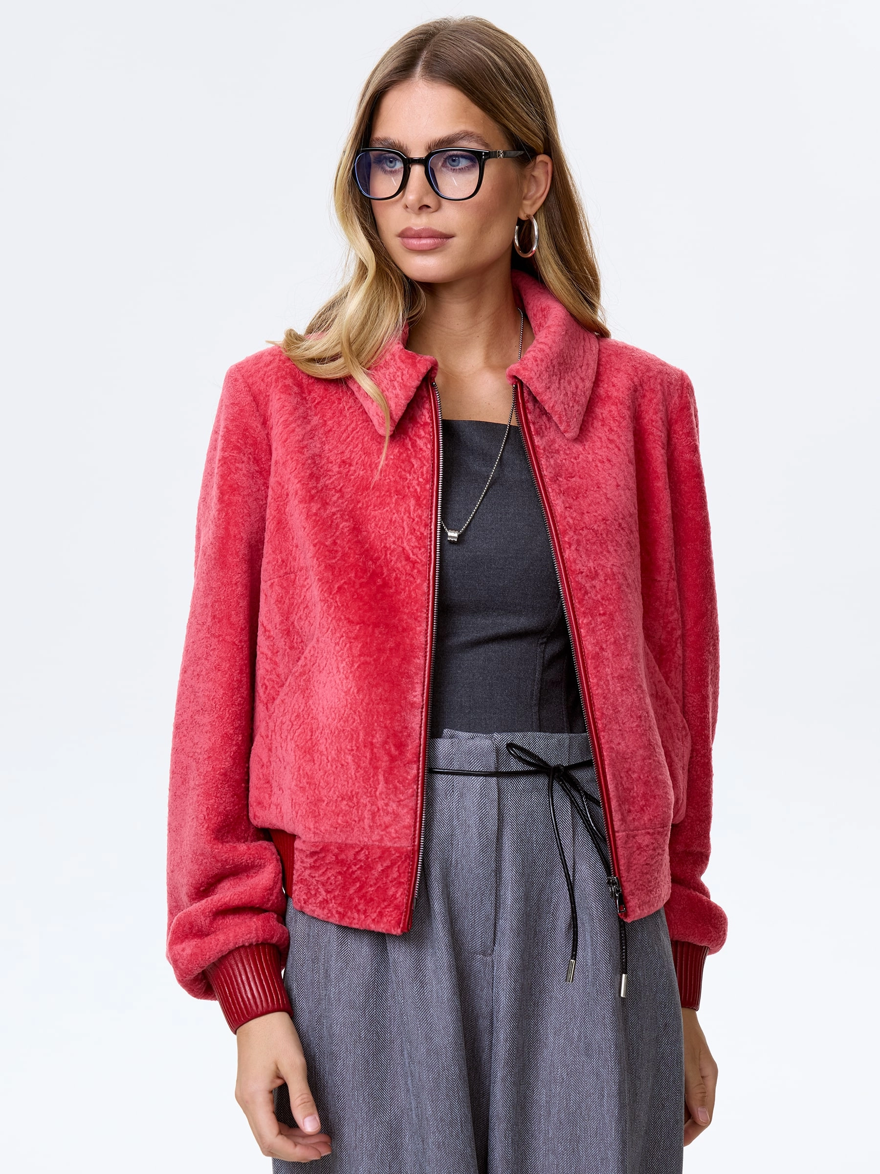 Короткая женская дубленка бомбер из астрагана 56мех, розовая, размер 46, артикул 64230