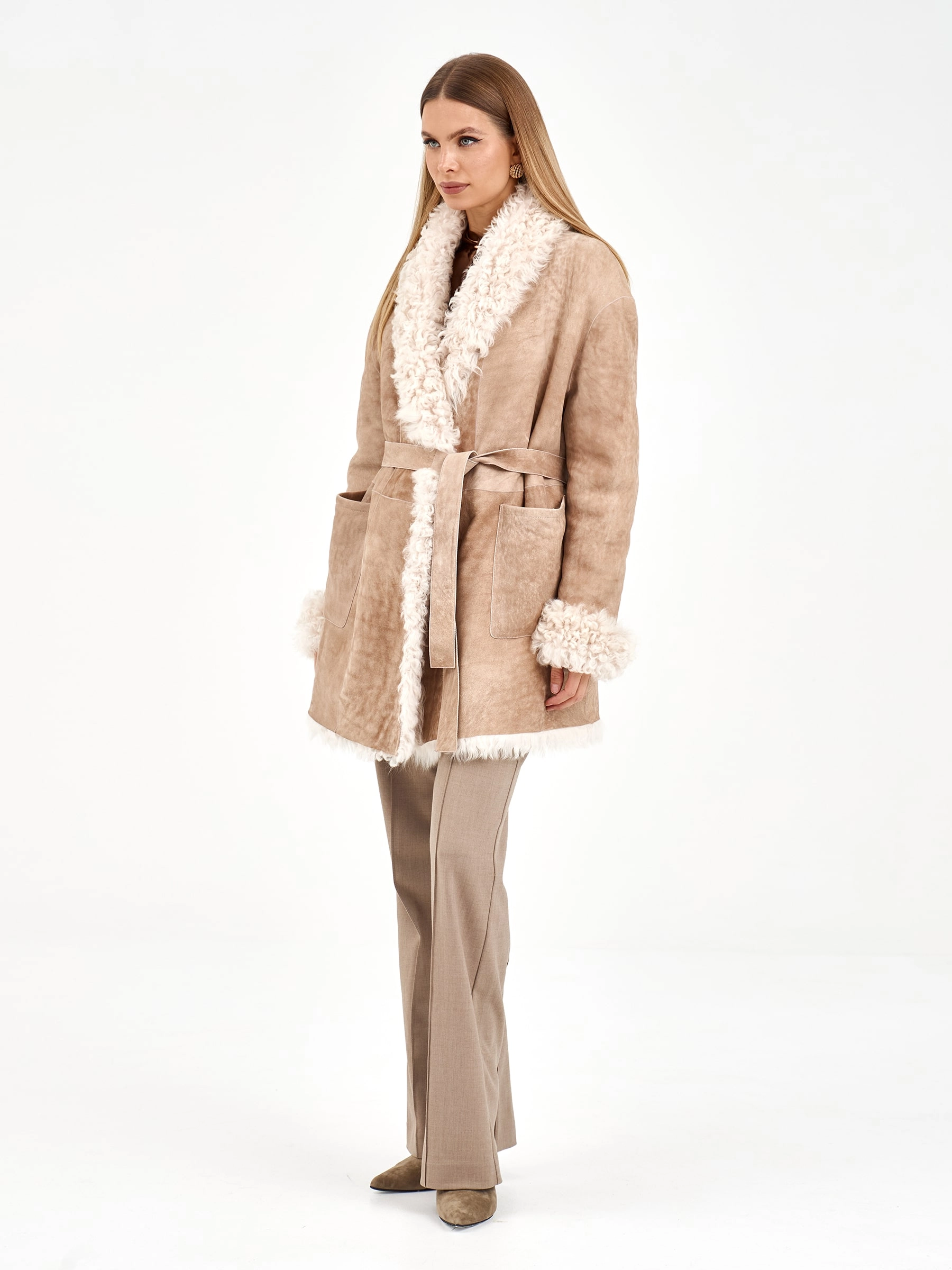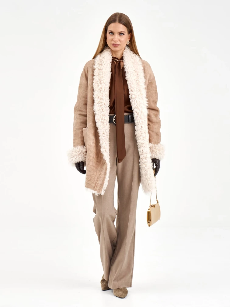 Товар короткая женская дубленка из тиградо 2078, бежевая, размер 44, артикул 65270. Длина изделия 80 см.