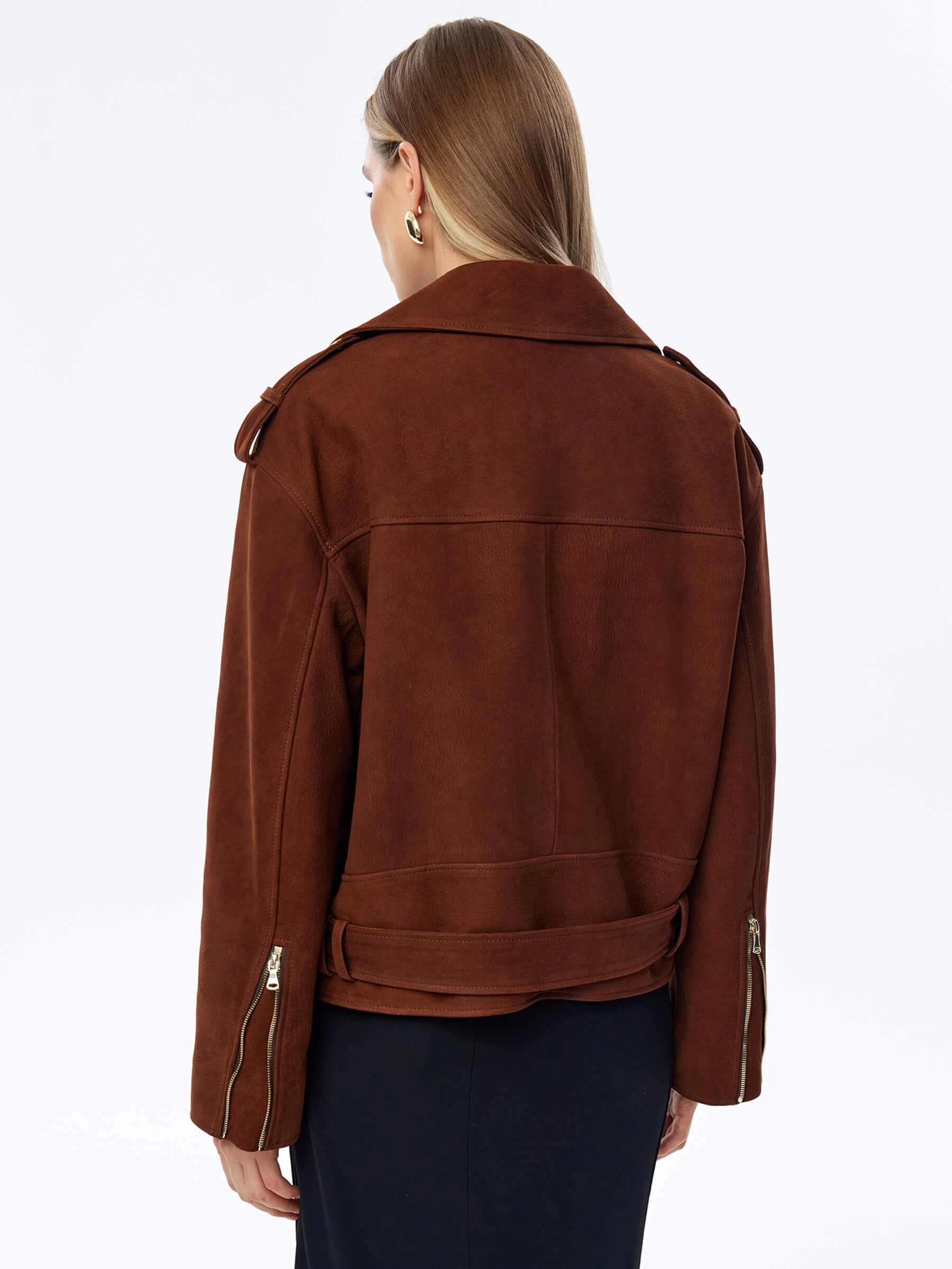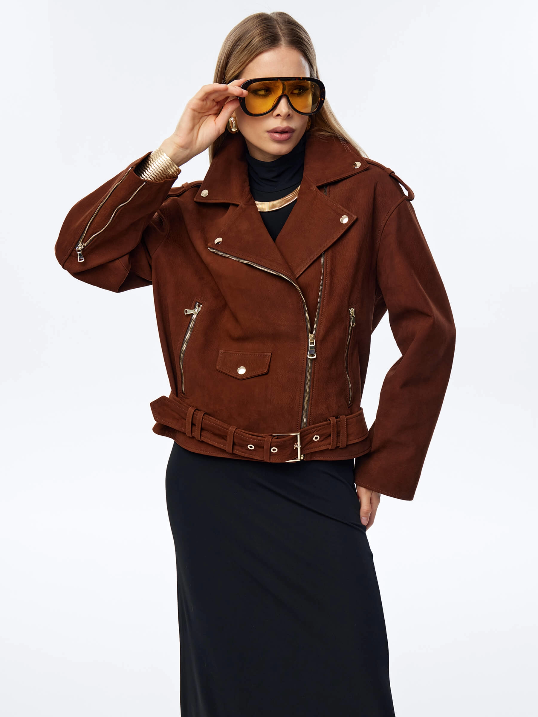 Для пошива укороченной косухи с погонамии и регулируемым поясом с пряжкой, использовали фактурную матовую кожу премиум класса. Модель свободного силуэта, со спущенной линией плеч не сковывает движения, комфортно садится по фигуре. Изделие с широкими лацканами и множеством карманов, подчеркнули серебристыми молниями.