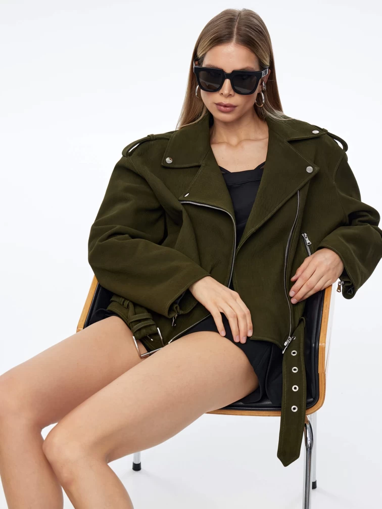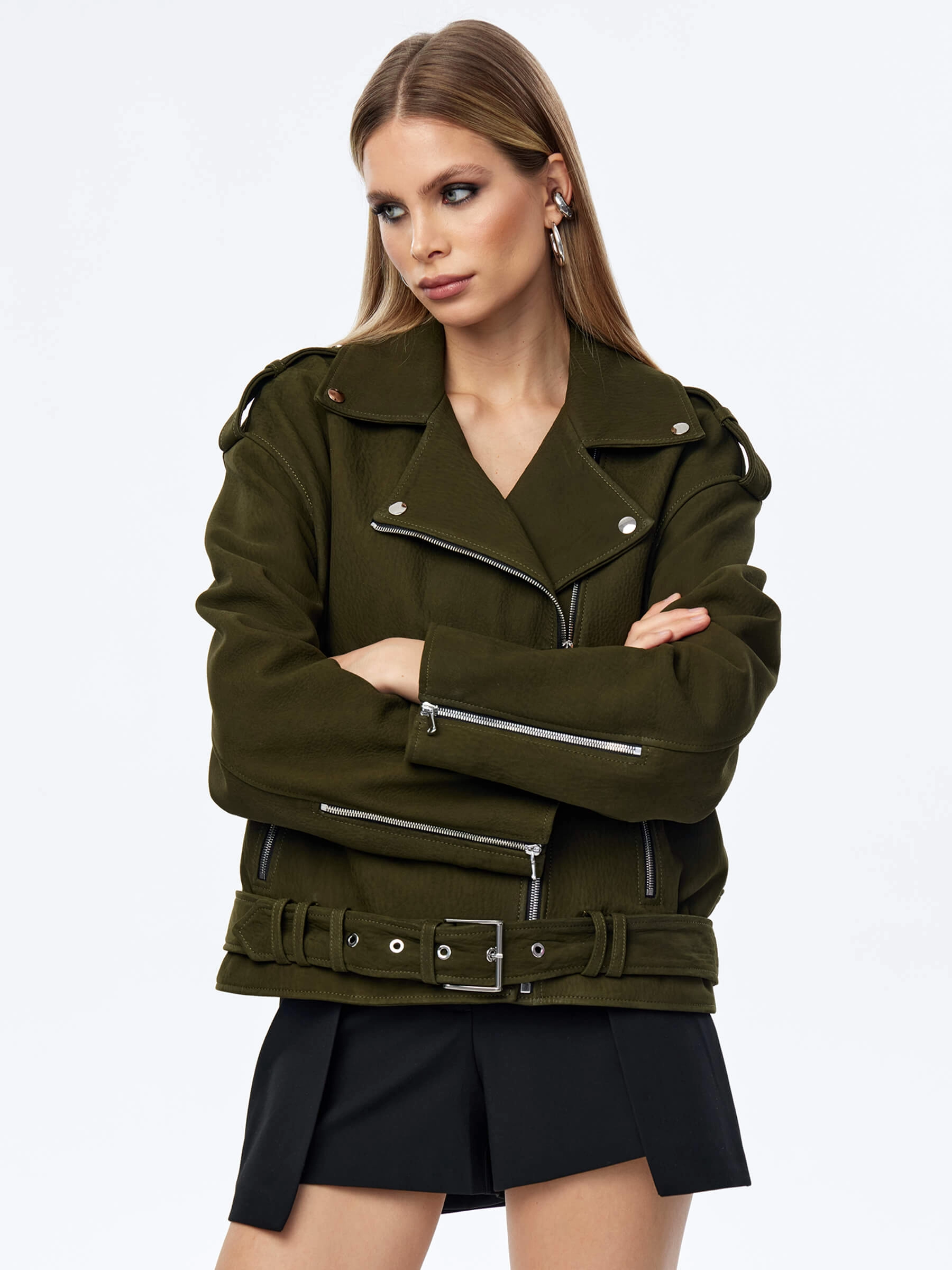 Товар короткая женская кожаная куртка косуха с поясом премиум класса 3052, хаки, размер 44, артикул 23970 выполнен из натуральной кожи. Рассчитан на сезон: весна-осень. Длина изделия 60 см, силуэт свободный.