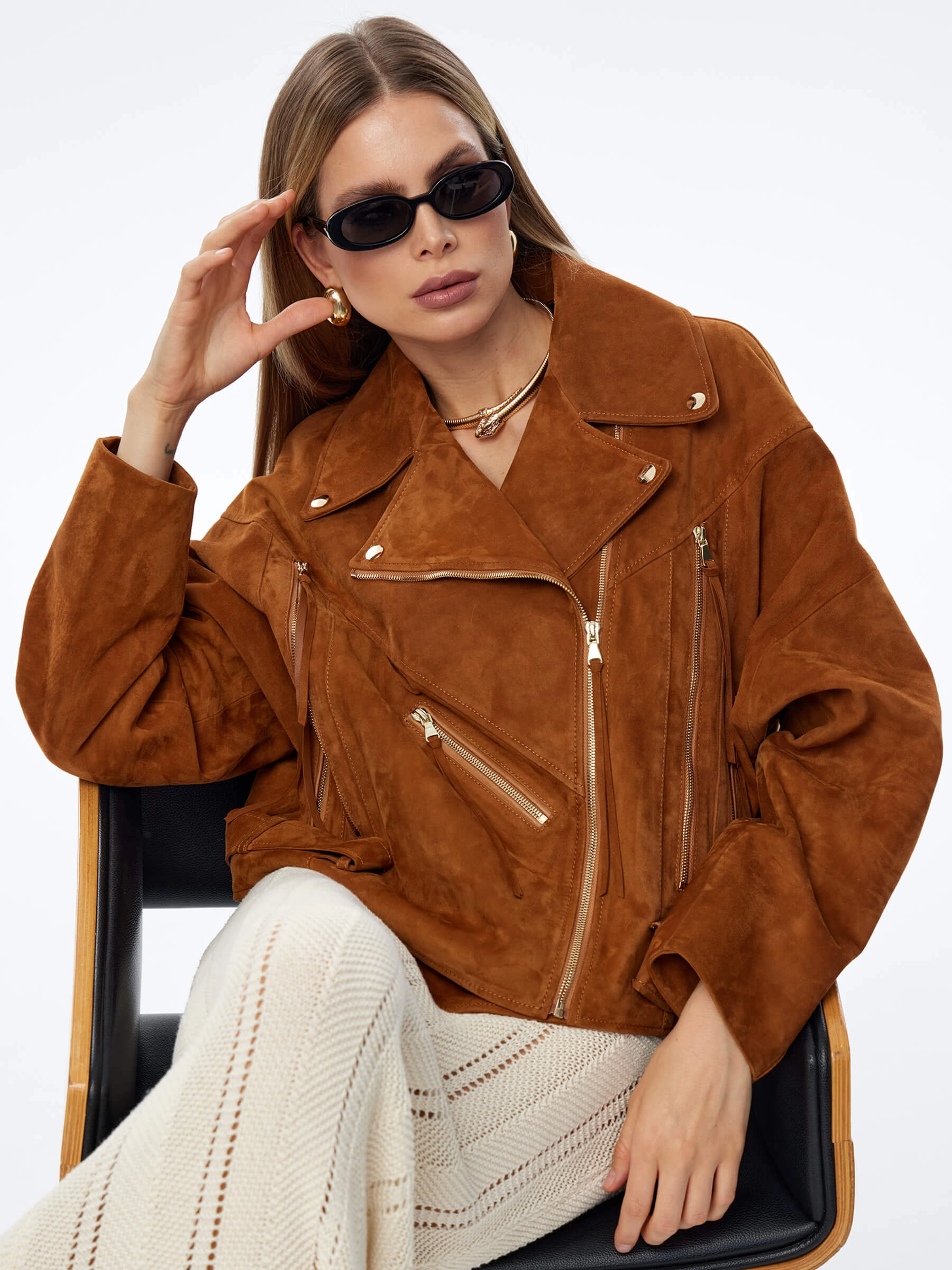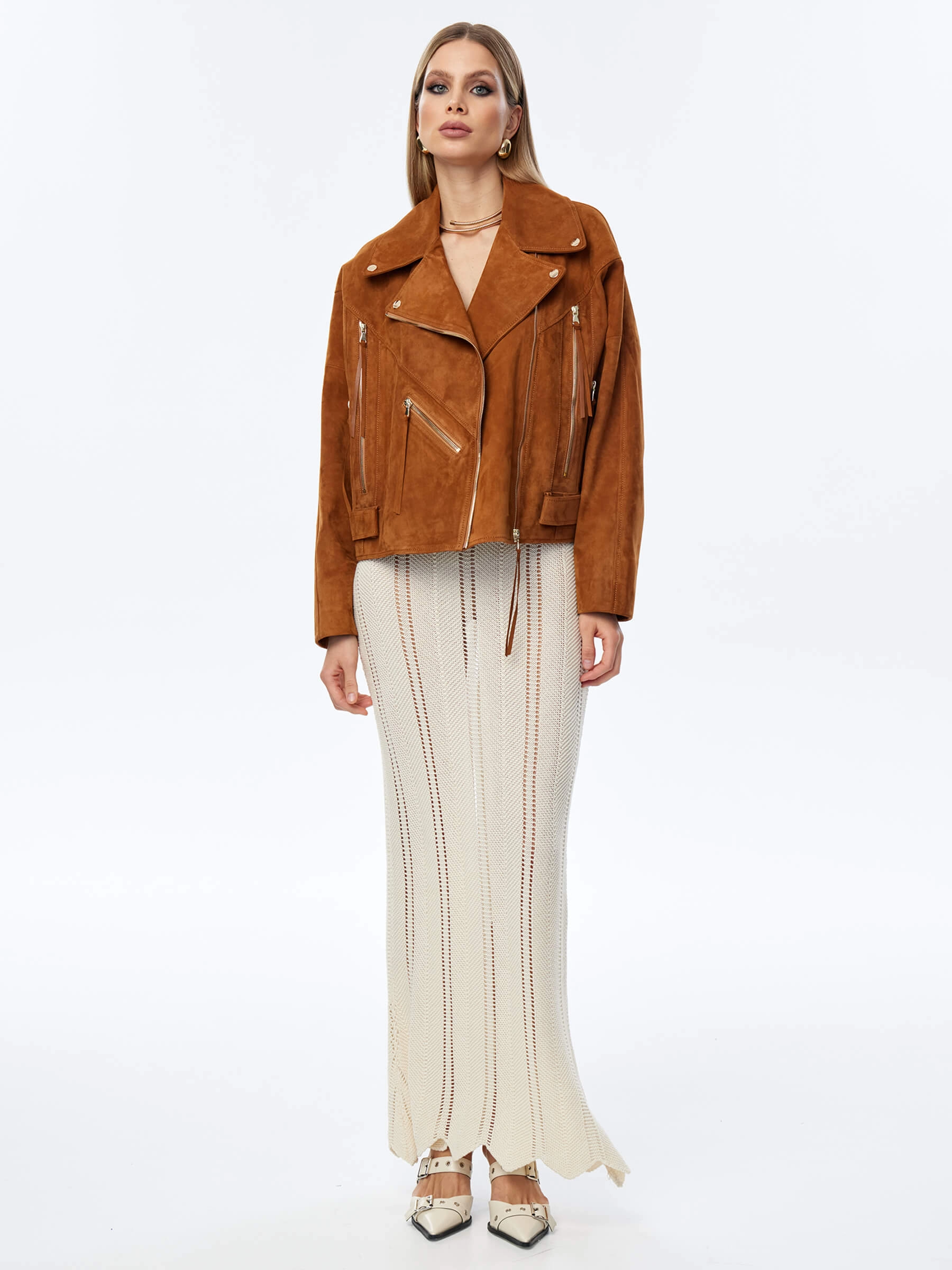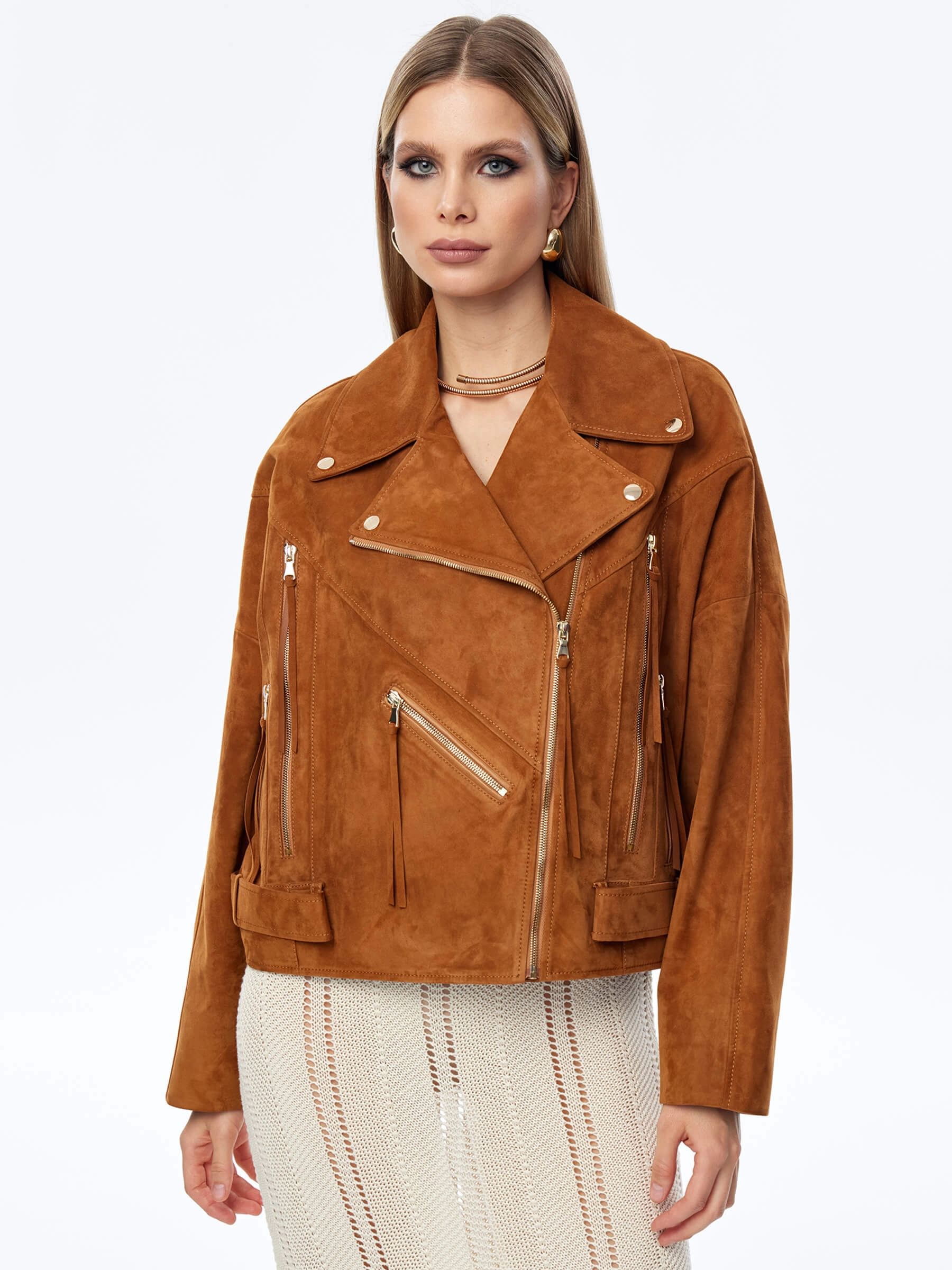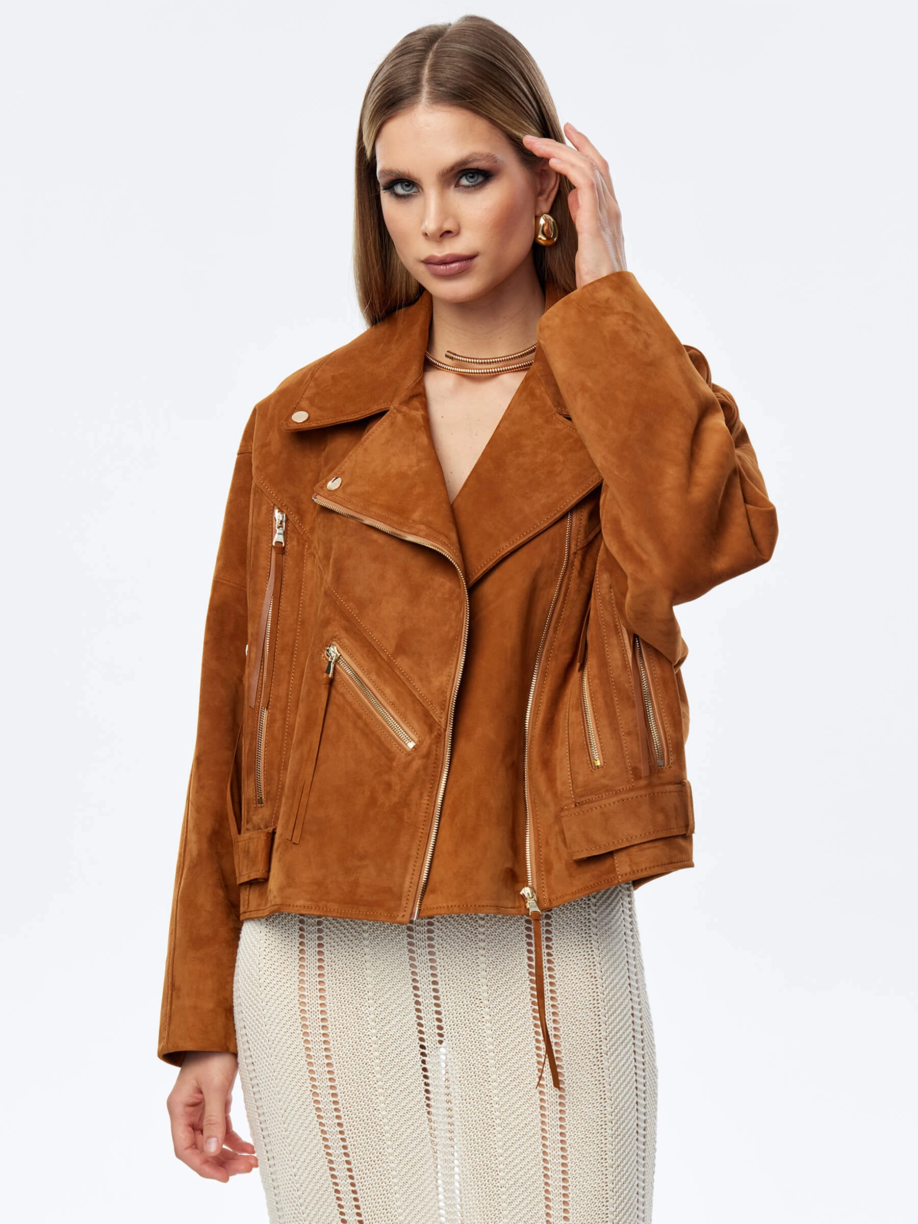 Короткая женская замшевая куртка косуха премиум класса 3051з, виски, размер 46, артикул 23920
