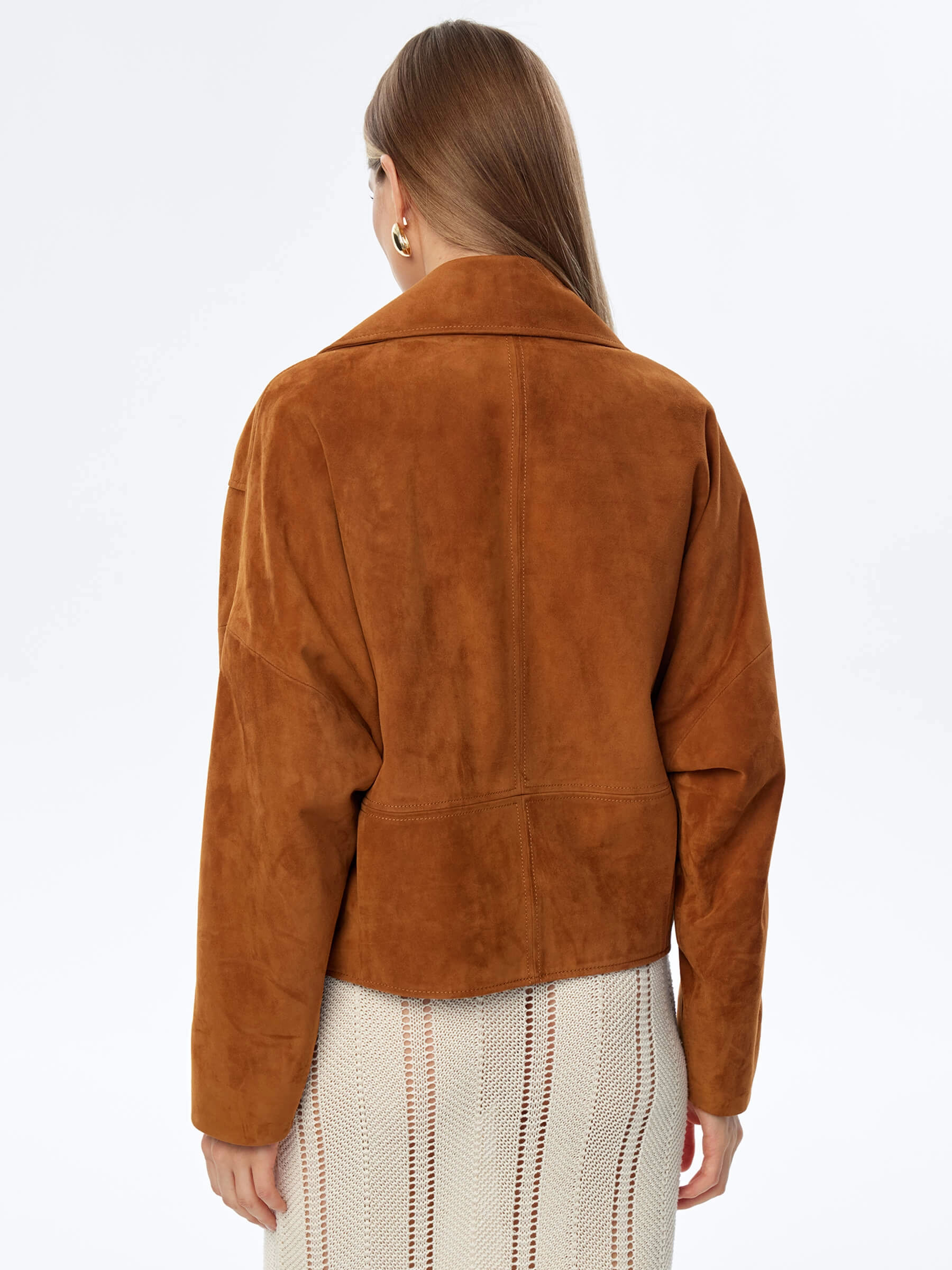 Укороченную косуху со спущенной линией плеч выполнили из тонкой бархатистой замши. Модель свободного кроя комфортно садится по фигуре, не сковывает движения. Дополнением к изделию с множеством карманов и регулируемыми боковыми патами послужили кнопки на широких лацканах.